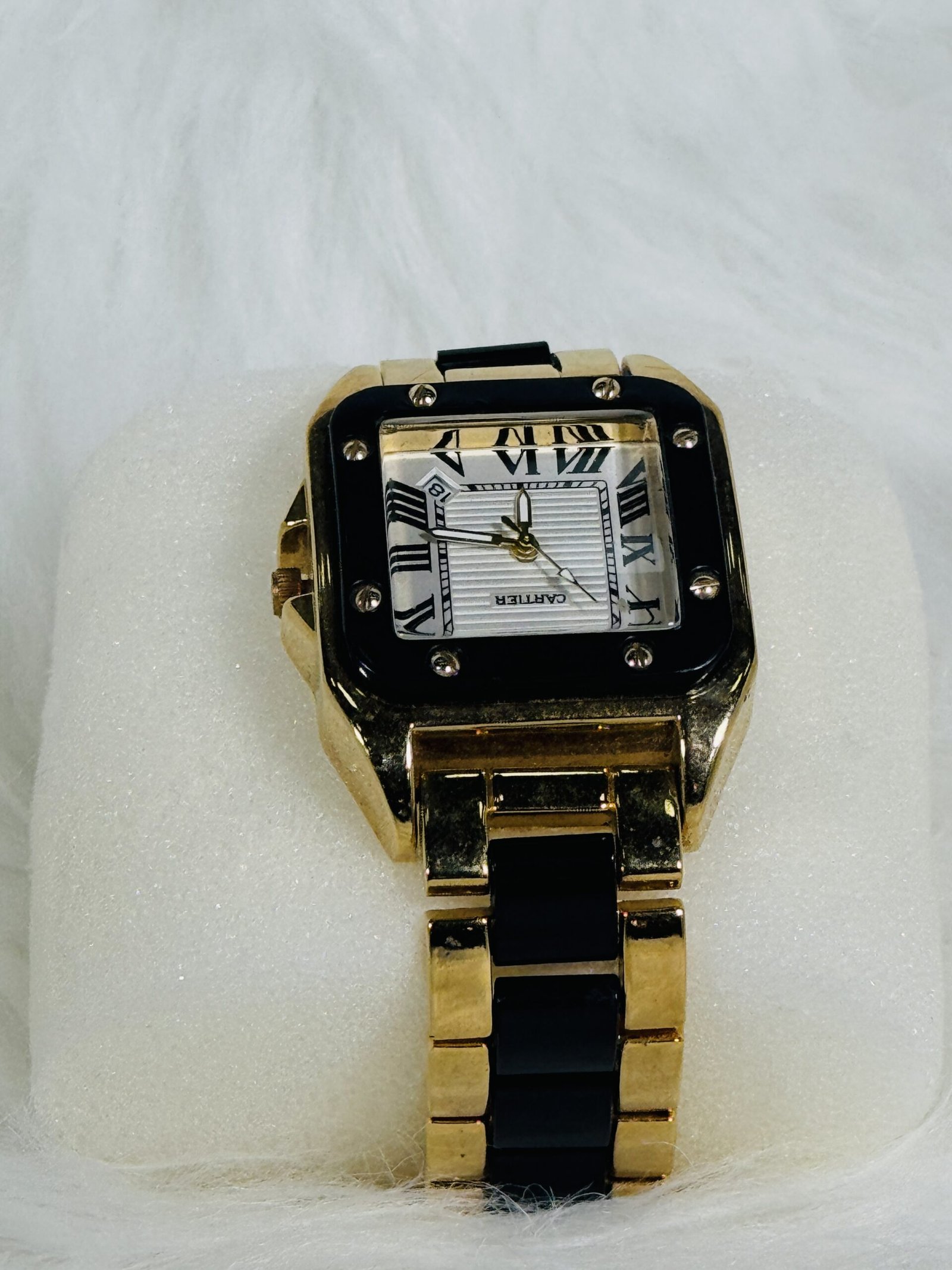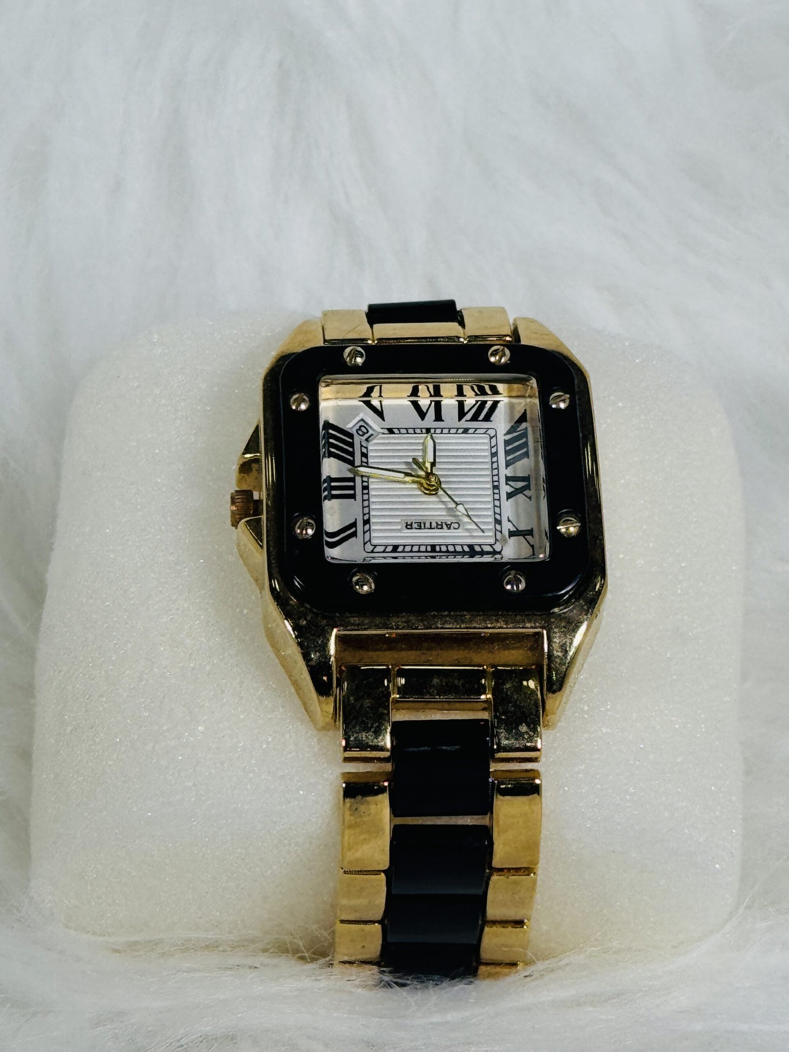 Whether shopping for yourself or gifting to a loved one, this black and gold Cartier wristwatch offers unparalleled prestige and sophistication. Its minimalist, yet distinguished design guarantees it will blend seamlessly with a variety of outfits and occasions. Make a bold statement of class and elegance with this exquisite timepiece—because true style is always in the details.
