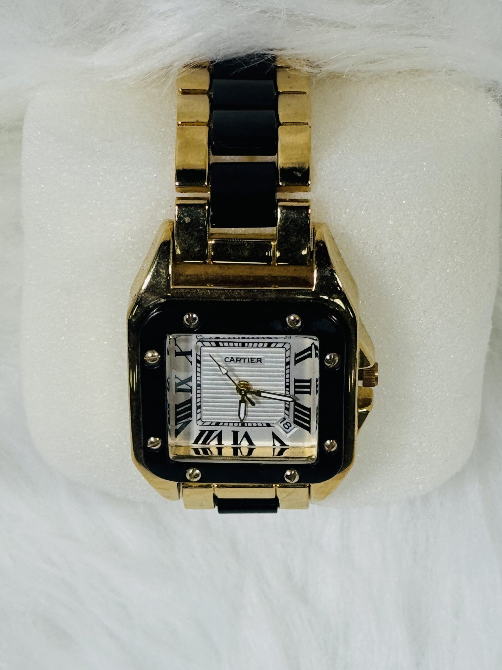 Experience the perfect blend of bold elegance and timeless craftsmanship with the big black and golden chain Cartier wristwatch. Designed with a sleek black and gold chain band, this watch embodies sophistication effortlessly. The white rectangular screen adds a contemporary touch, complementing its luxurious design while ensuring optimal visibility for the wearer. Whether you’re attending a formal event or making a statement in casual settings, this wristwatch is your ultimate companion.