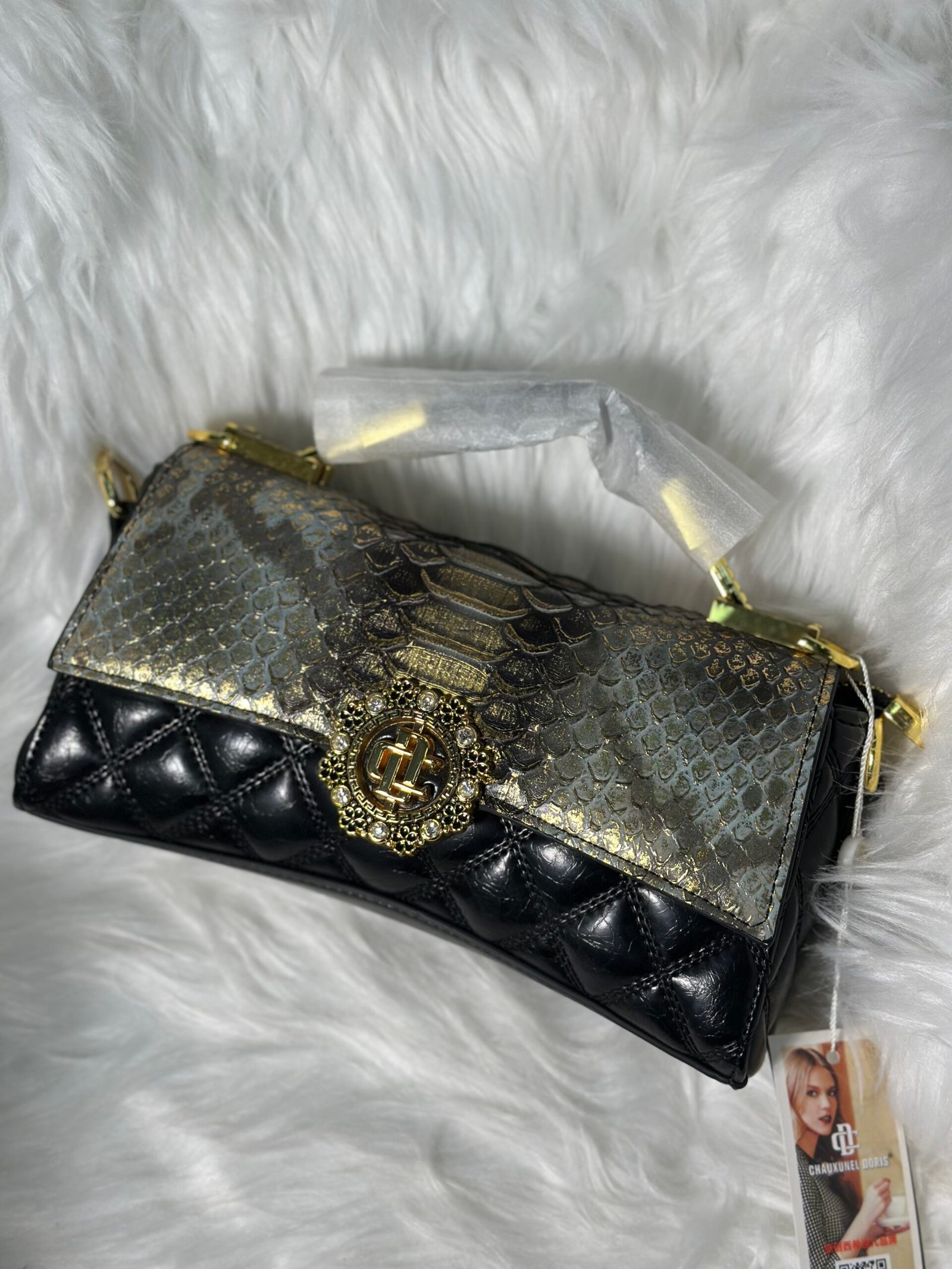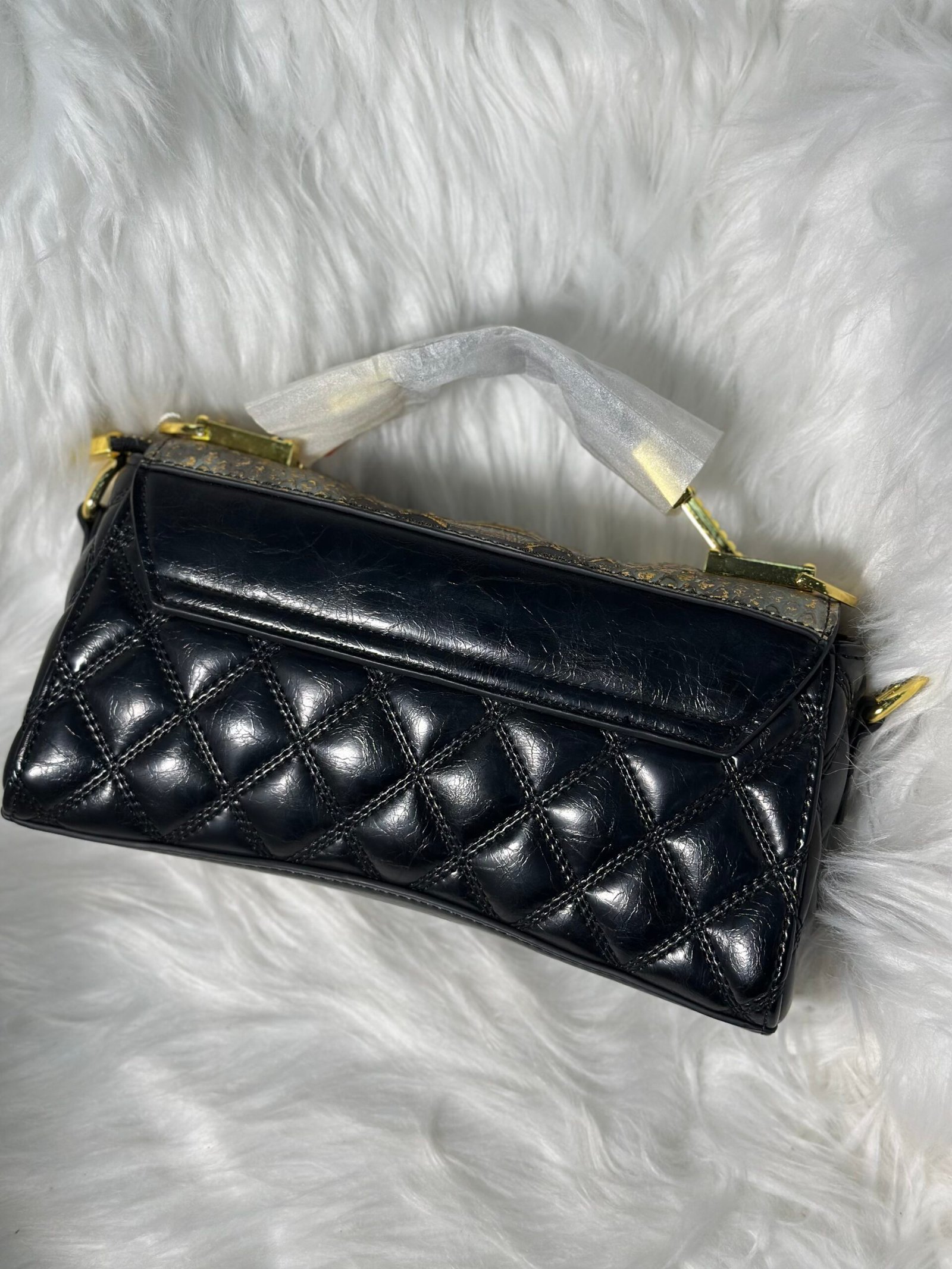 Made with premium materials, this bag boasts durability and sophistication. The sleek black base is beautifully complemented by the gold accents, making it a standout accessory in any wardrobe. Designed for convenience, it features spacious compartments to keep your essentials organized and easily accessible.