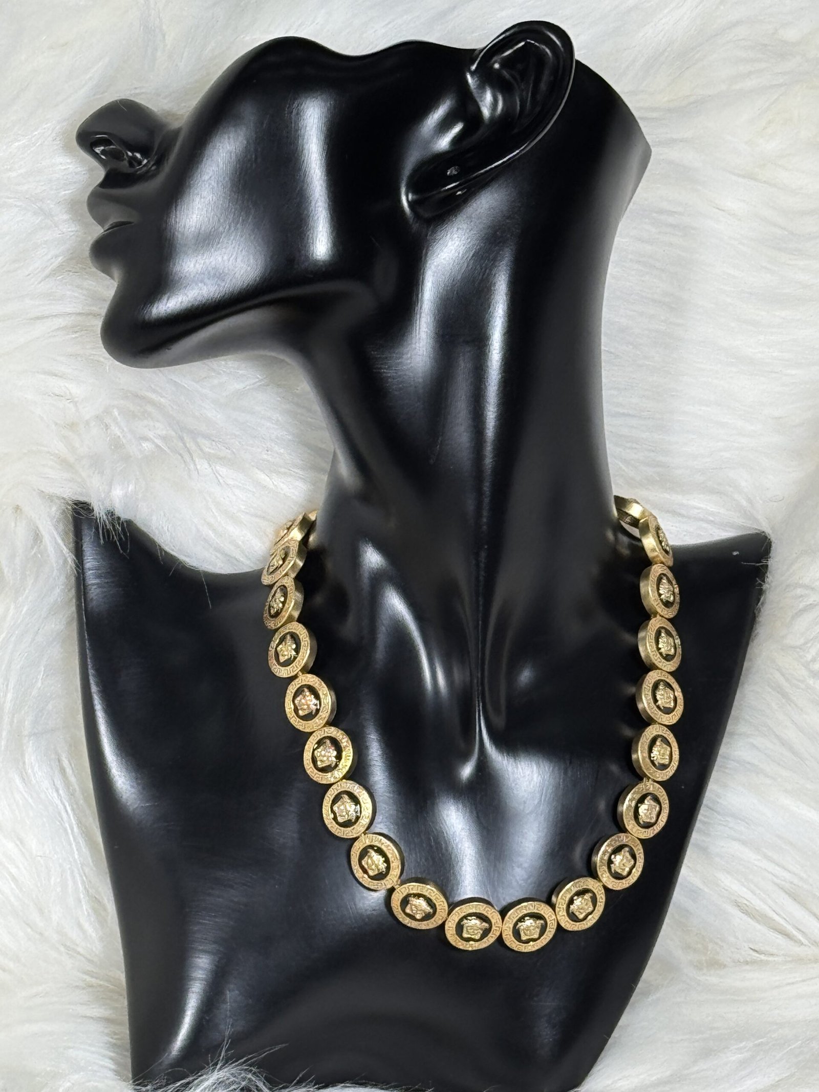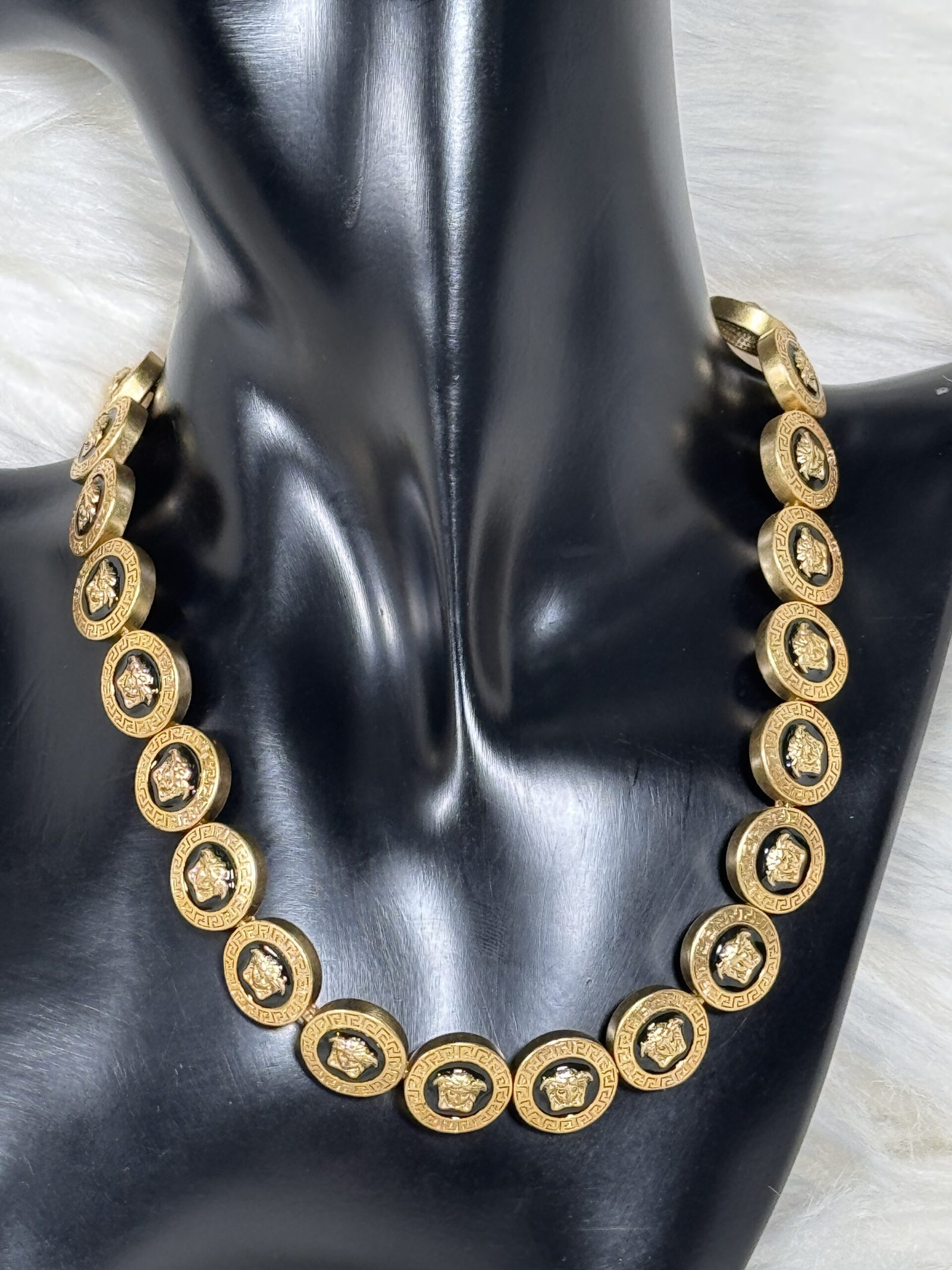 The Black and Golden Versace Necklace is the epitome of refined elegance and bold fashion. Crafted with meticulous attention to detail, this necklace showcases a striking harmony between deep, rich black accents and radiant golden tones. Whether paired with formal attire or evening wear, this necklace will instantly elevate your look and become the centerpiece of your outfit.