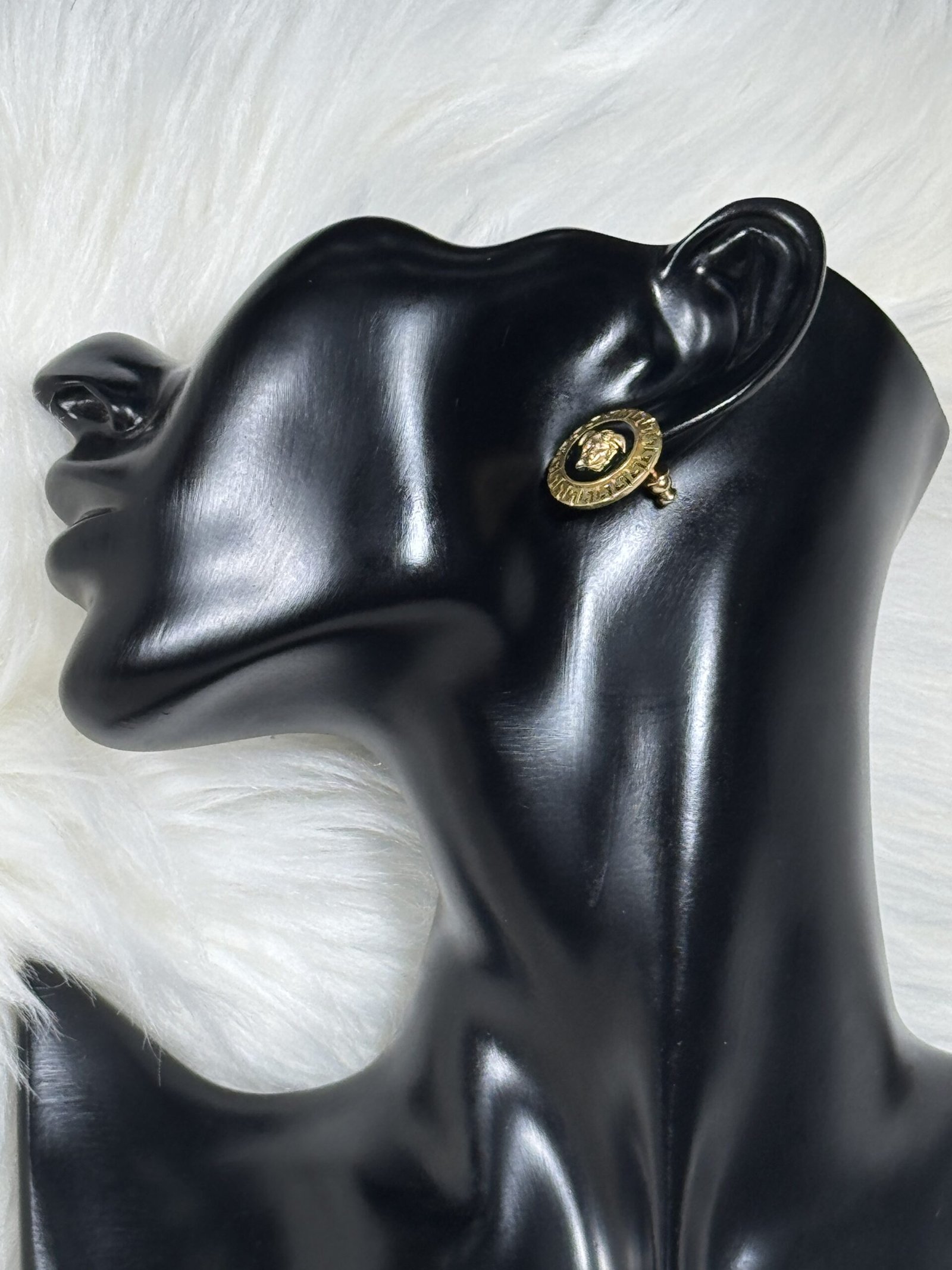 Elevate your accessory game with the striking Black Versace Earrings, featuring luxurious gold linings that exude timeless elegance. Designed for those who appreciate refined style, these earrings seamlessly blend contemporary design with classic sophistication, making them a perfect complement for any outfit or occasion.