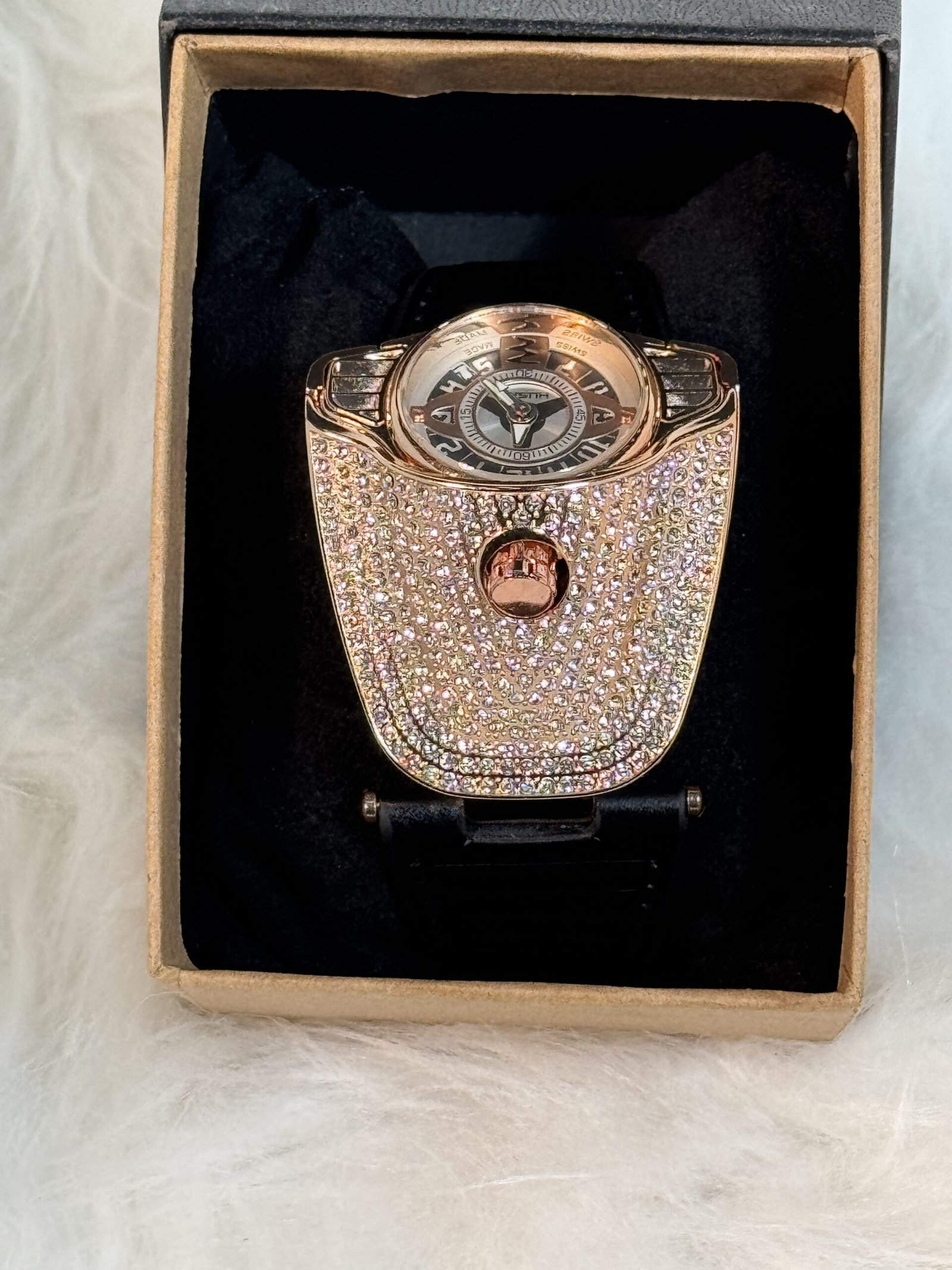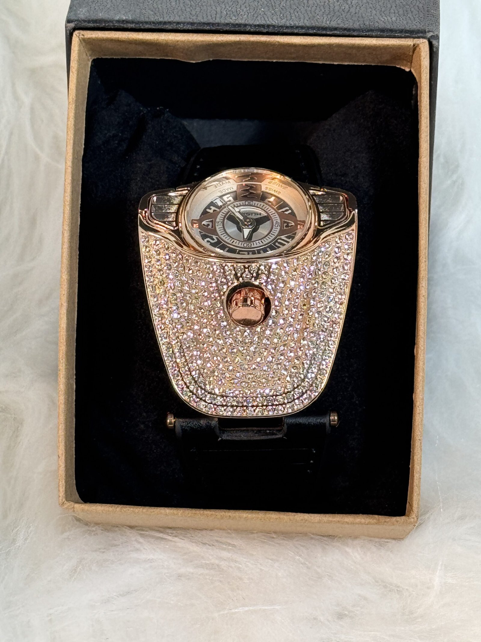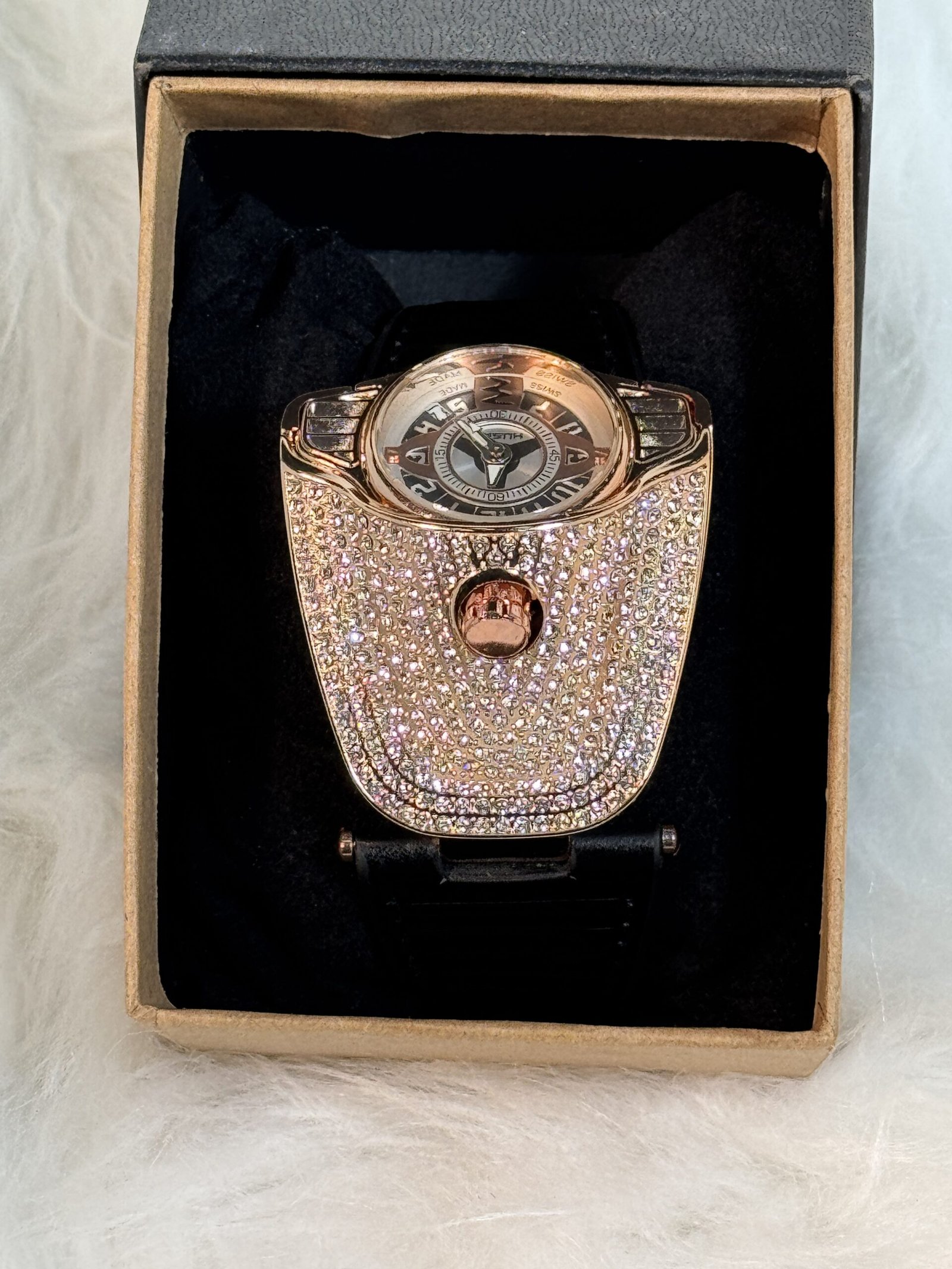 This wristwatch is more than a tool to check the time—it’s a piece of wearable art. The bold, heavy-embellished Car-like rose gold sides add an air of luxury, making it a standout accessory for any occasion. The rose gold accents contrast beautifully with the sleek black aesthetics, creating a striking appearance that effortlessly elevates your ensemble, whether you’re dressed for business or casual outings.