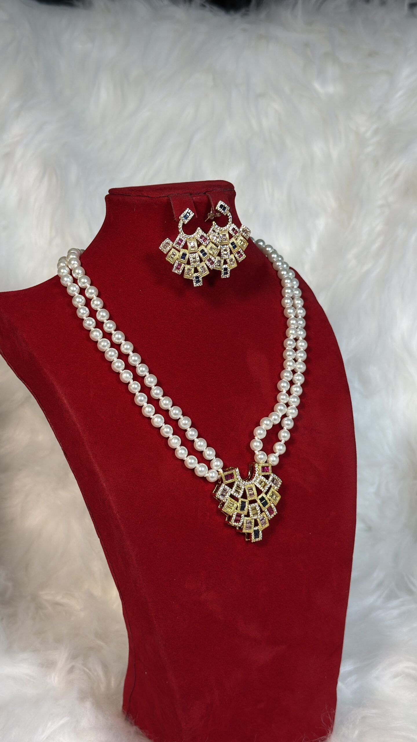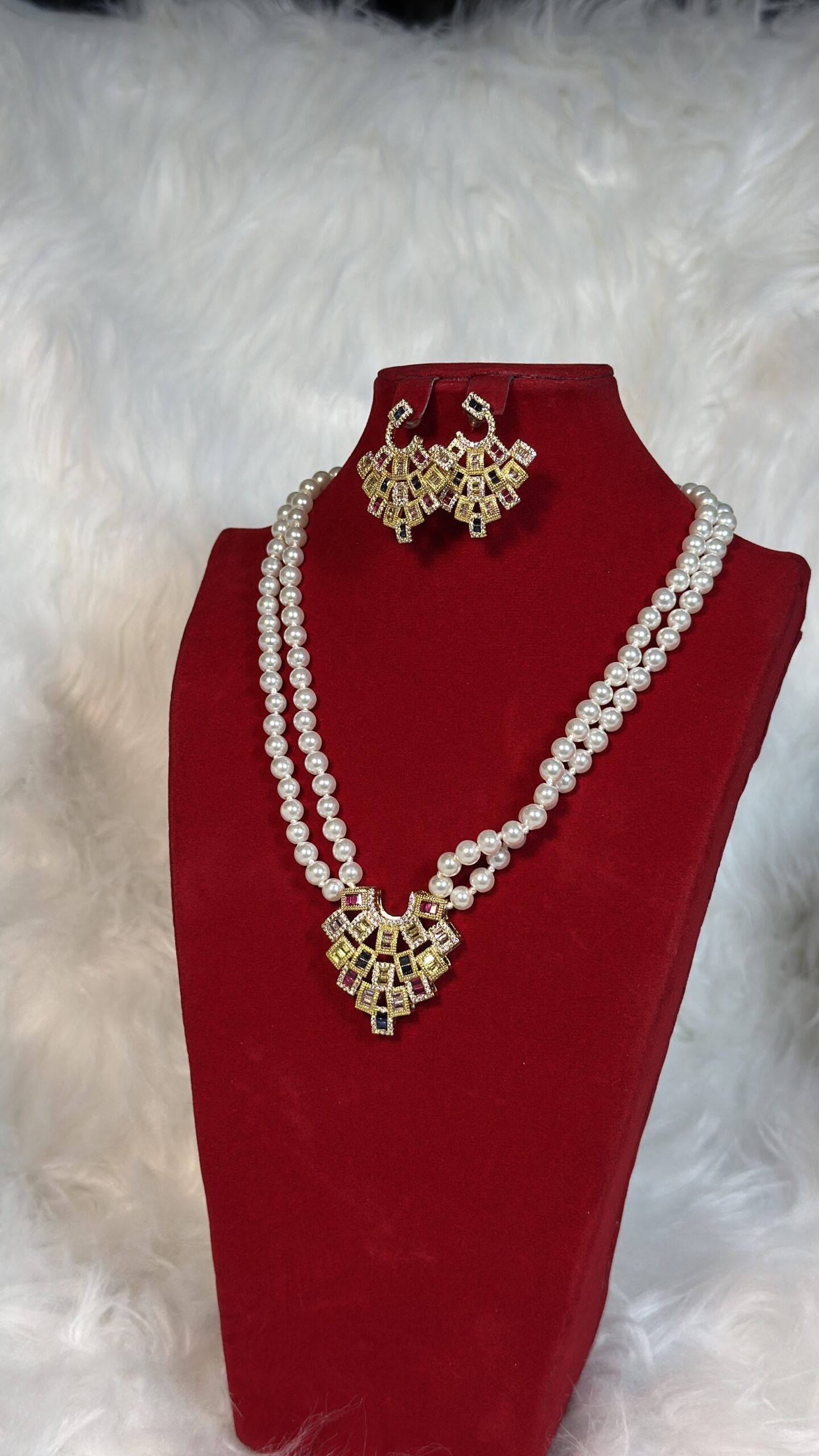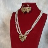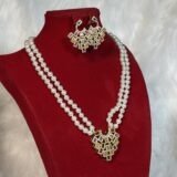 This necklace set is the result of meticulous attention to detail and exceptional craftsmanship. The white beads shimmer with ethereal beauty, while the gold design adds a luxurious touch without overshadowing its delicate charm. Each piece is custom-designed to ensure it complements the bridal ensemble flawlessly, elevating your overall appearance with poise and style.