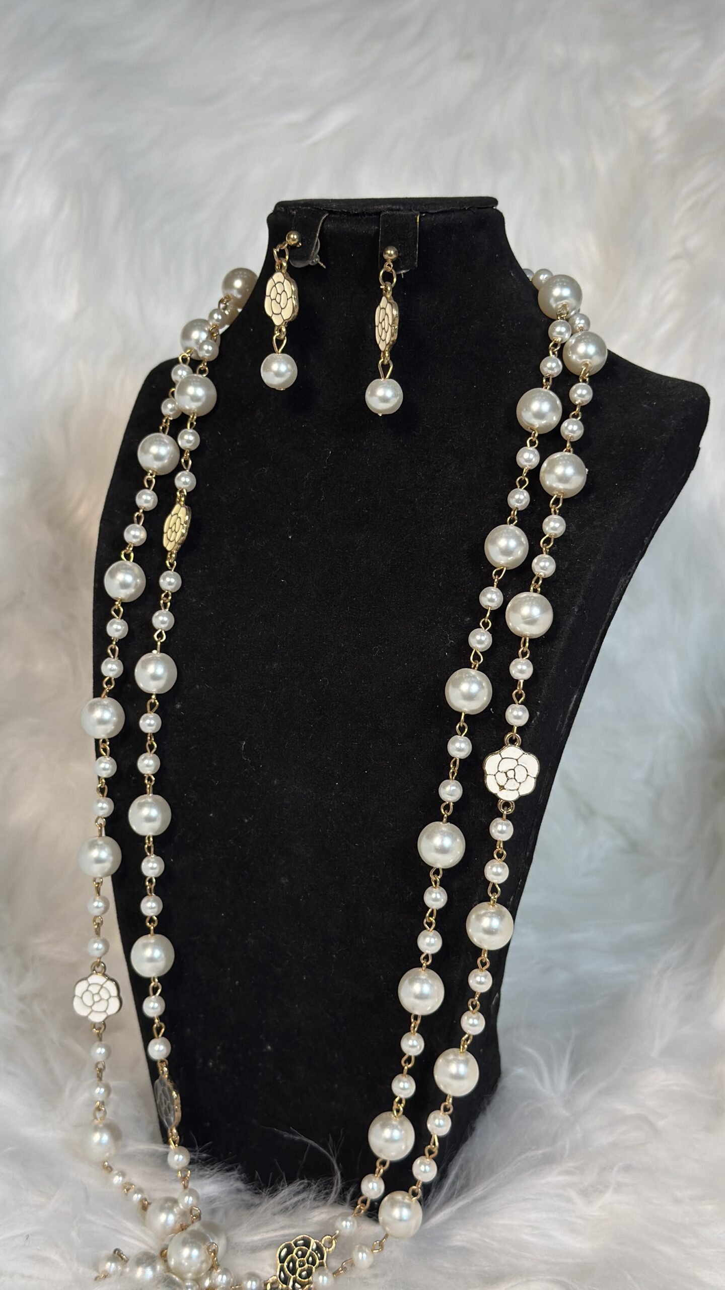 Crafted with meticulous attention to detail, the necklace showcases shimmering white crystals delicately woven into an intricate beadwork pattern. Each piece is made with premium-quality materials to ensure durability and radiance. The earrings complement the necklace with their minimalistic yet striking design, completing the set with effortless charm. With this custom design, you can truly make your wedding attire one-of-a-kind.