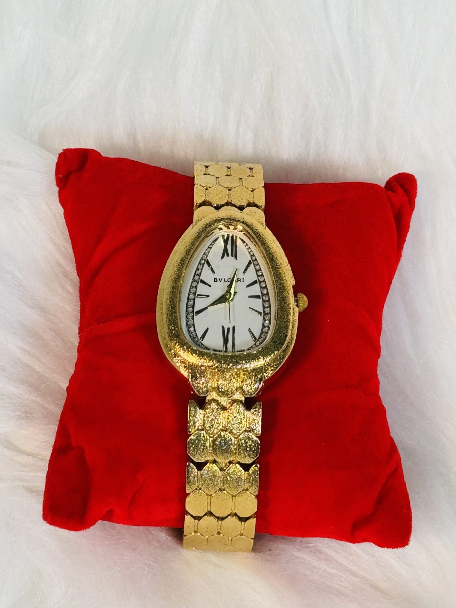 Introducing the Bulgari wristwatch, a masterpiece of timeless elegance designed to complement your refined taste. This exquisite watch features a medium chain golden strap that flows seamlessly, offering unmatched comfort and durability. The white screen with golden inscription adds a touch of understated luxury, while the golden sides and hands highlight its sophisticated aesthetics. Perfect for both formal and casual settings, this wristwatch effortlessly combines practicality and style.