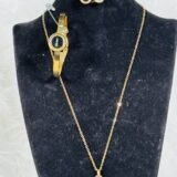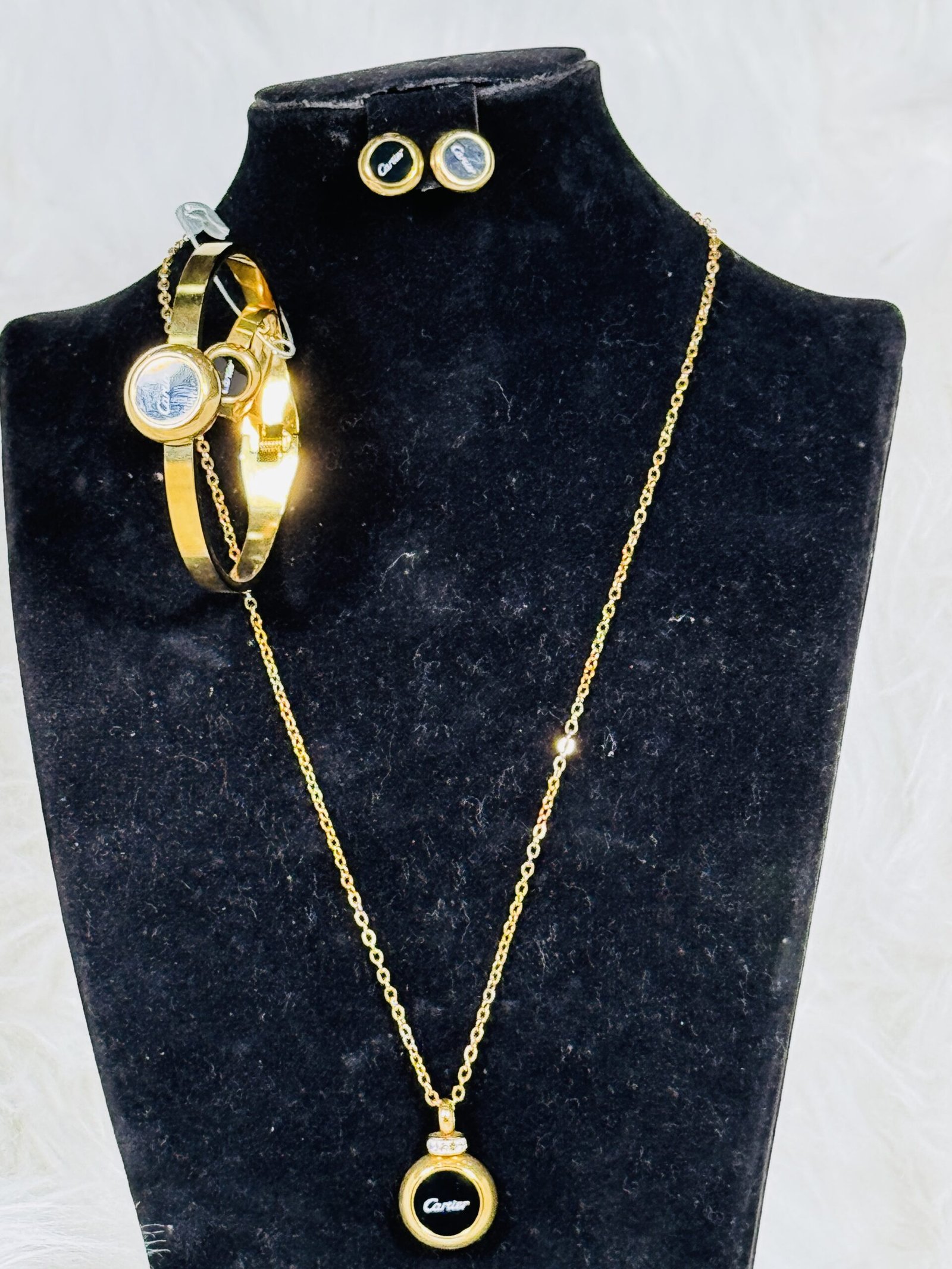 The Cartier jewelry set is the epitome of sophistication and elegance, catering to anyone who appreciates fine craftsmanship and luxurious design. Featuring a golden pendant adorned with a striking black ‘Cartier’ inscription, this set is not just jewelry; it’s a statement. Whether you’re attending high-profile events or seeking a touch of class for everyday wear, this set is designed to complement your style effortlessly.