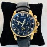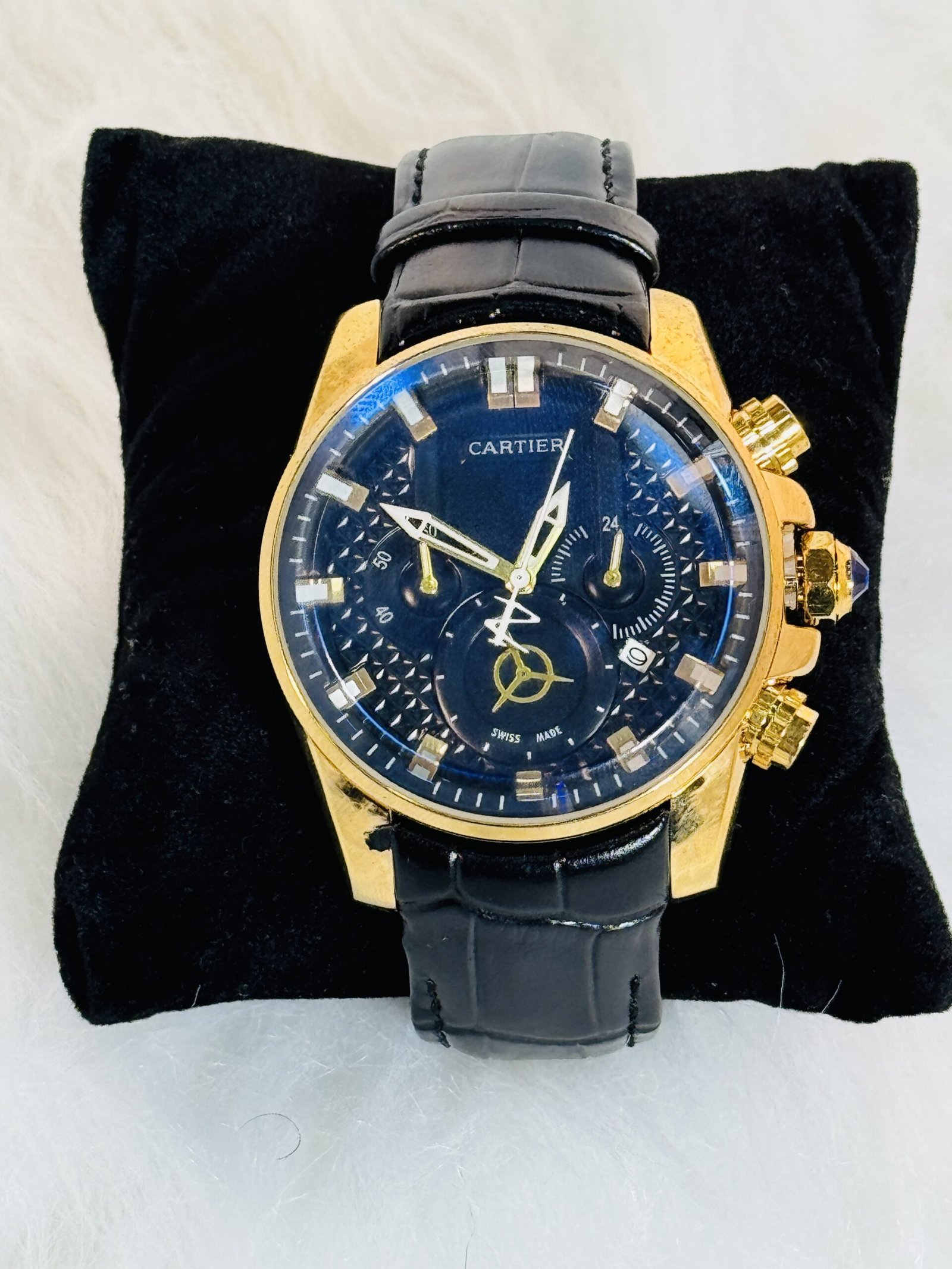At the heart of this Cartier wristwatch lies attention to detail that elevates its appeal. The golden sides lend a premium touch, exuding a rich aesthetic alongside its functionality. Three mini clock engravings placed within the sleek black screen display precise time zones, a feature perfect for modern globetrotters. White rotation hands glide smoothly across the surface, enabling effortless time reading at all hours.