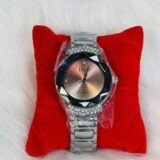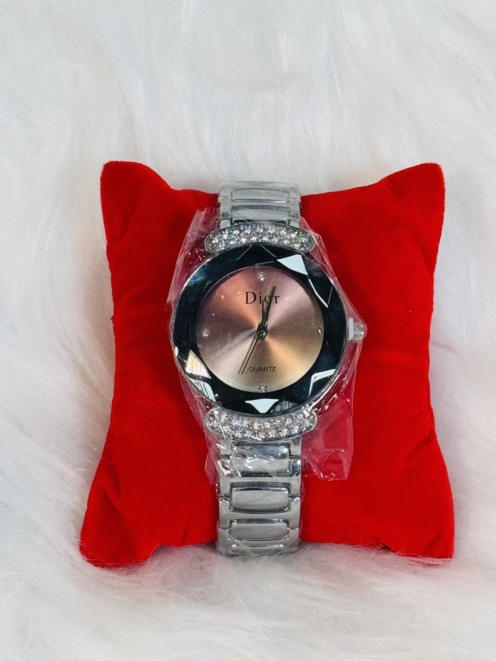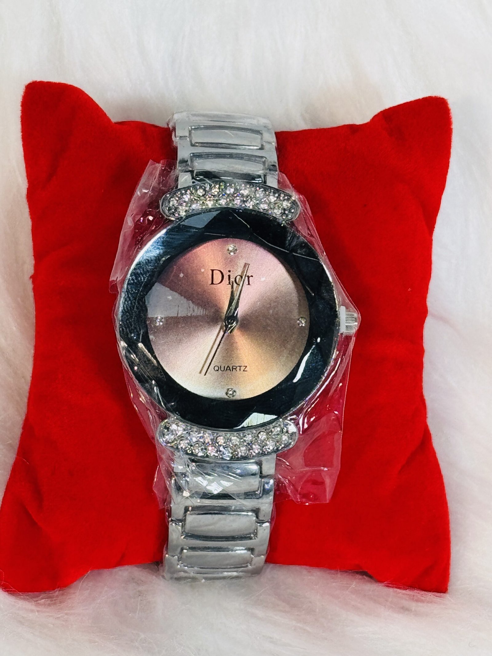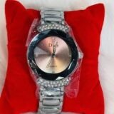 If you’re looking for a watch that blends elegance, quality, and distinctive design, the Dior wristwatch with heavy silver chain strap, brown round screen, shiny embedded silver sides, and silver rotation hands is the perfect choice to elevate your collection.