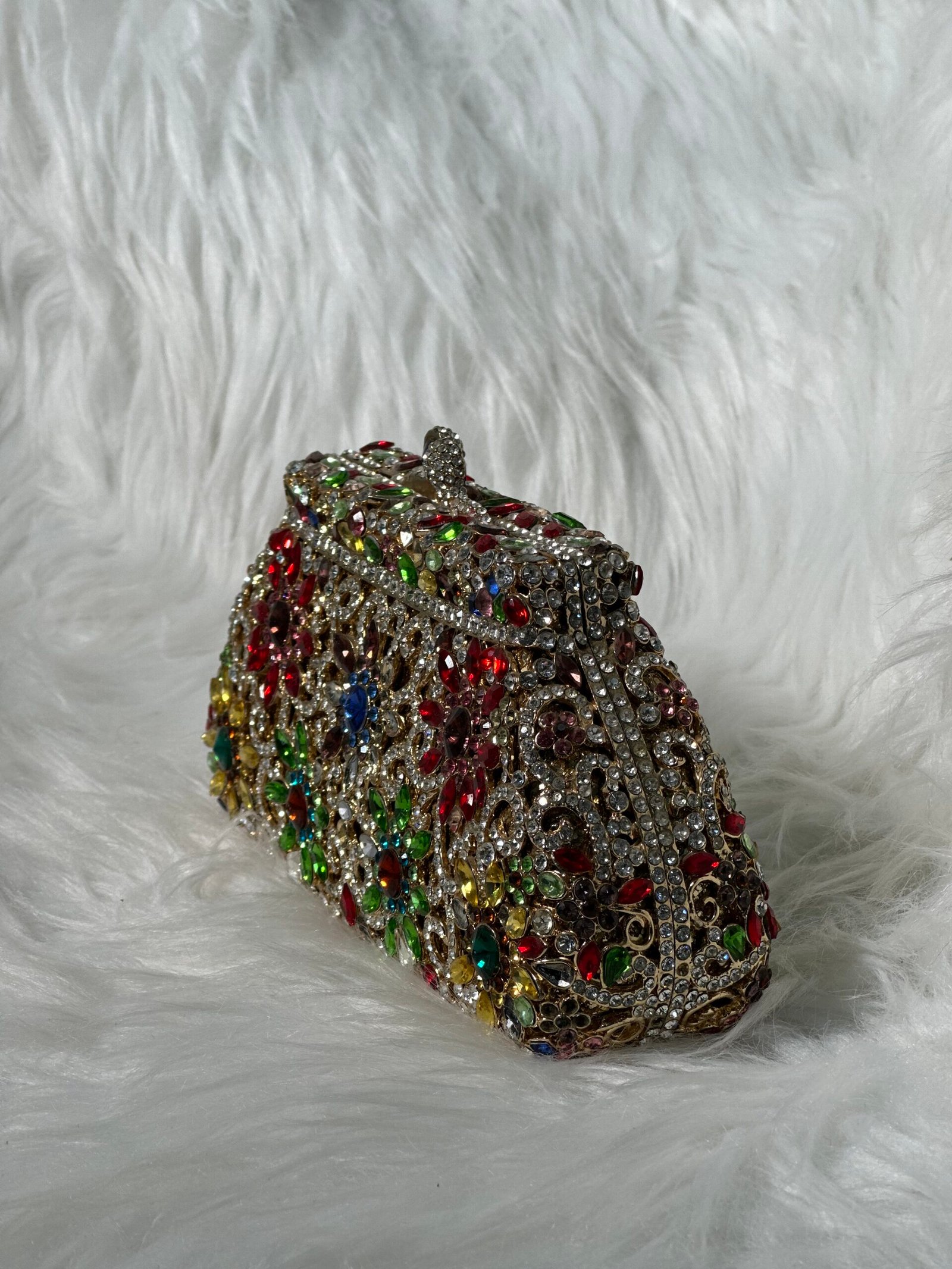 This clouch purse is not just an accessory; it’s a testament to durability fused with aesthetic charm. The premium-grade materials ensure that every dotted colored stone remains secure and radiant over extended use, while the purse itself retains its luxurious texture and shape. Its compact yet spacious interior is thoughtfully designed to accommodate your essentials – from your phone to makeup – without compromising comfort or organization. The sturdy clasp adds a touch of sophistication while ensuring your belongings stay secure throughout the day.