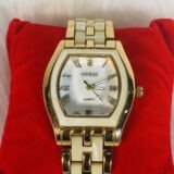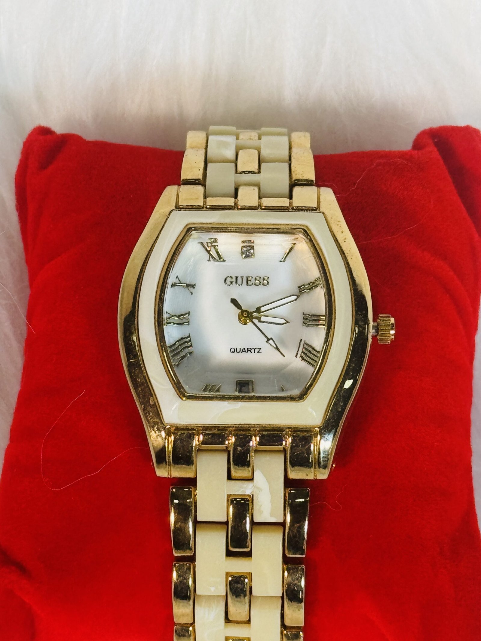 What sets this wristwatch apart is its adaptability and versatility. The cream and gold strap pairs effortlessly with various outfits, from evening wear to office attire and casual ensembles, making it the perfect companion for every occasion. Whether you are gifting it to someone special or adding it to your own collection, this Guess wristwatch shines as a marker of elegance and practicality, enhancing your wardrobe with understated luxury.