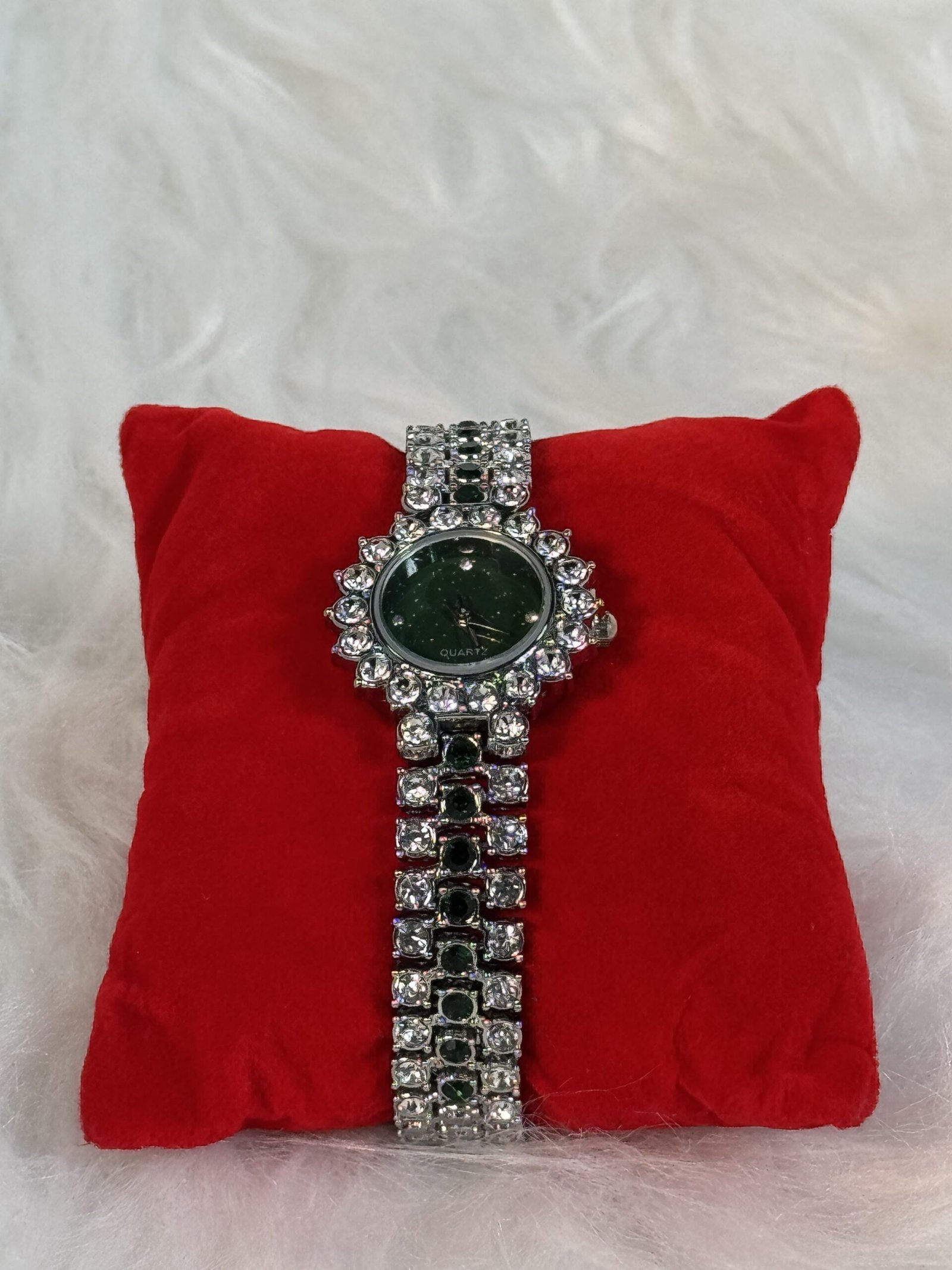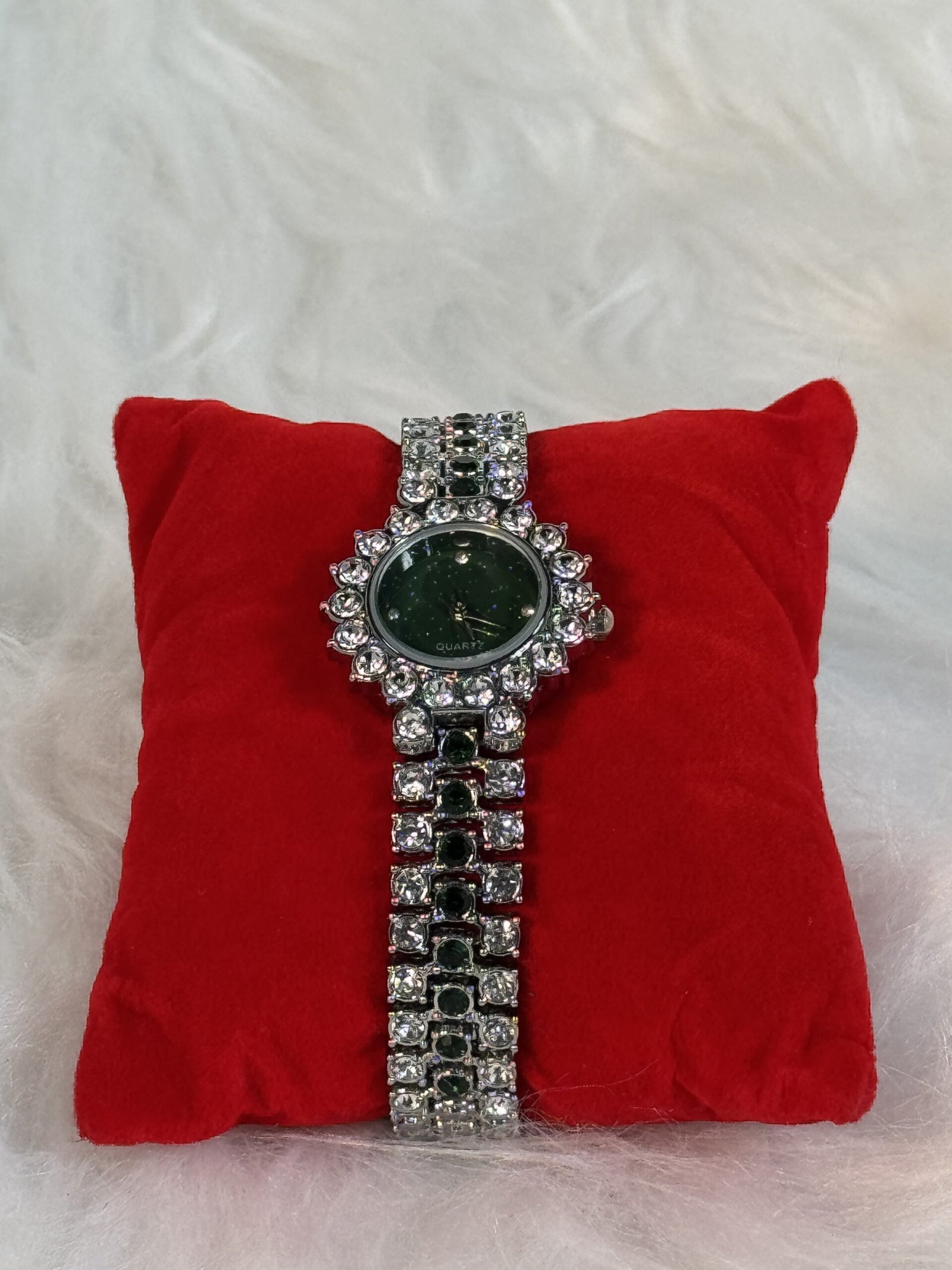 Introducing the perfect blend of timeless design and contemporary aesthetics—the wristwatch with an embellished silver and green strap. This sophisticated accessory is designed to elevate your everyday style effortlessly. Whether you’re dressing for the office or a casual outing, this wristwatch will leave an impression of elegance and refinement.