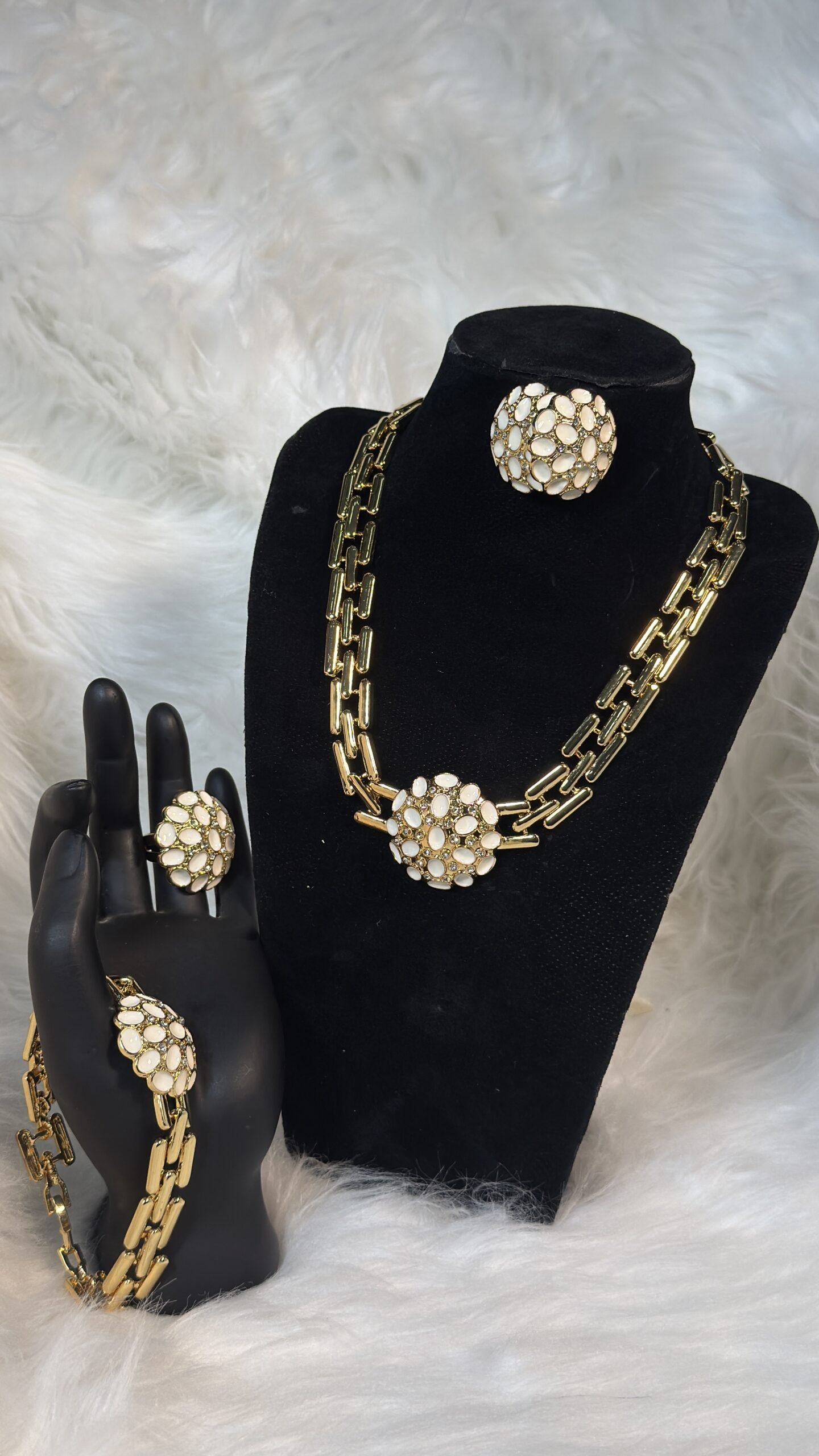 At the heart of this jewelry set lies premium-grade Italian craftsmanship, defined by its use of high-quality gold and pure white details. The stone embellishments are securely embedded to ensure durability and brilliance. Each element of this set has been carefully selected to give you unparalleled comfort and a luxurious aesthetic that lasts for generations.