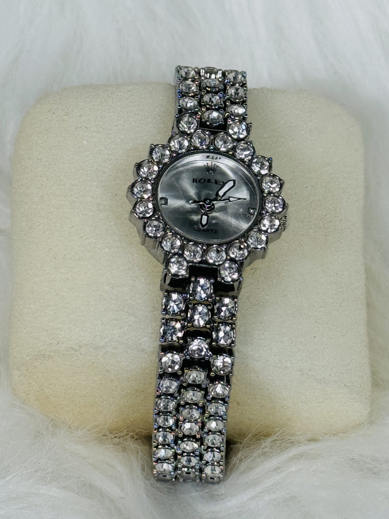 The Rolex wristwatch is a stunning masterpiece that showcases precision, elegance, and timeless beauty. Designed with a fully embellished silver strap, this watch radiates sophistication, making it the ideal accessory for any occasion. The silver screen adds a refined touch, while the embellished silver sides contribute to its opulent appeal. Whether you’re attending a formal event or simply elevating your everyday style, the Rolex wristwatch is a perfect companion that seamlessly blends luxury and functionality.