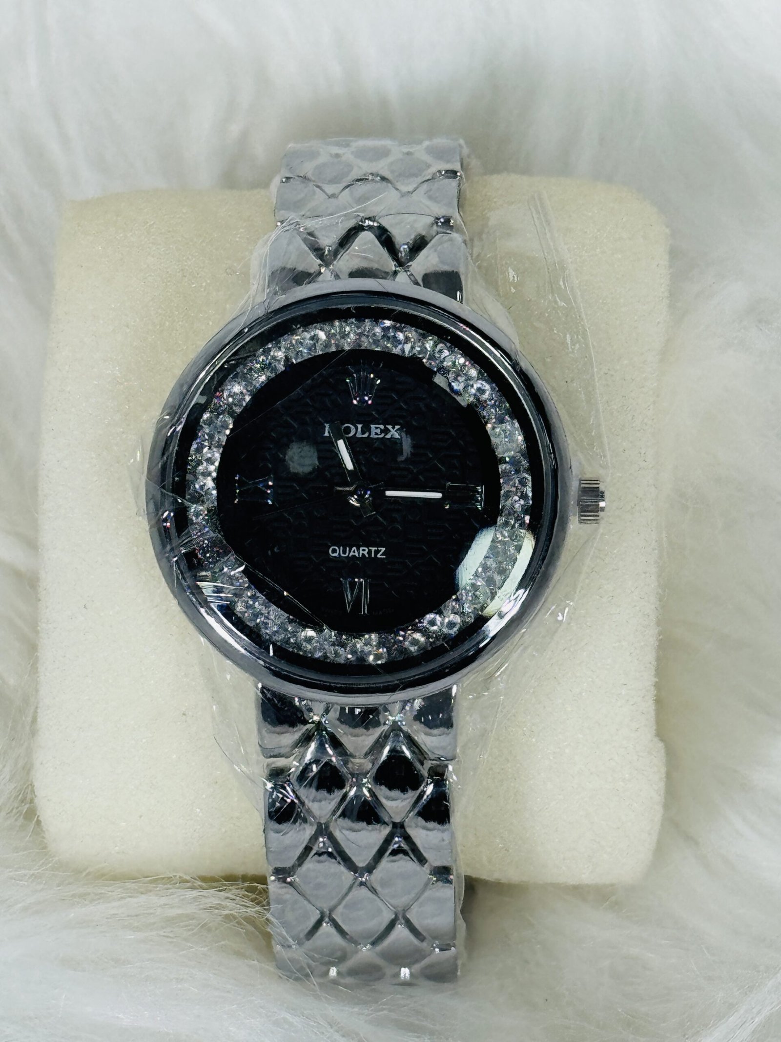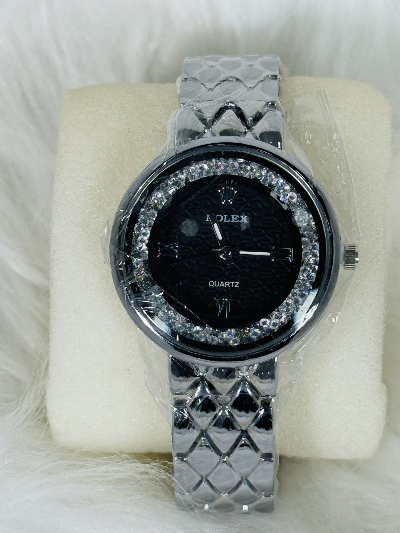 When it comes to wristwatches, Rolex has always stood as a symbol of excellence, luxury, and precision. This Rolex wristwatch with its sophisticated craftsmanship combines functionality with a timeless design. Its layered silver strap exudes class while providing a durable and comfortable fit for daily wear or special occasions. A black screen, complemented by embedded silver sides, creates a striking contrast that grabs attention and reflects refinement at its best. With its sleek white rotation hands, this timepiece offers both simplicity and elegance in one package.