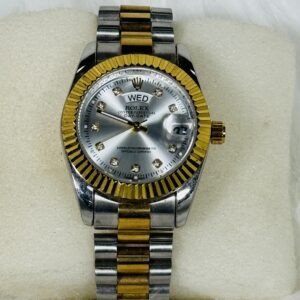 The golden strap serves as the cornerstone of this wristwatch, complemented beautifully by the golden screen embellished with shimmering golden stones. Each element seamlessly integrates with the golden rotation hands, creating a cohesive yet striking design. The harmonious interplay of these features makes this Rolex wristwatch a true statement piece that speaks to your refined taste.