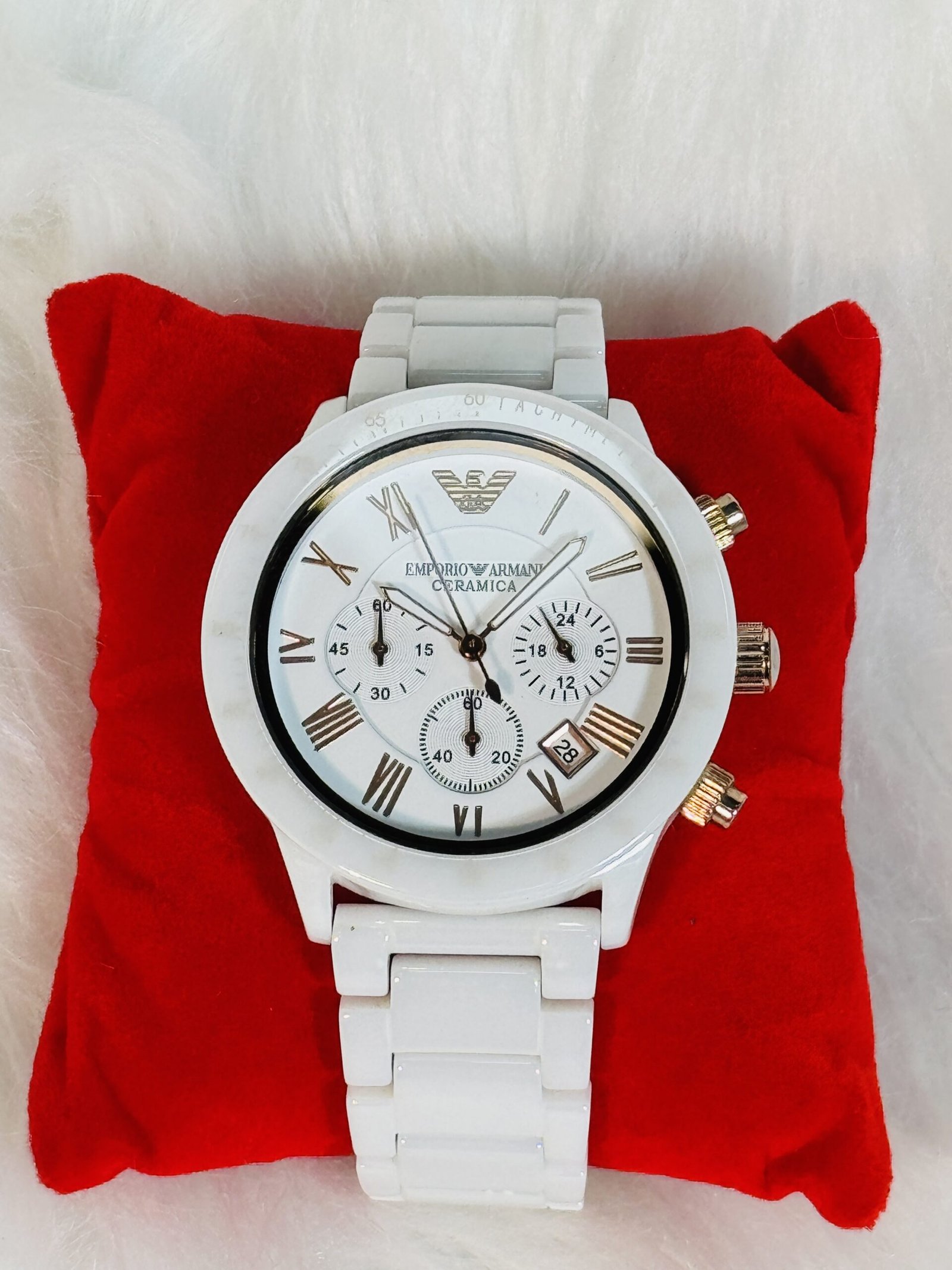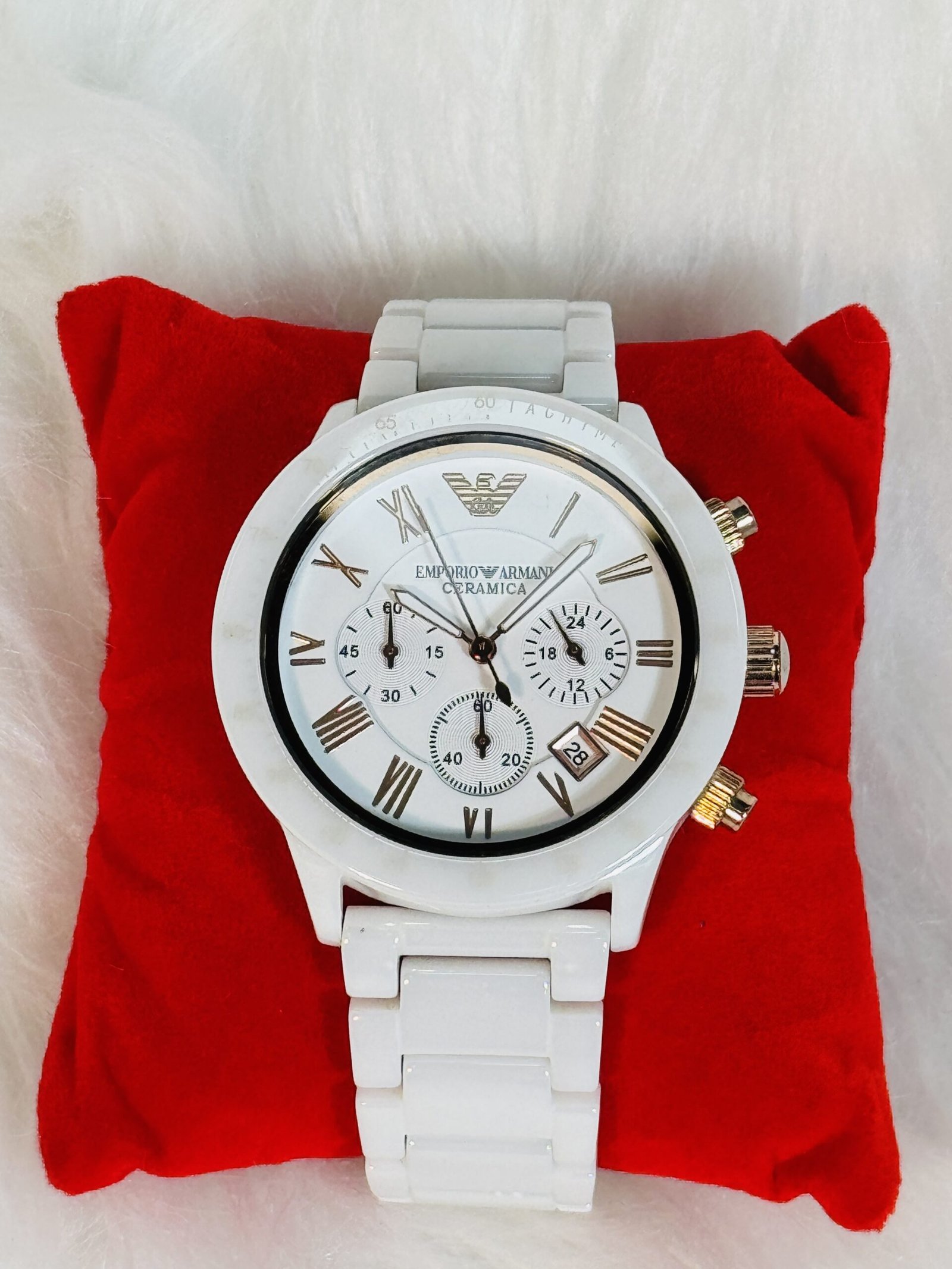 Introducing the Emporio Armani watch, a masterpiece of sophistication and craftsmanship. This high-quality timepiece commands attention with its luxurious design, featuring a striking white chain strap that is not only visually stunning but also offers unparalleled comfort and durability. The central focus of the watch is its white round screen, adorned with gold inscriptions that exude elegance. This combination of white and gold creates a seamless harmony of modernity and timelessness, making it perfect for both formal and casual wear.