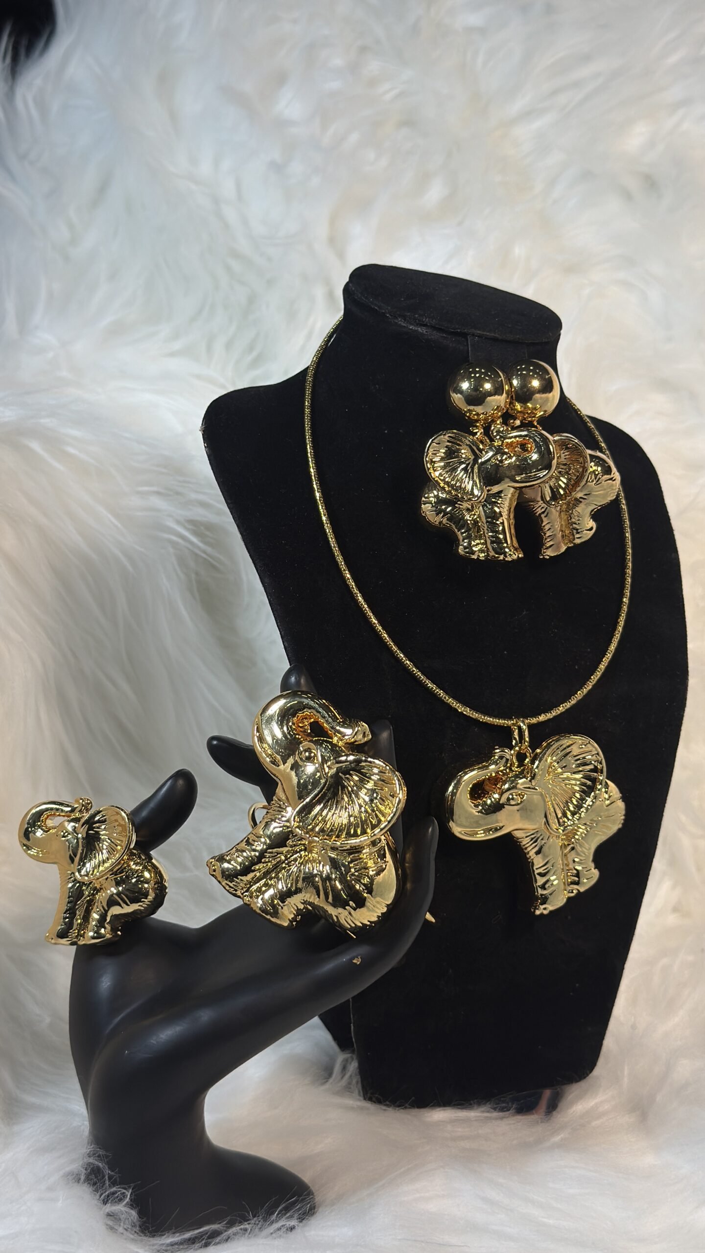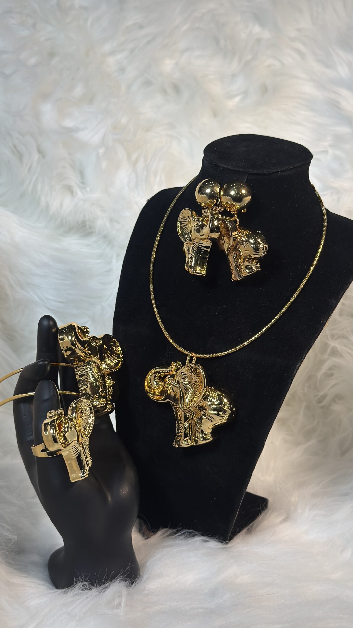 Unleash the perfect blend of elegance and uniqueness with our Gold Elephant Design Fashion Jewelry Set. This custom-crafted set offers a bold yet sophisticated aesthetic, featuring a bracelet and ring without a necklace cord– perfect for those who seek a distinctive and fashionable look. Designed with precision and care, this piece is ideal for collectors and jewelry enthusiasts who value quality and artistry in their accessories.