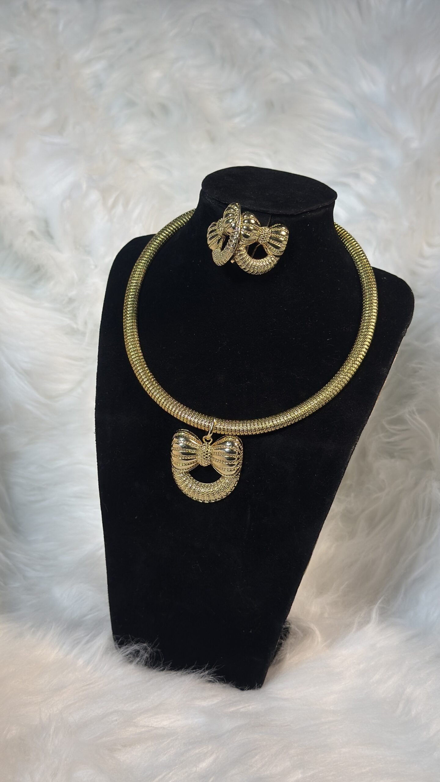 Discover a masterpiece of modern jewelry design with our Ribbon Design Gold Fashion Jewelry Set. Featuring a stunningly crafted big ribbon pendant, this custom gold piece is sure to stand out. Perfect for elevating any outfit, the set delivers timeless sophistication at its finest, designed for those who appreciate the finer things in life.