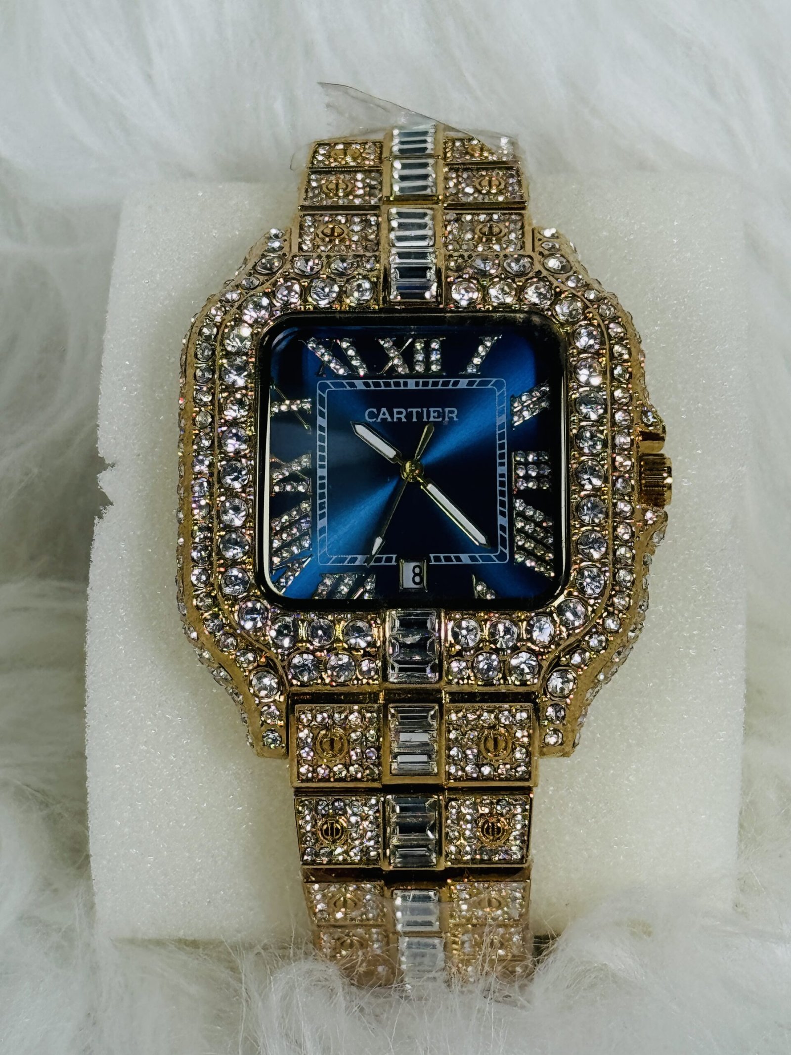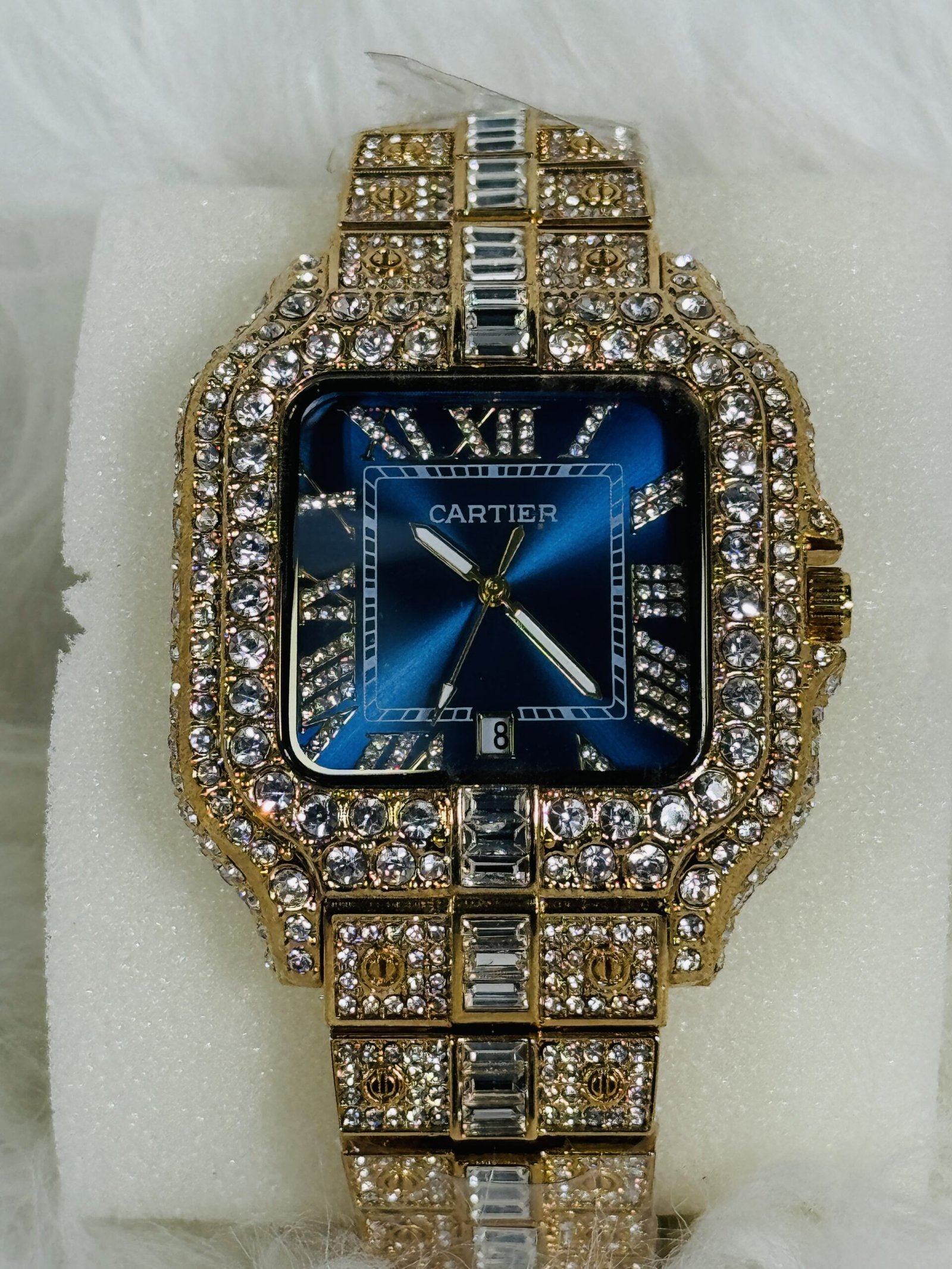 Discover the allure of understated luxury with the fully embellished Golden Cartier wristwatch. Perfect for those who appreciate fine craftsmanship and sophisticated styling, this exquisite timepiece combines classic elegance with modern functionality. The golden casing emanates an opulent glow, making this watch a standout accessory for any occasion, whether formal or casual.