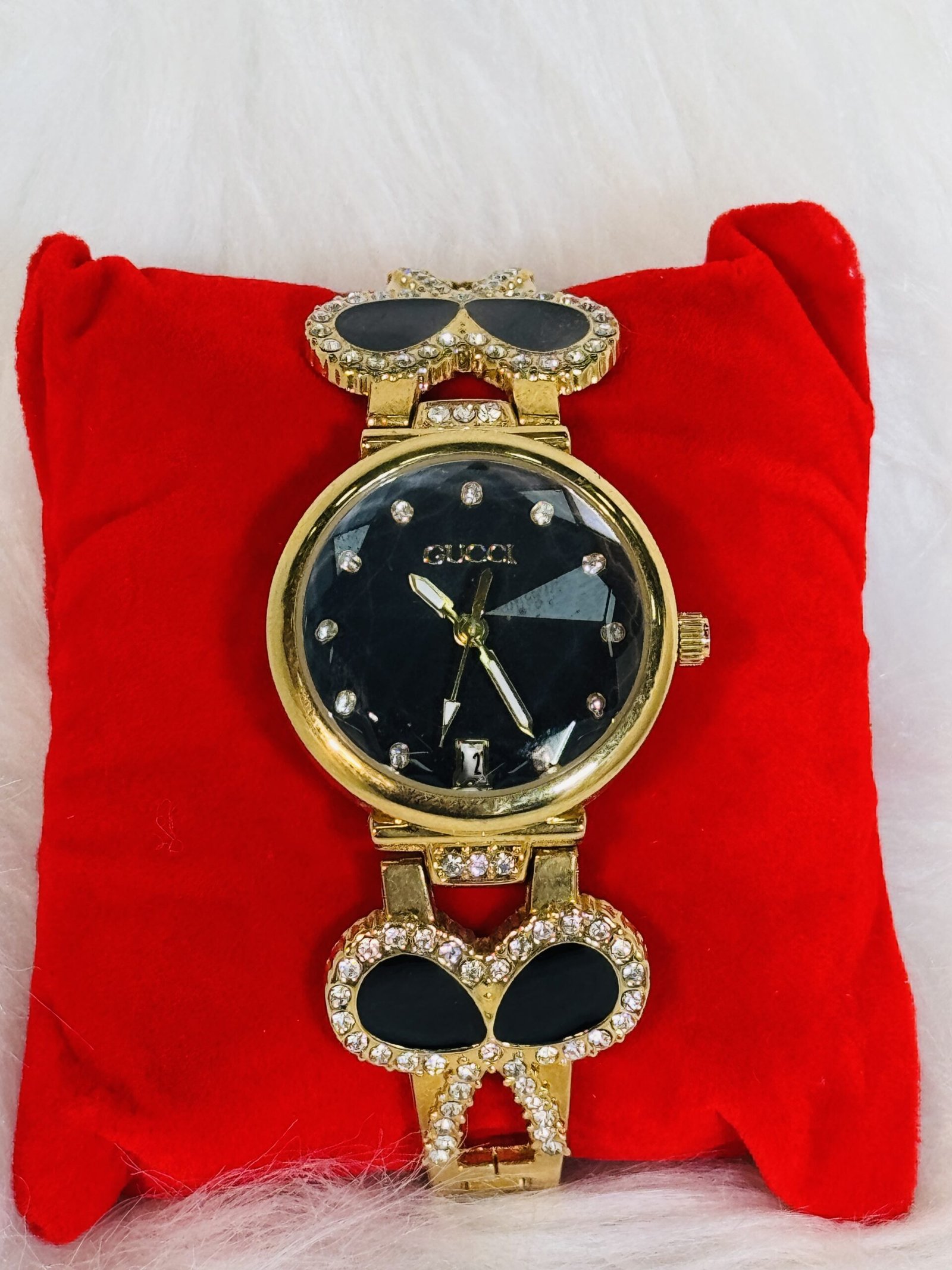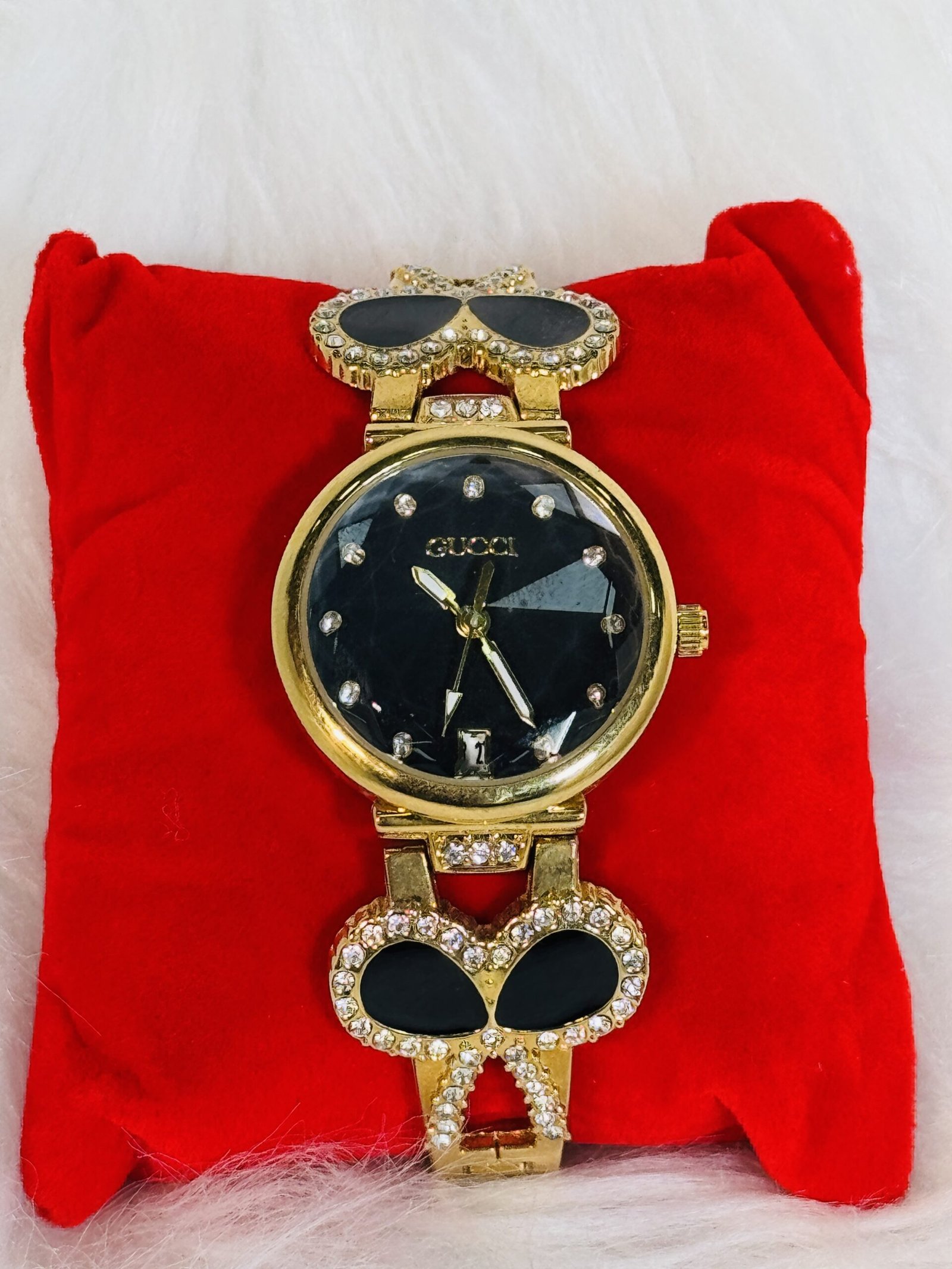 Elevate your accessory collection with the striking Gucci wristwatch, a perfect blend of classic sophistication and contemporary design. This exquisite timepiece features a black ribbon-like strap interwoven with a delicate chain, providing unmatched comfort and style. The seamless integration of the strap’s unique texture makes it a versatile piece for both casual gatherings and formal occasions. Ideal for individuals who value understated elegance, this wristwatch is a true testament to Gucci’s craftsmanship and heritage.