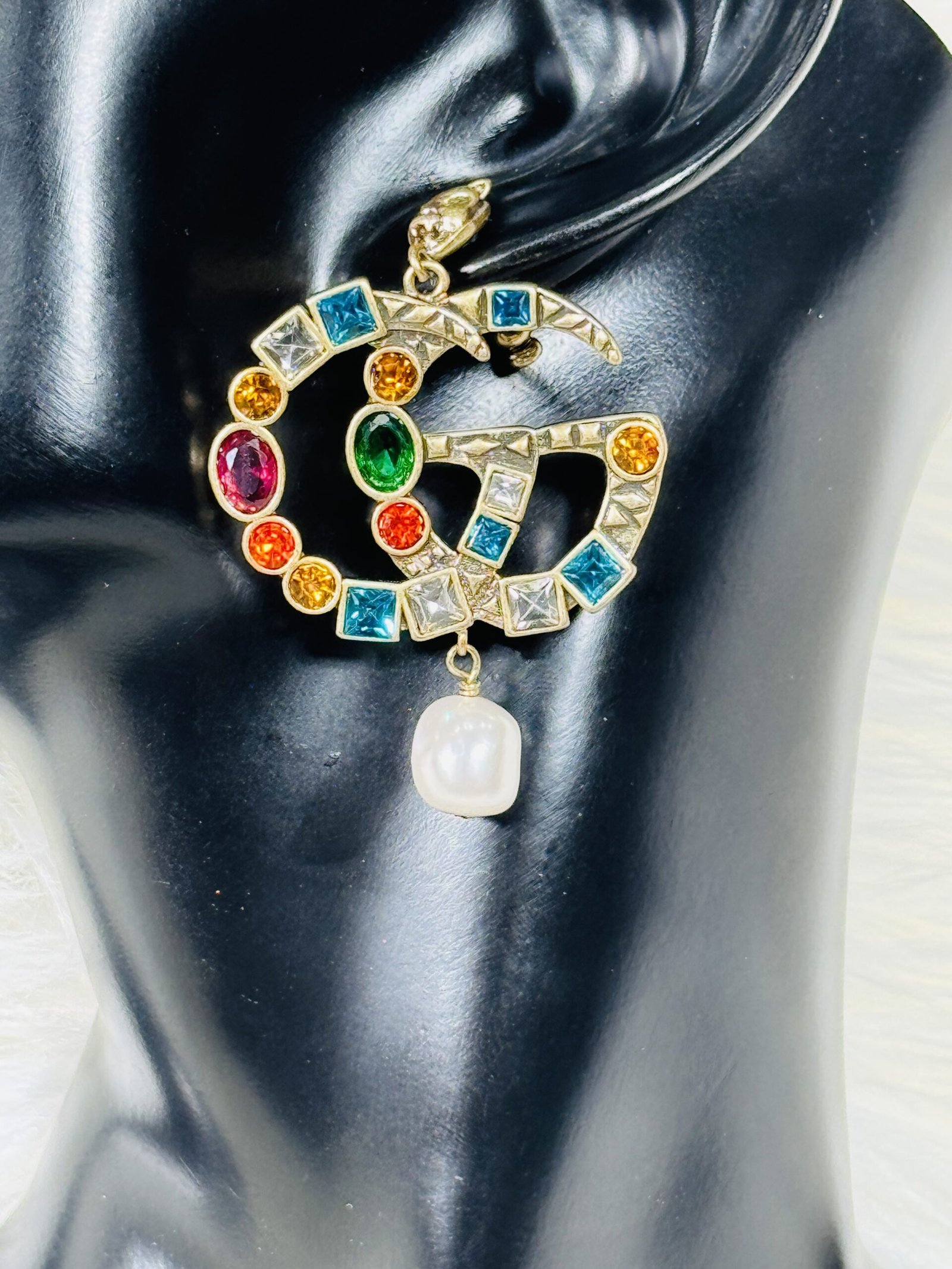 These Gucci earrings with the big logo embellished with multicolored stones and pearls are more than just stunning jewelry—they are a representation of your taste for luxury and refined charm. The interplay of vibrant stones and flawless pearl accents captures the essence of bold sophistication, making this piece not only an accessory, but an expression of your unique identity.