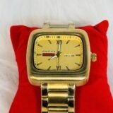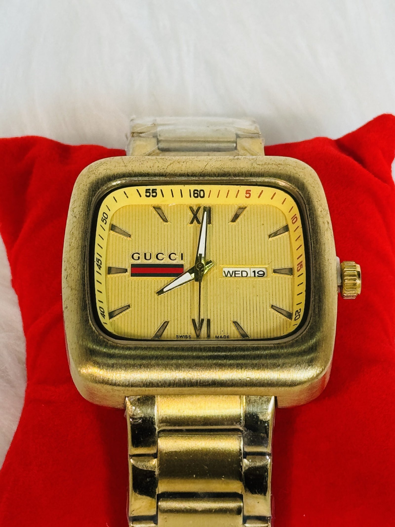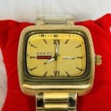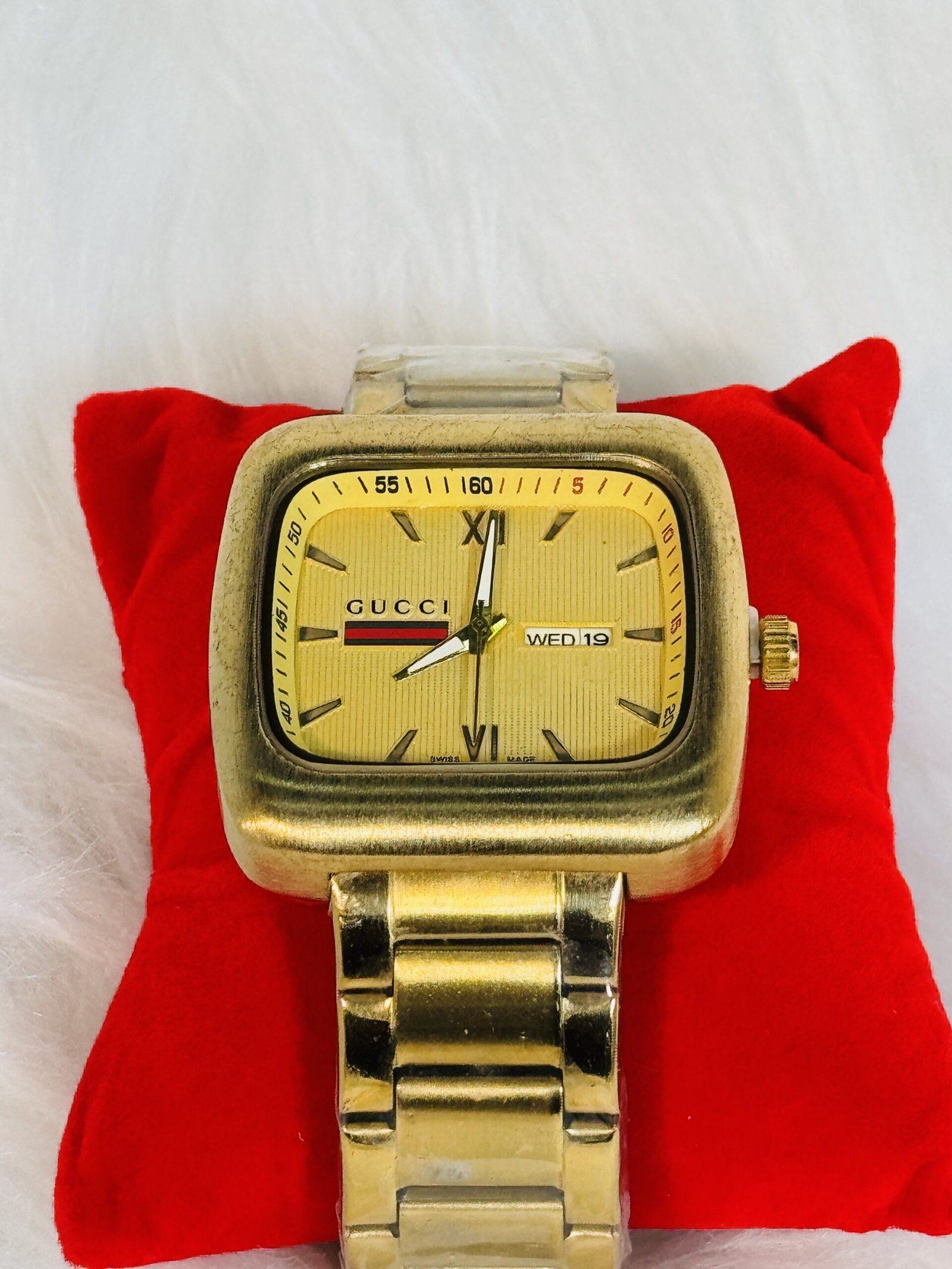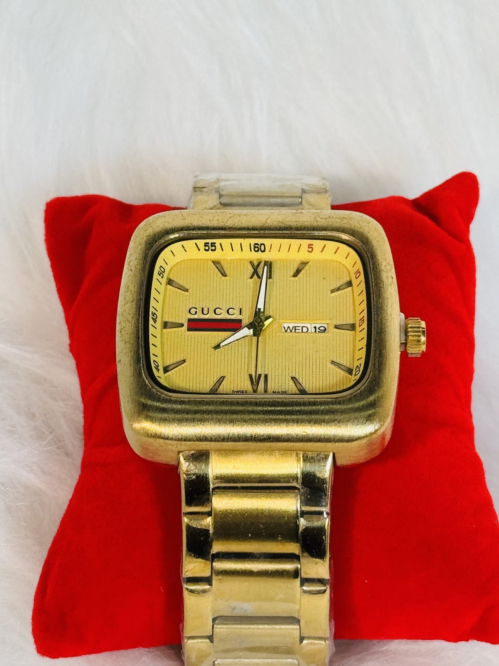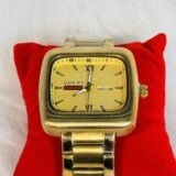 Flaunting a big golden square screen, this Gucci wristwatch is sure to catch eyes and spark admiration. The golden sides of the watch give it a bold presence, ensuring it stands apart from ordinary timepieces. The white rotation hands effortlessly glide across the dial, offering both functionality and striking contrast against the golden backdrop. Each detail has been meticulously created, ensuring you own a watch that balances practicality and design with finesse.