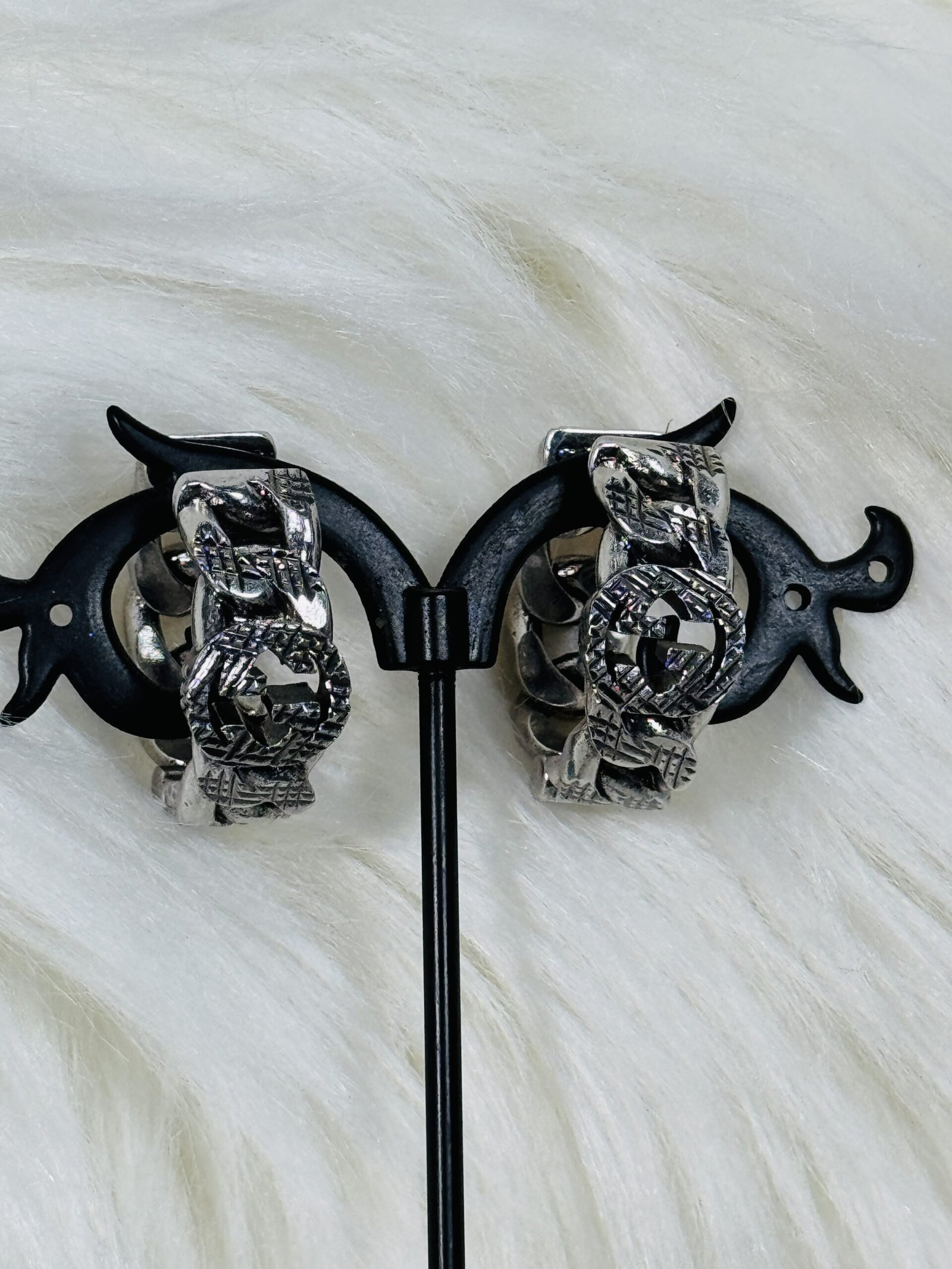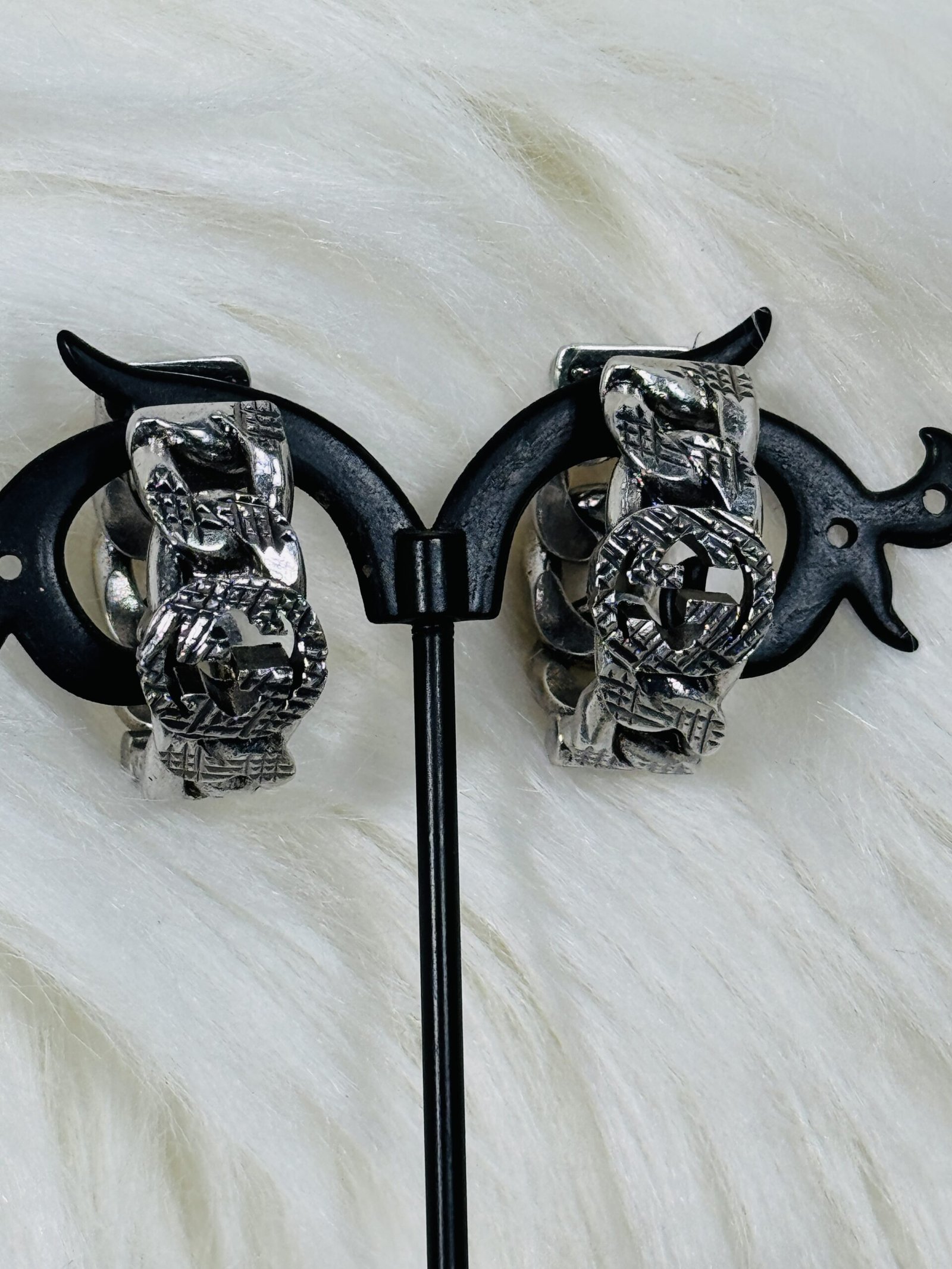 Step into a world of unparalleled sophistication with our heavy silver chain Gucci earrings. These earrings are a striking blend of modern elegance and timeless craftsmanship, designed for individuals who appreciate luxury in every detail. Each piece embodies the signature artistry that Gucci is famed for, offering a contemporary accessory that adds undeniable charm to your wardrobe.