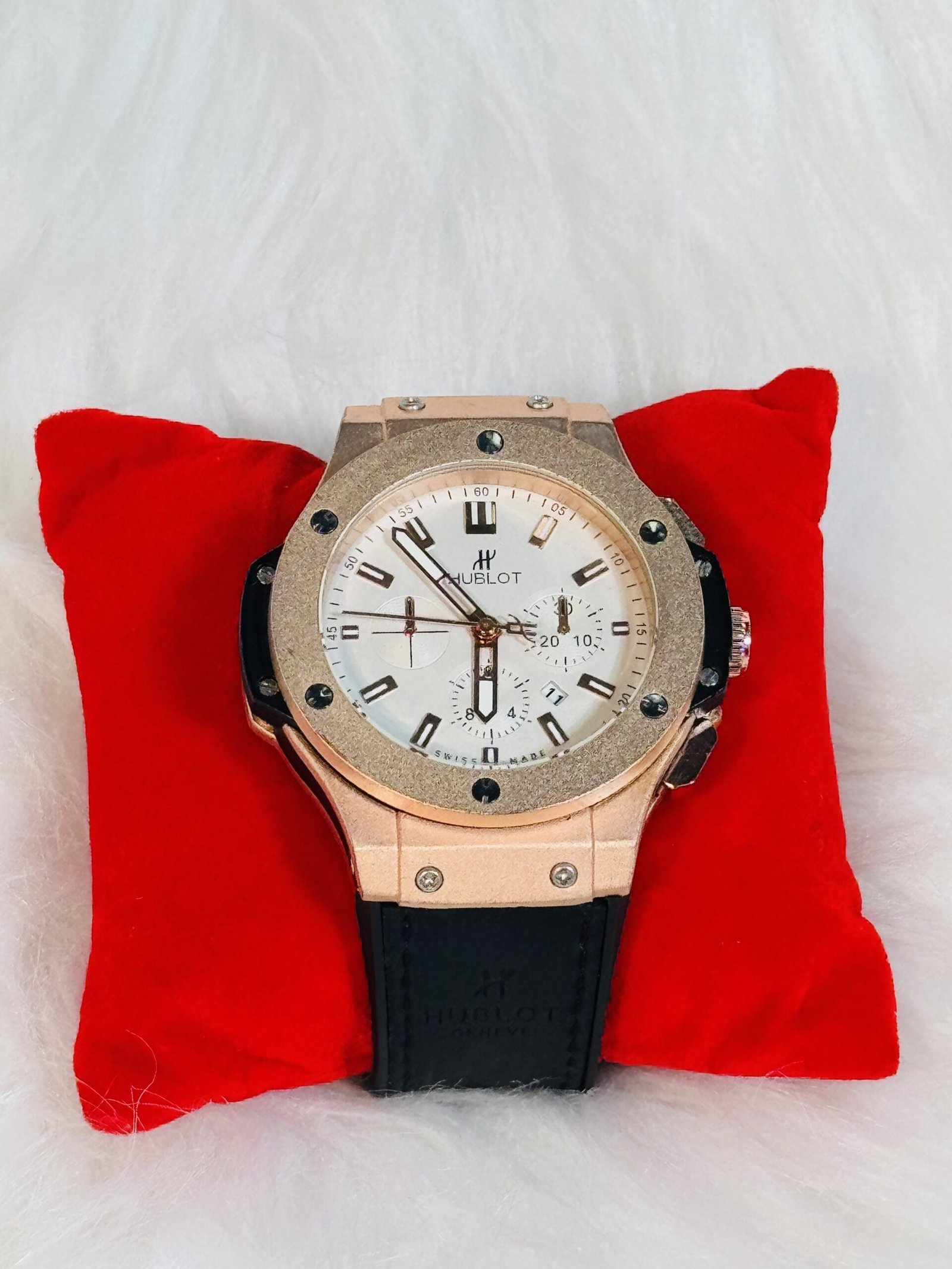 Introducing the Hublot Geneve, a masterpiece of luxury and craftsmanship that effortlessly blends modern elegance with timeless sophistication. Featuring a sleek black leather strap, this watch embodies comfort and style, making it your perfect companion for daily wear or special occasions. The black and rose gold sides add a refined touch of contrast, ensuring it stands out with grace and distinction.