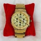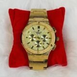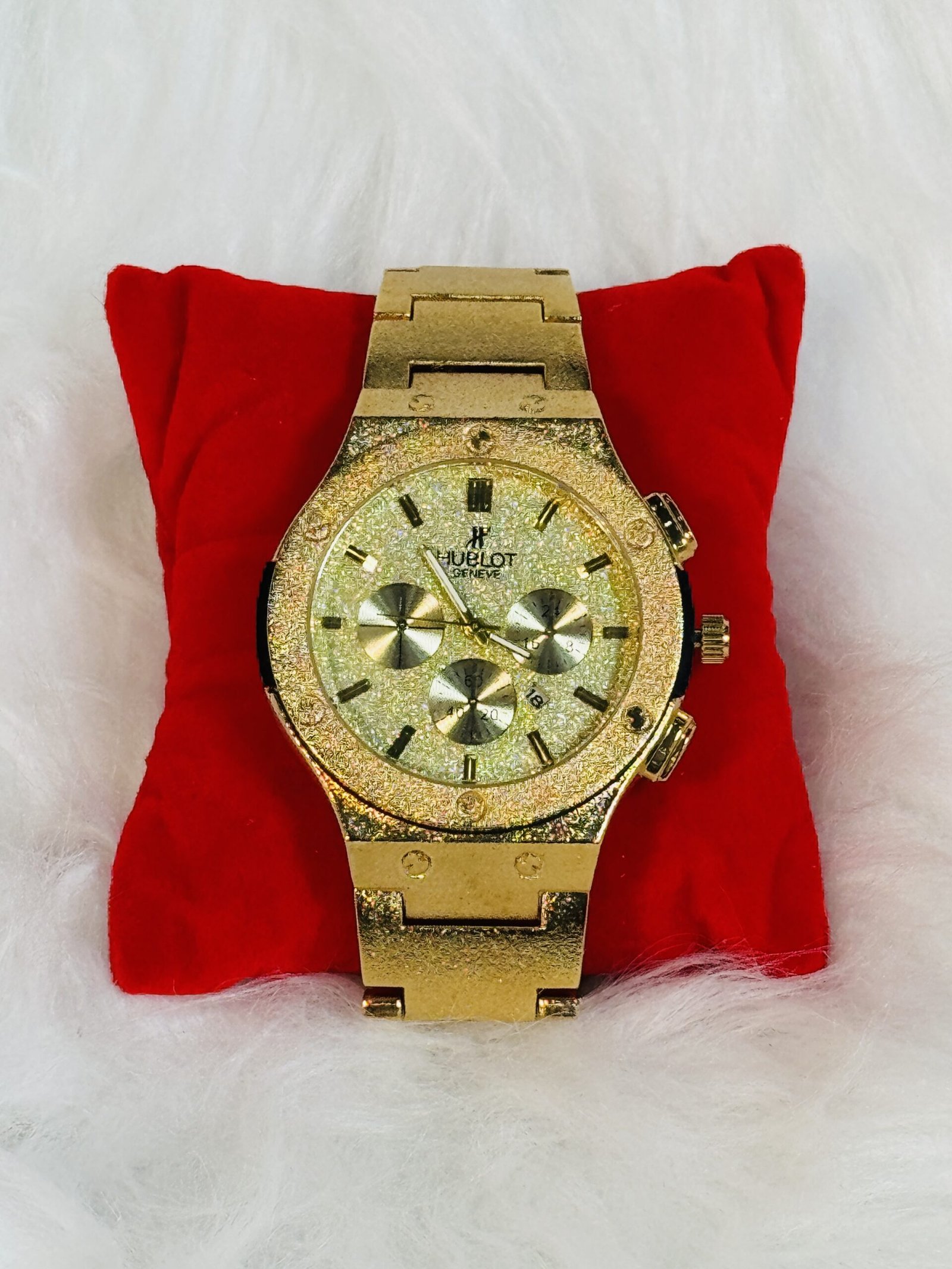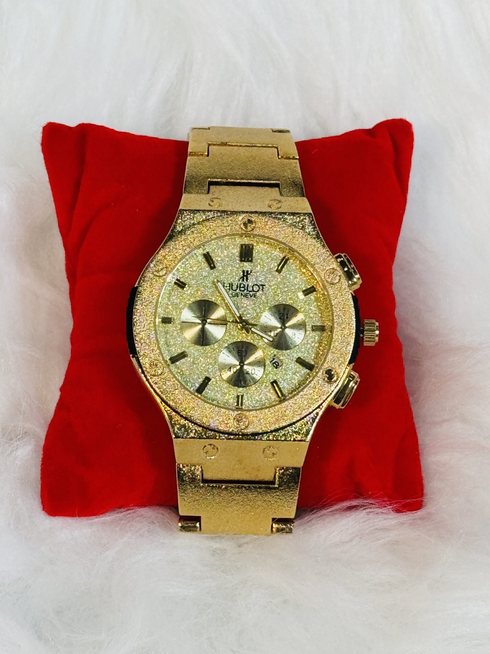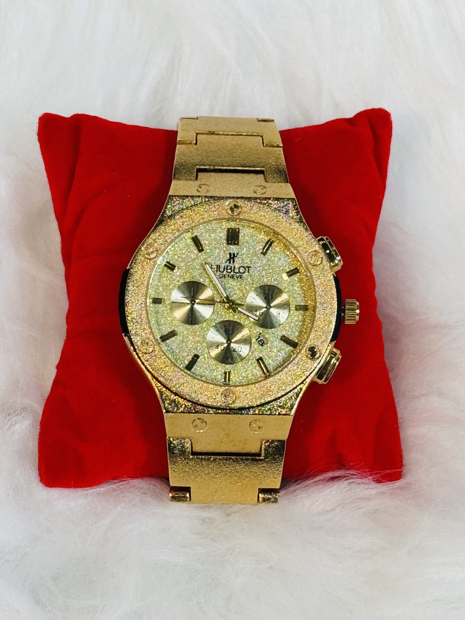 The Hublot Geneve wristwatch stands out with its shiny golden chain strap, delivering a seamless balance of durability and glamor. The round golden screen is a masterpiece, featuring three clocks embedded on the dial to enhance functionality without compromising style. Their white rotation hands gleam against the golden background, ensuring easy readability while adding a touch of grace.