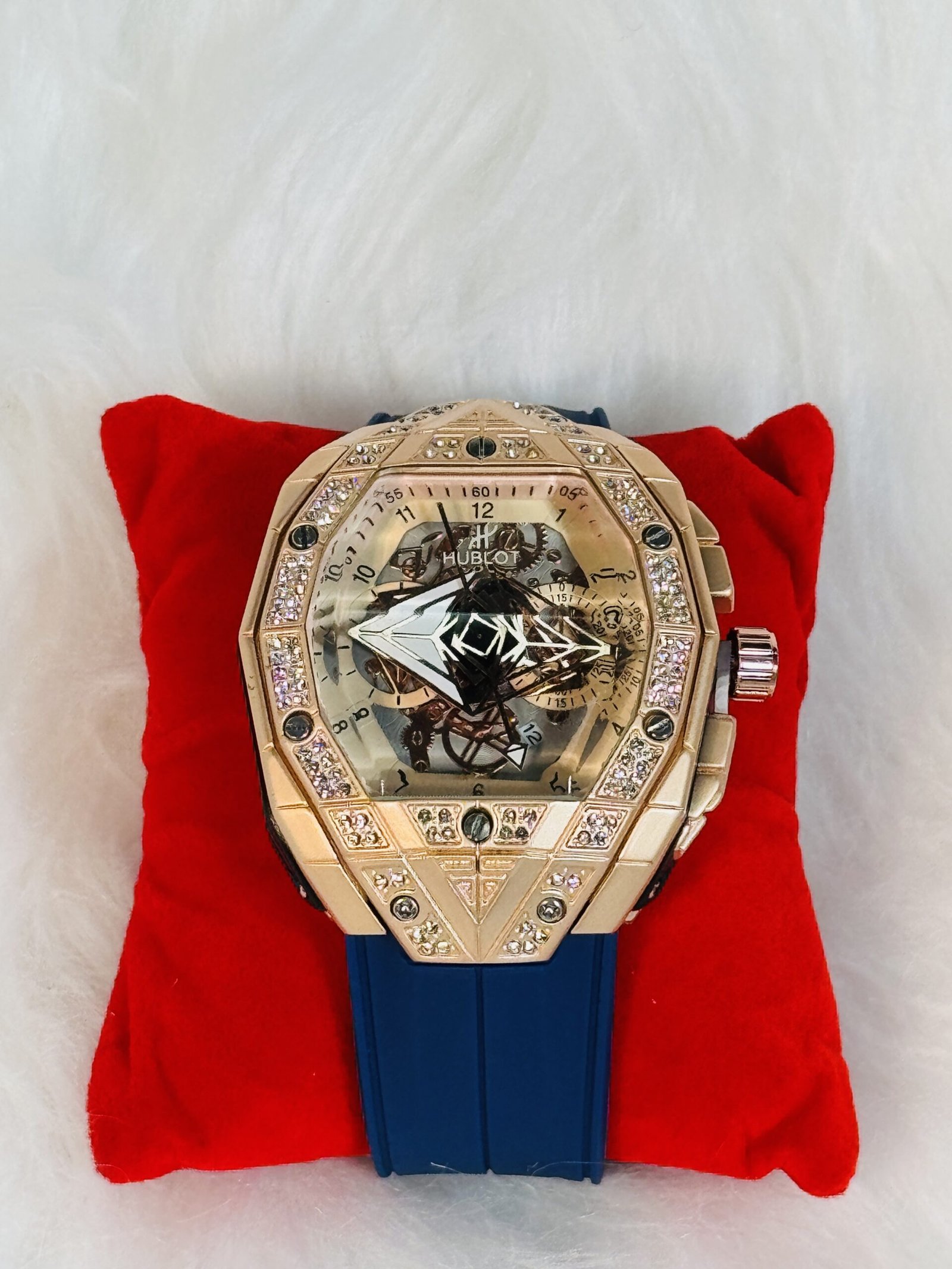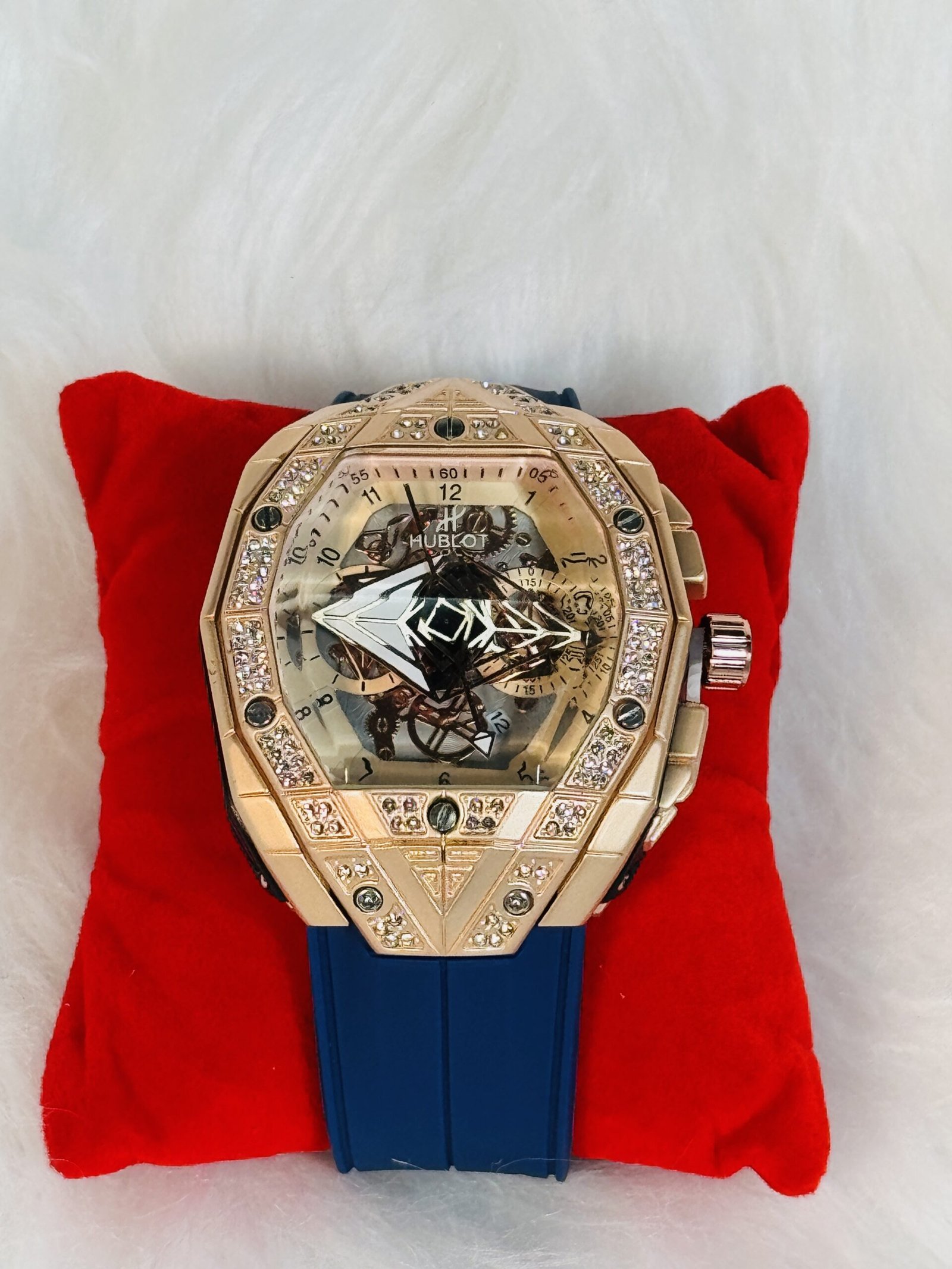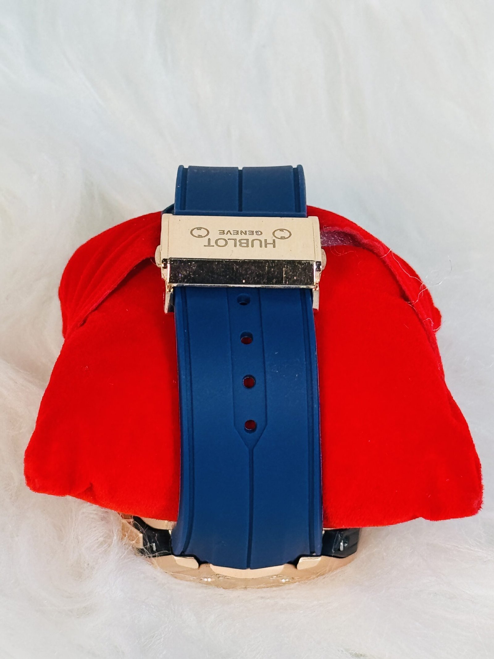 Introducing the Hublot wristwatch, a masterpiece of modern craftsmanship fused with timeless design. This elegant accessory is crafted to impress with its stunning blue strap adorned with a golden clip, making it both stylish and comfortable for daily wear or special occasions. Whether you’re dressing up for an evening gala or enhancing your everyday look, this Hublot wristwatch instantly elevates your overall appearance with its refined sophistication.