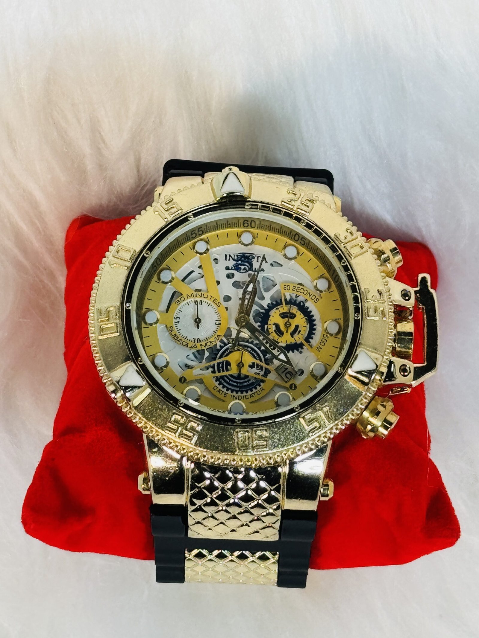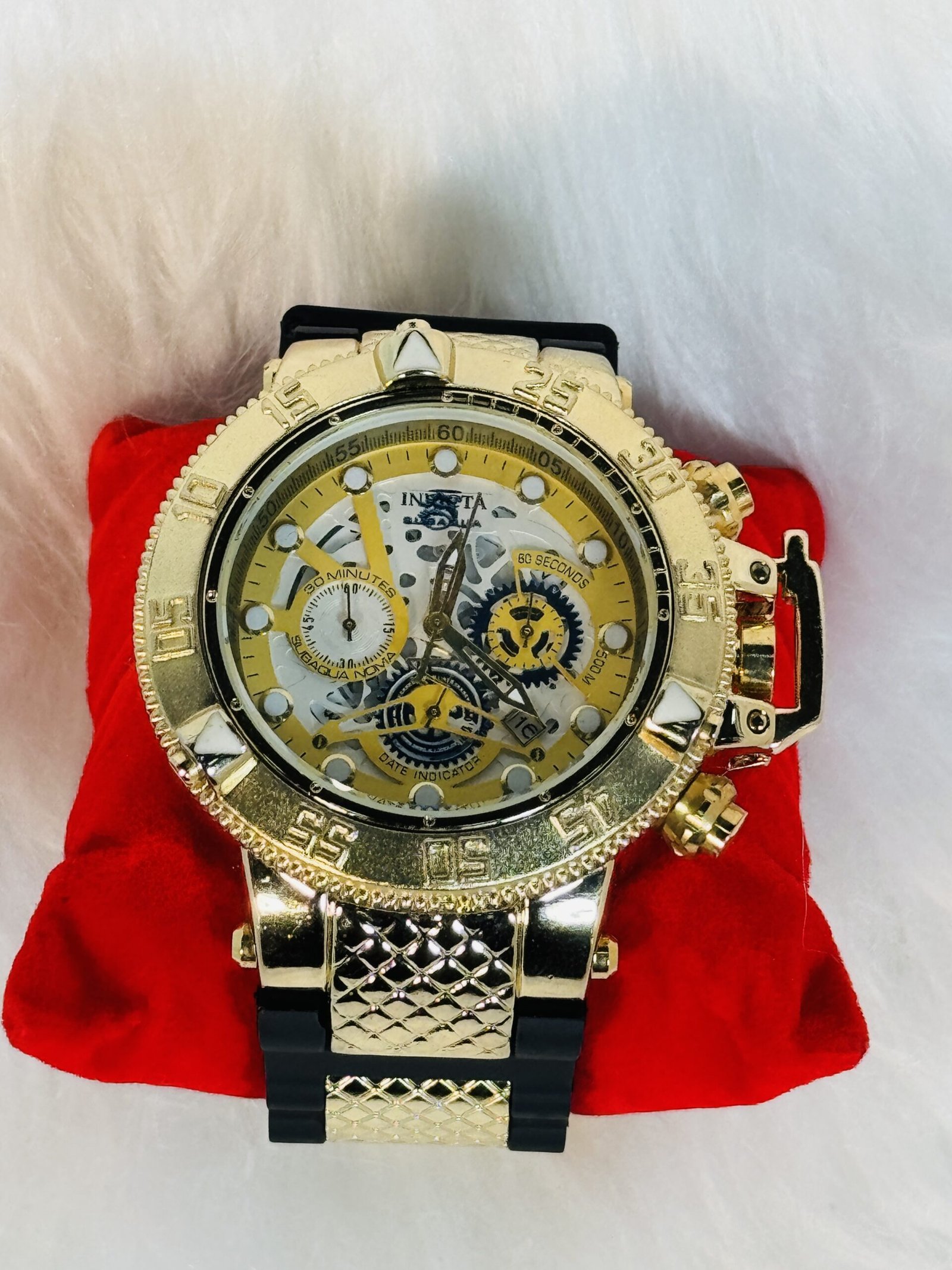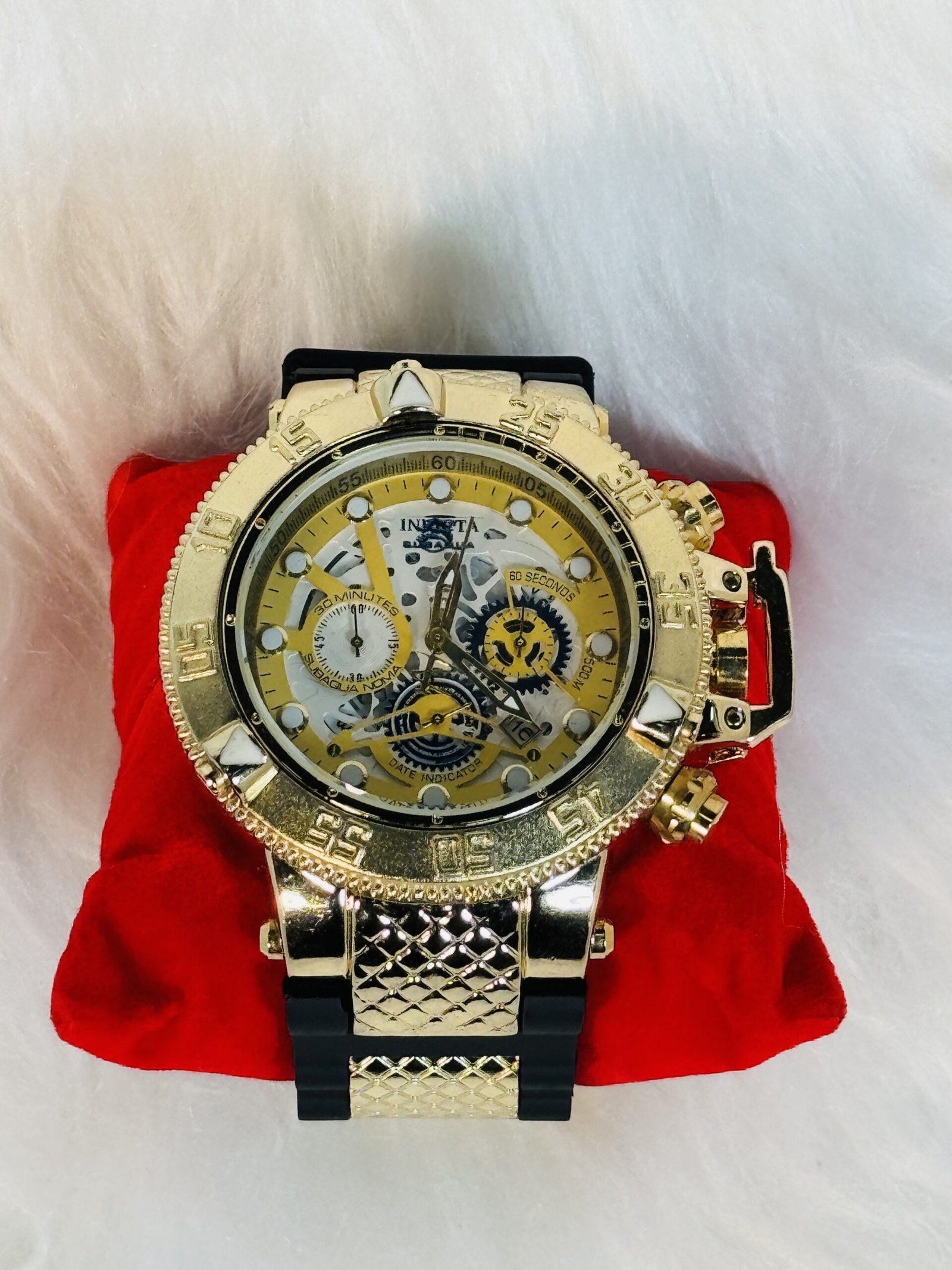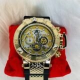 Introducing the Invicta luxury watch, where bold aesthetics and superior craftsmanship come together to create a timeless accessory. Designed for those who appreciate elegance with an edge, this watch combines functionality with a striking visual appeal. The black and gold strap, meticulously crafted, serves as the perfect complement to the daring yet sophisticated persona of the wearer.