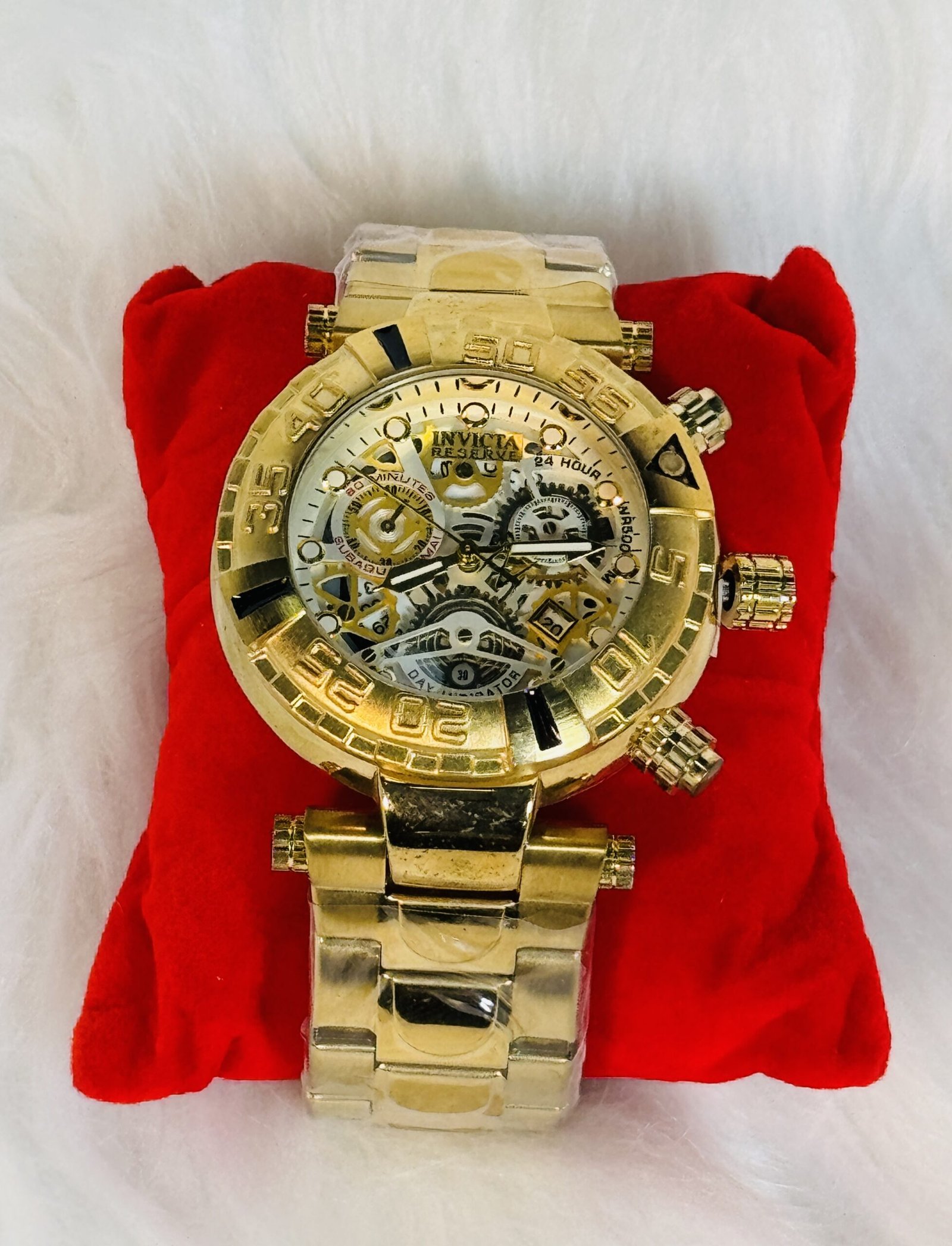 The Invicta Reserve wristwatch is not just an accessory—it’s a statement. Its bold design, highlighted by the luminous golden chain strap, commands attention wherever you go. The skeleton screen contributes a contemporary edge, blending cutting-edge design principles with classic wristwatch features. This watch is perfect for those who desire an accessory that represents confidence, sophistication, and individuality. Make your mark with the Invicta Reserve wristwatch—a dazzling combination of form, functionality, and legacy.
