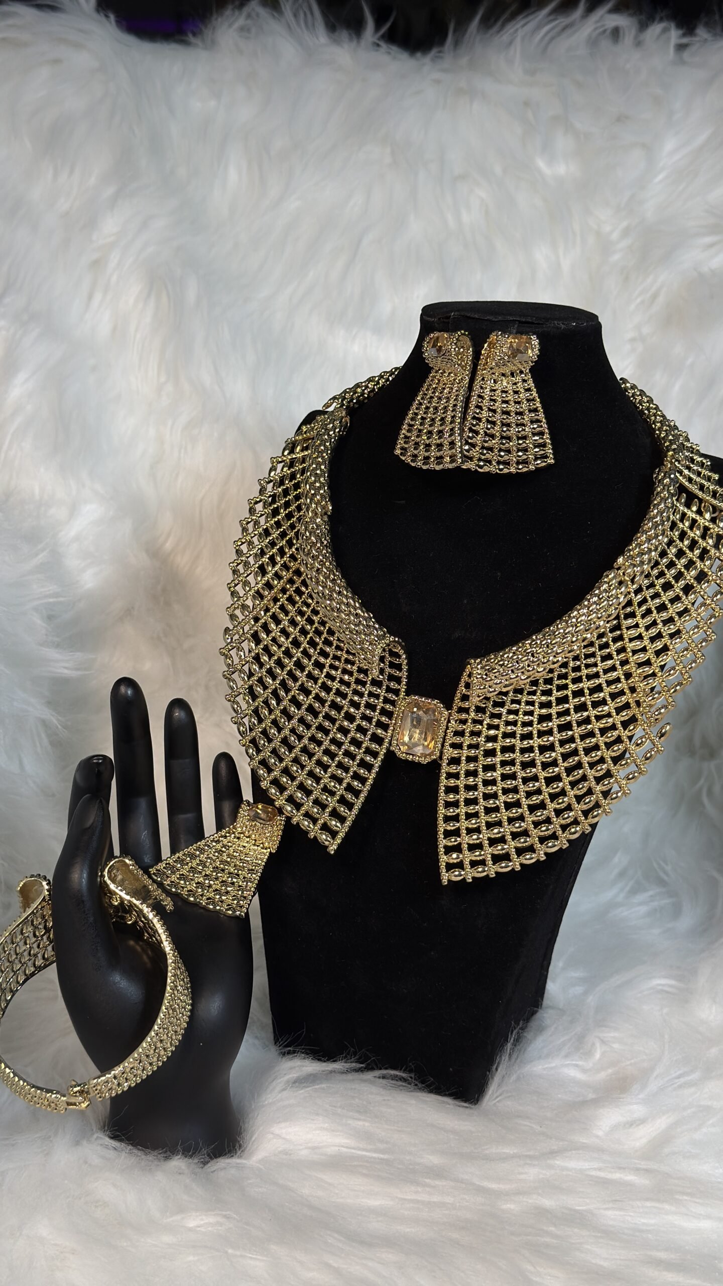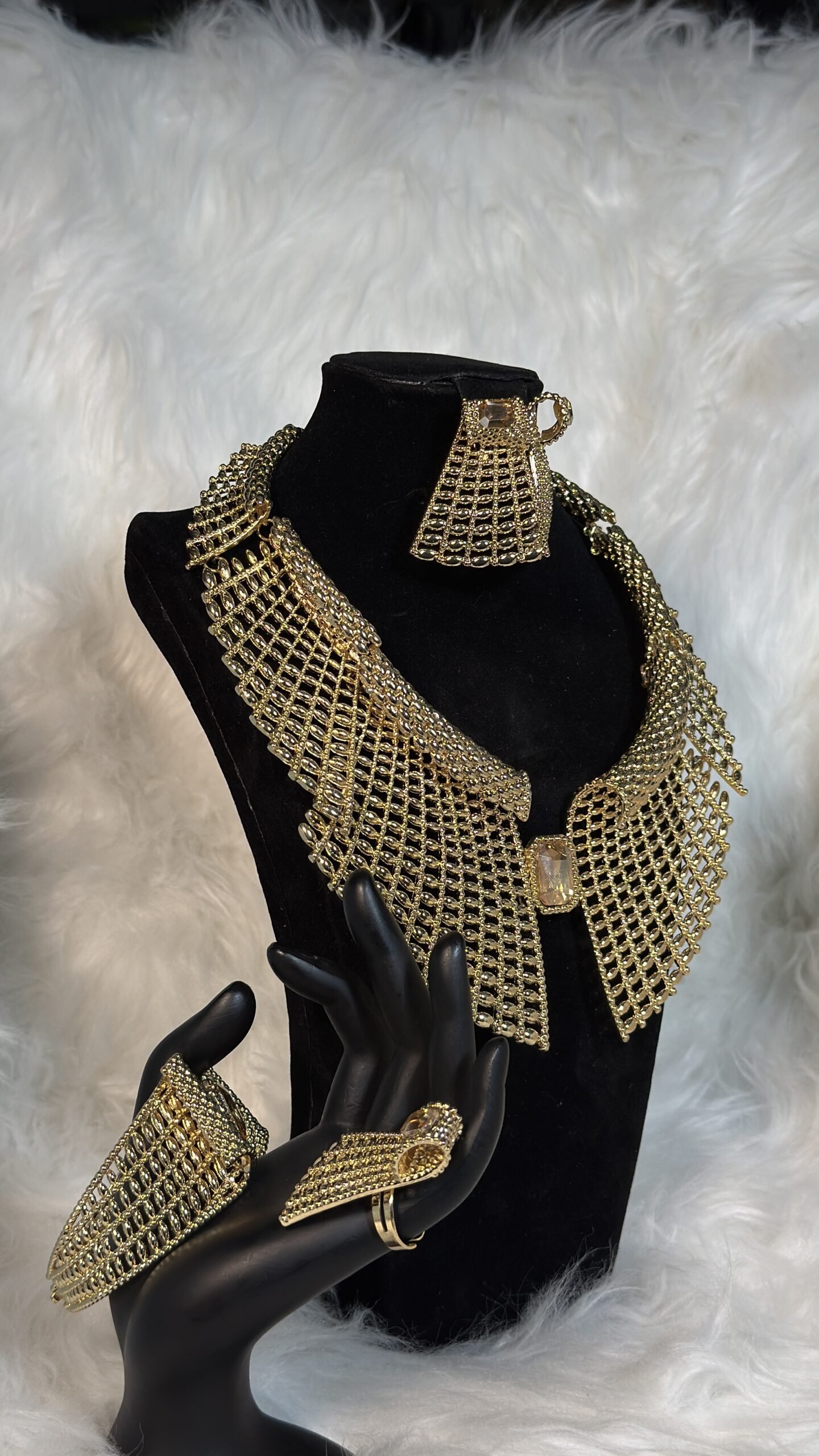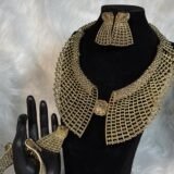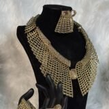 The centerpiece of this set—a golden collar-shaped necklace—brings a modern yet classic flair to your outfit. Its exquisite design complements the bracelet and ring, creating a cohesive look that’s perfect for formal events, special occasions, or as a signature accessory in your daily wardrobe. With bold aesthetics that don’t overshadow subtle refinement, this set caters to both traditional and contemporary tastes, proving its versatility as a must-have addition to your collection.