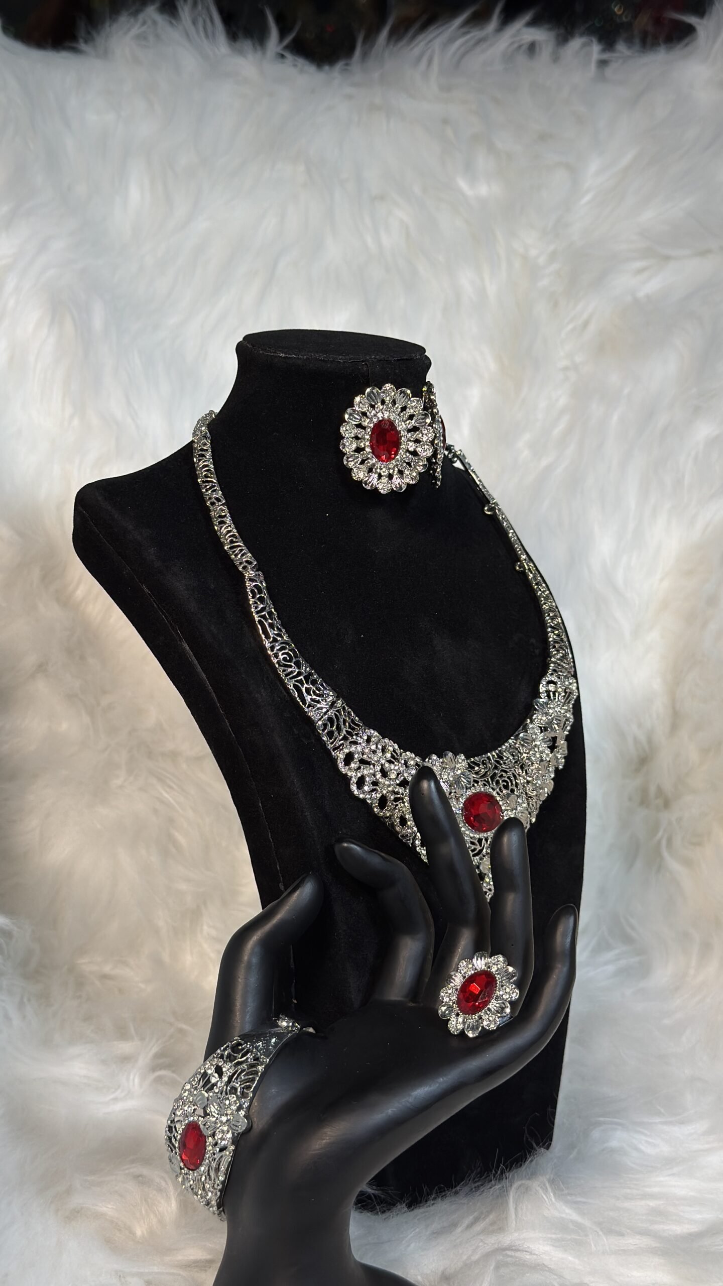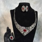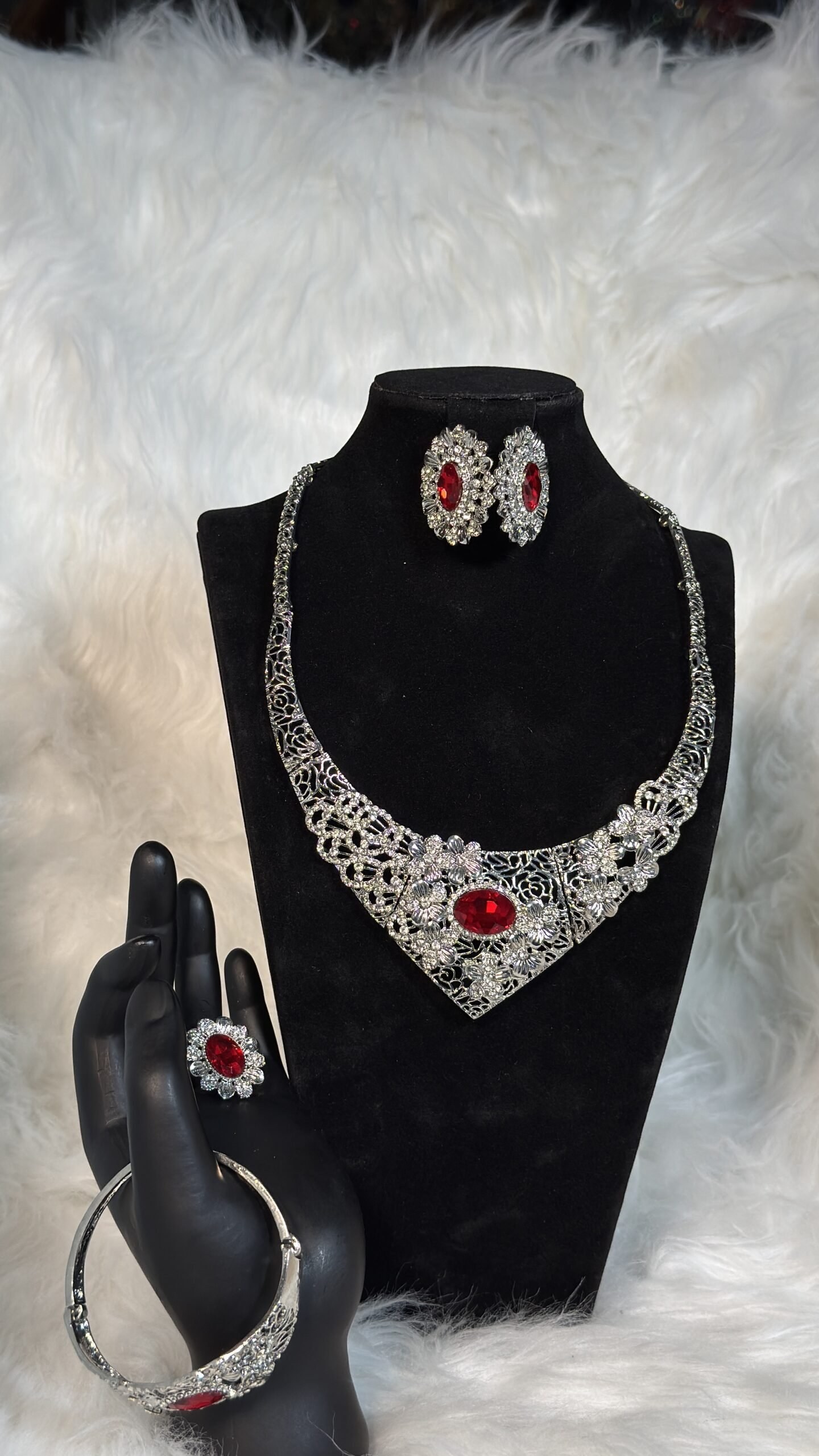 The center of attention in this design is the vibrant red embellished stones that set it apart from conventional jewelry. Each stone is carefully selected and seamlessly incorporated into the Italian-inspired silver framework, creating an alluring contrast that captures attention effortlessly. Complete with matching bangles and ring to create a cohesive look, this set is a celebration of artistry and beauty. Whether you’re dressing up for a formal event or looking to enhance your daily outfit, this immaculate design will complement your unique style with grace.