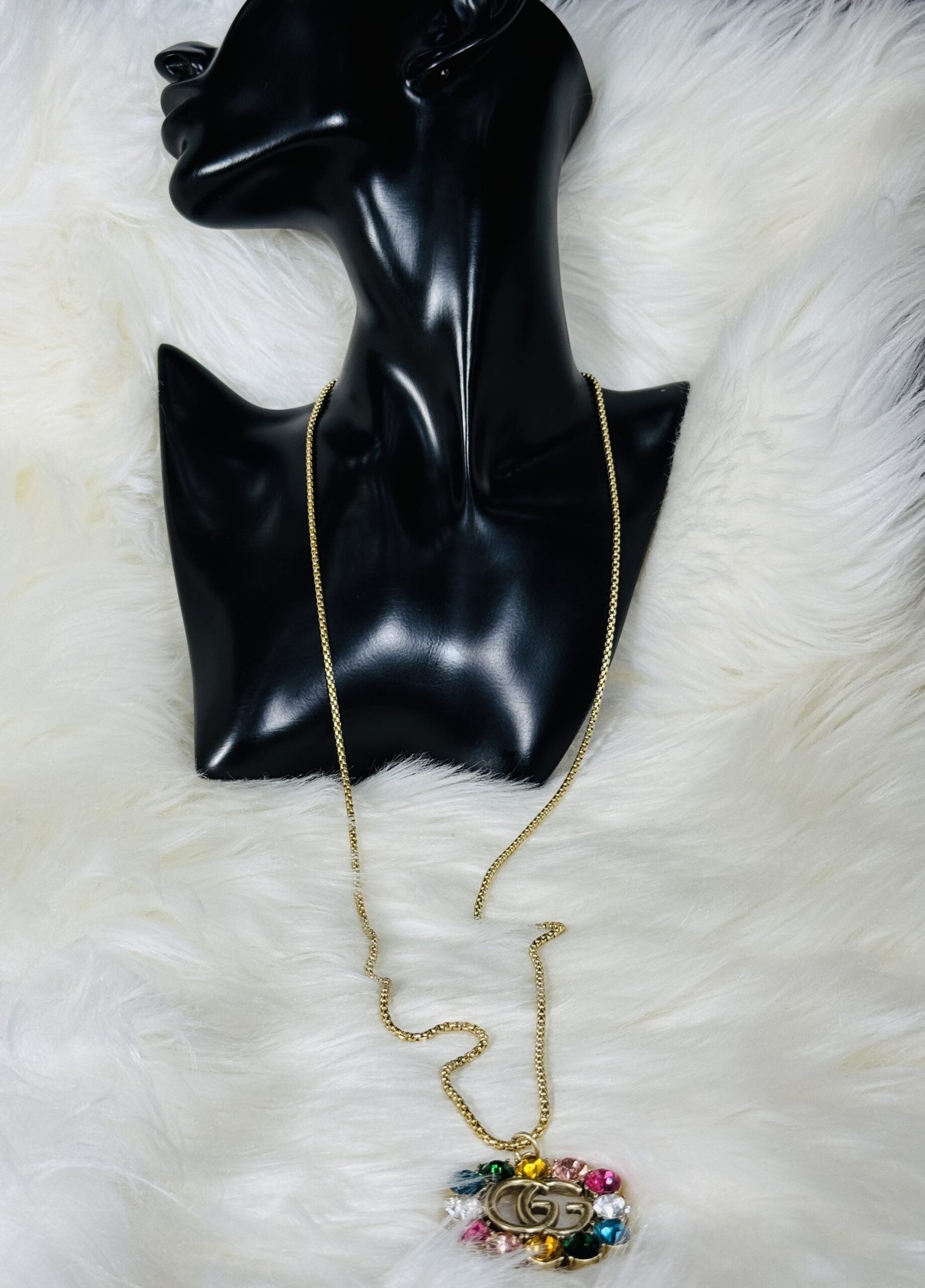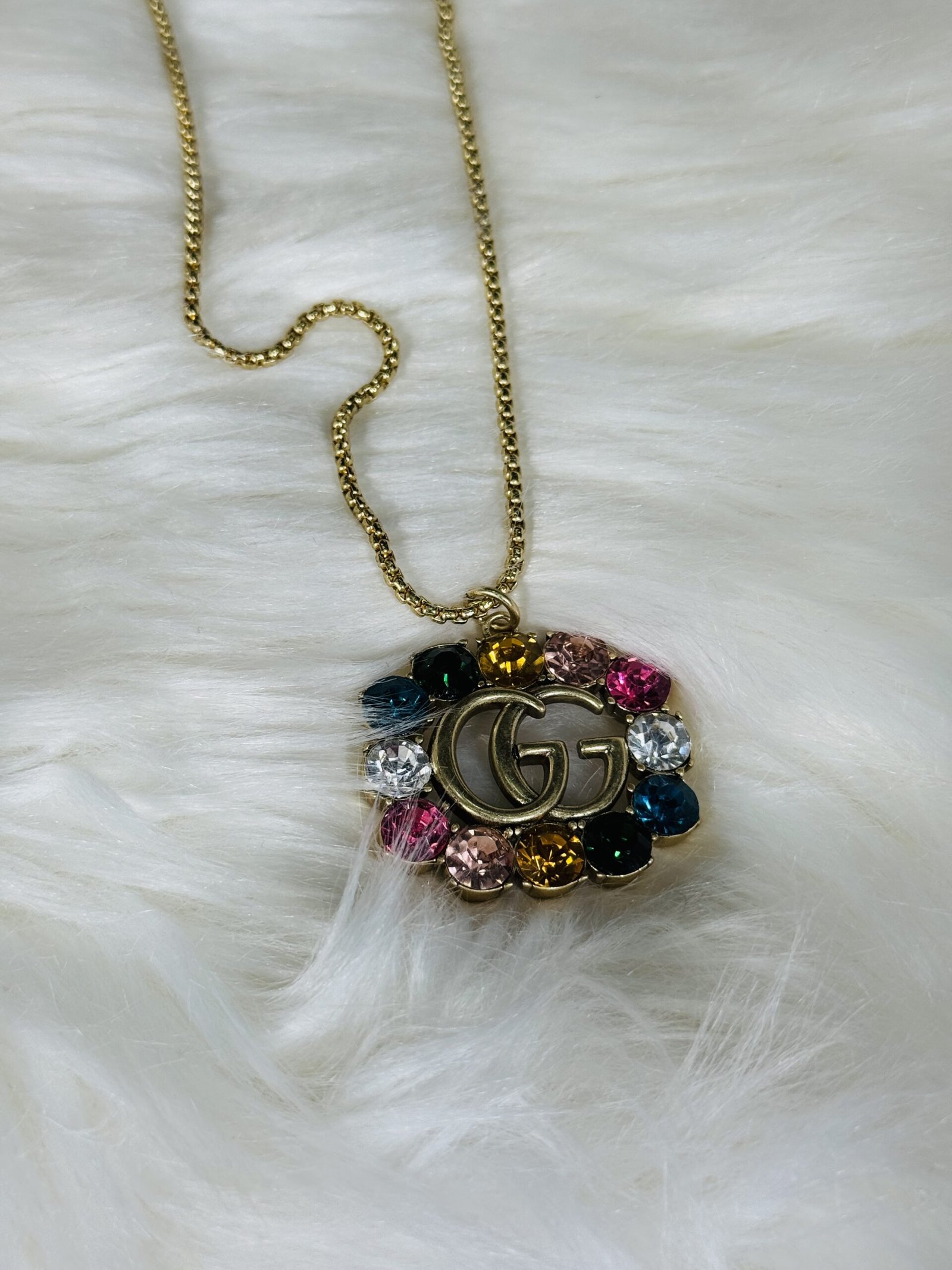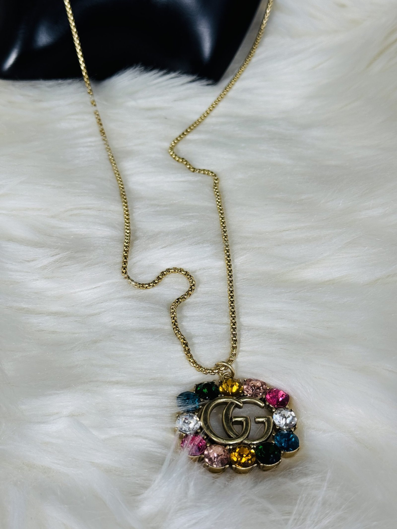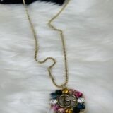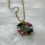The golden GUCCI logo is beautifully embellished with multicolored stones that shimmer with every movement, adding a touch of boldness to this subtle yet striking piece. The vibrant palette of the stones makes the necklace suitable for both casual outings and formal events, ensuring its versatility in your accessory collection.