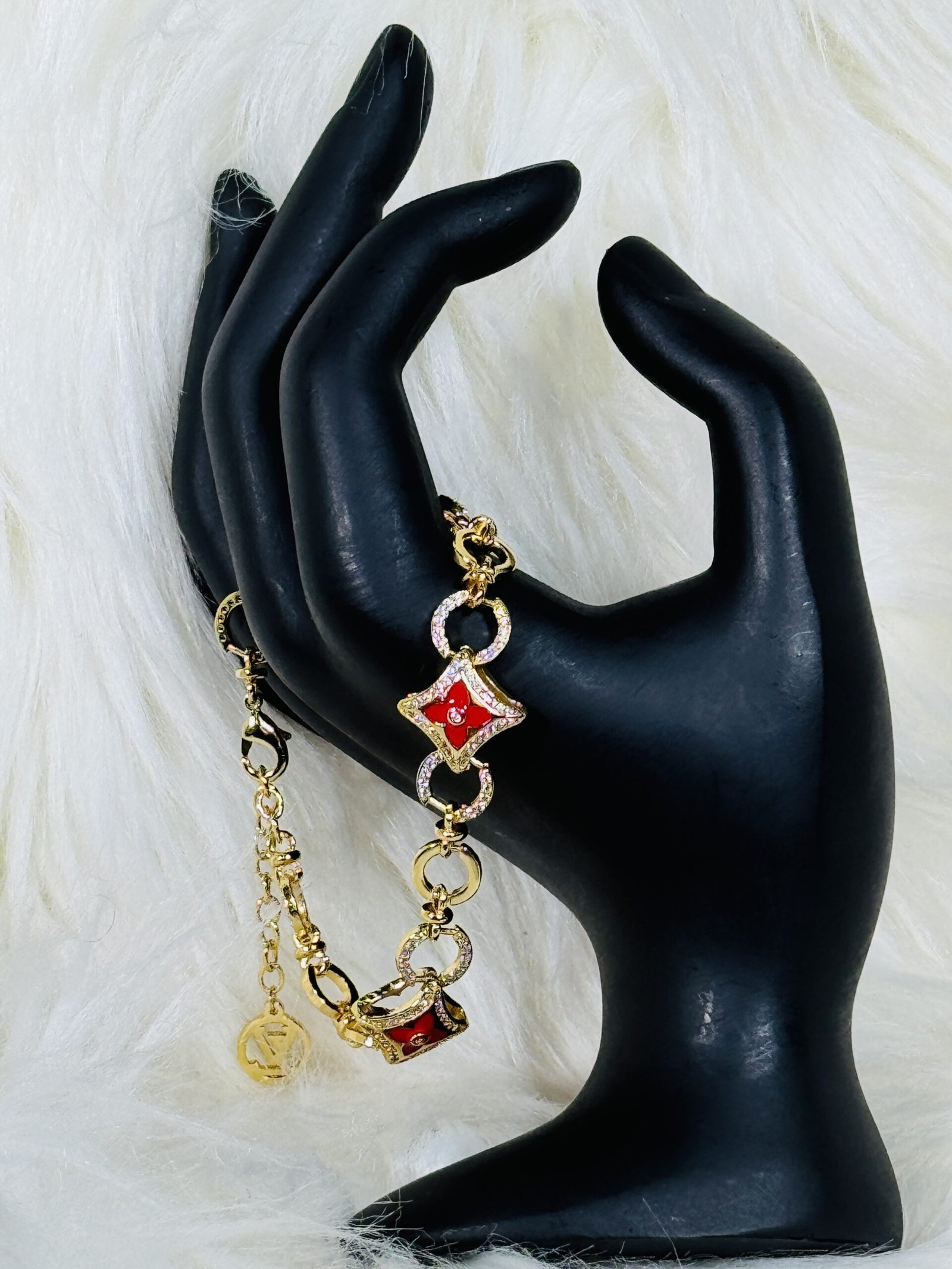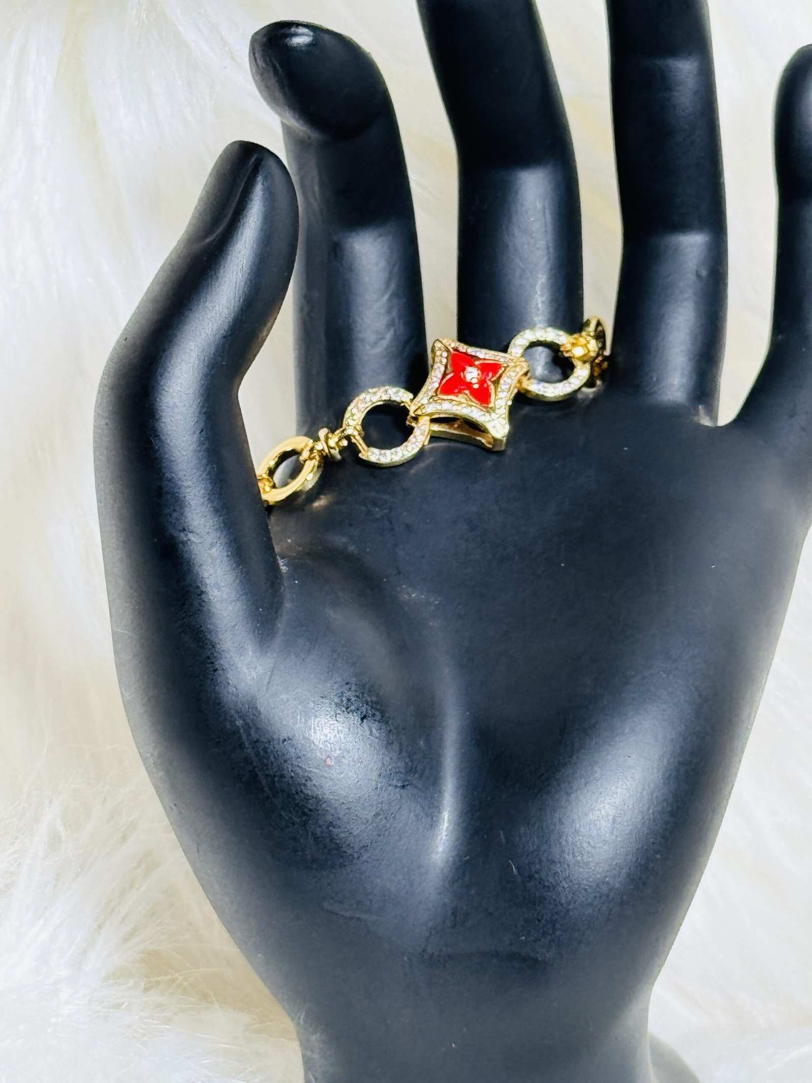 Step into the world of luxury with the Chain Louis Vuitton bracelet featuring exquisite red and gold embellishments. Designed for those who appreciate the finer things in life, this bracelet combines impeccable craftsmanship with bold style. Its chain design ensures comfort and durability without compromising on sophistication, making it the perfect accessory for any occasion.