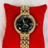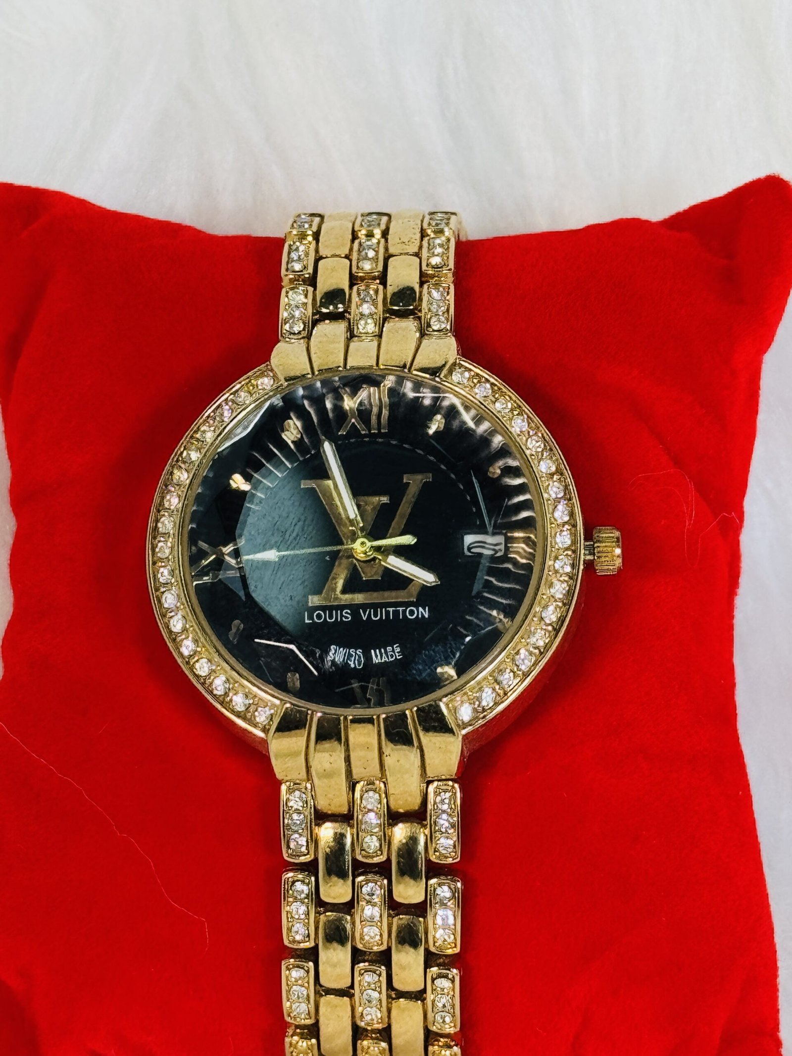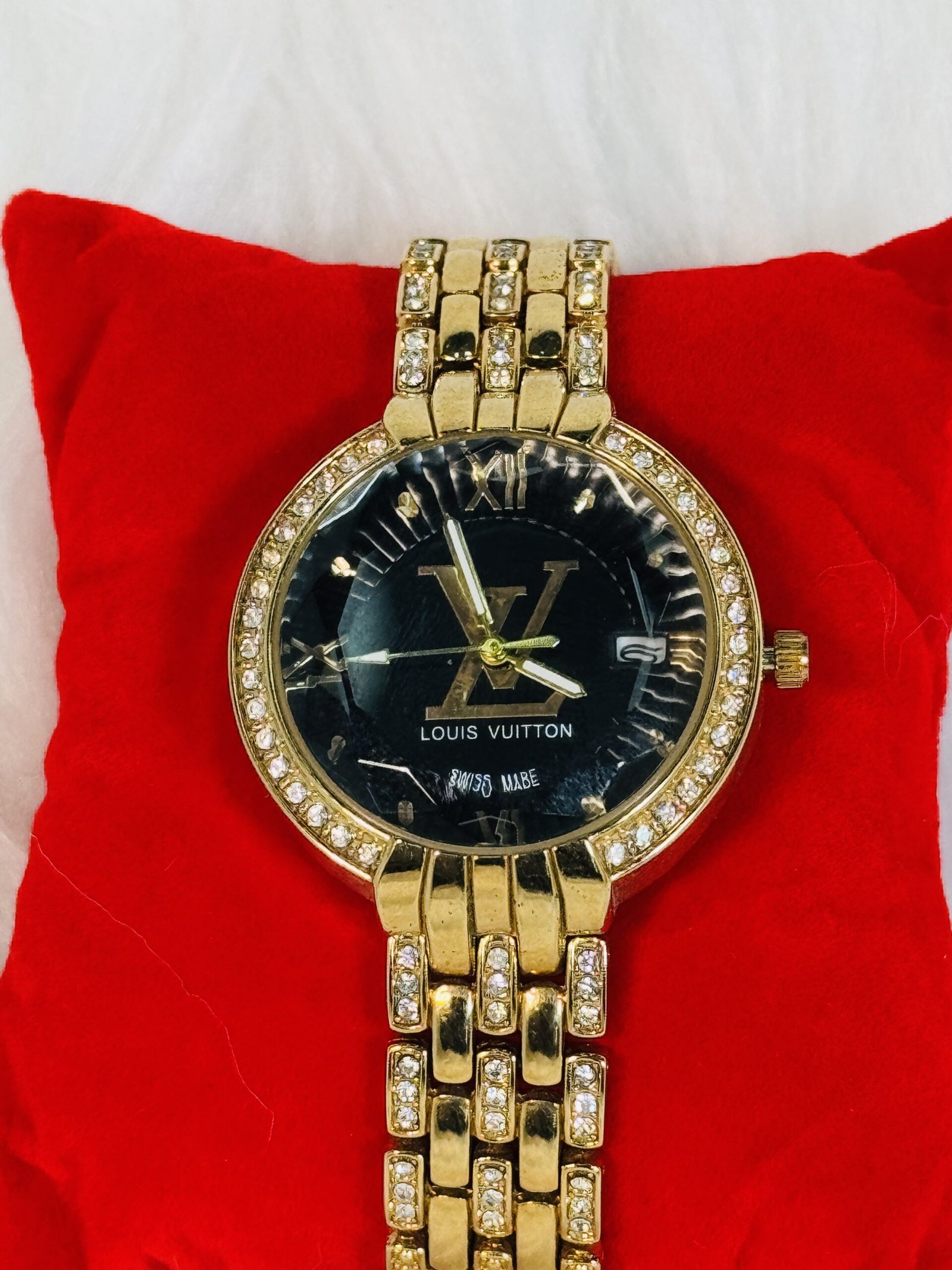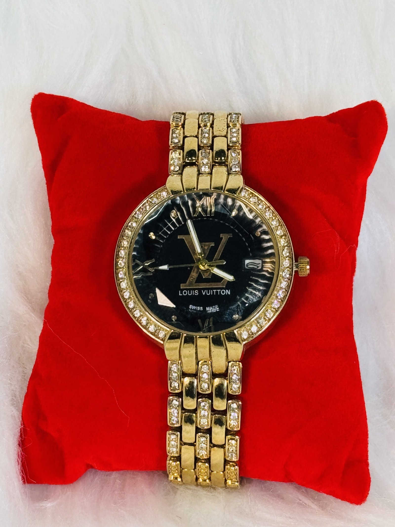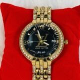 The Louis Vuitton wristwatch showcases a layered, embellished golden strap that exudes timeless glamour. The strap adds depth and texture, making it a unique yet classic element of this watch. The black plain screen serves as the perfect canvas for the refined golden LV inscription, reflecting the brand’s hallmark minimalistic ethos. Complementing the subtle elegance are the partially embellished golden sides, which add a touch of brilliance without overwhelming the overall design. The white rotation hands in medium size ensure effortless time-telling while maintaining the watch’s understated charm. Every detail has been carefully crafted to resonate with those who value luxury and sophistication.