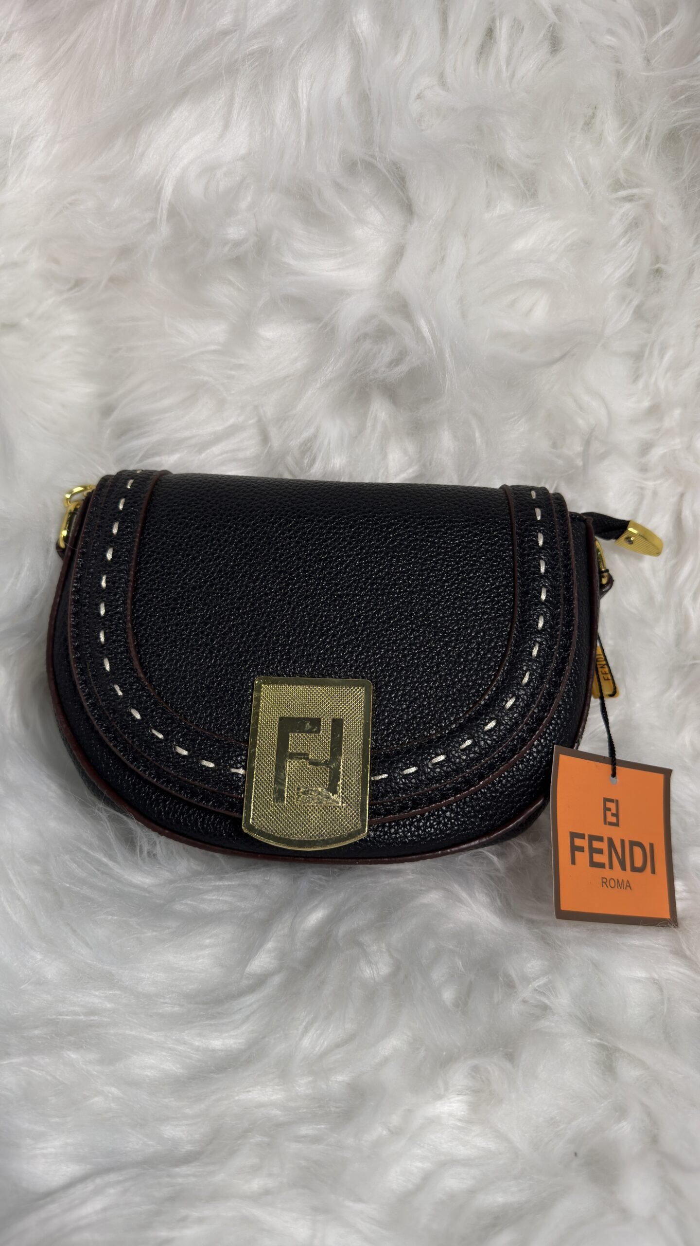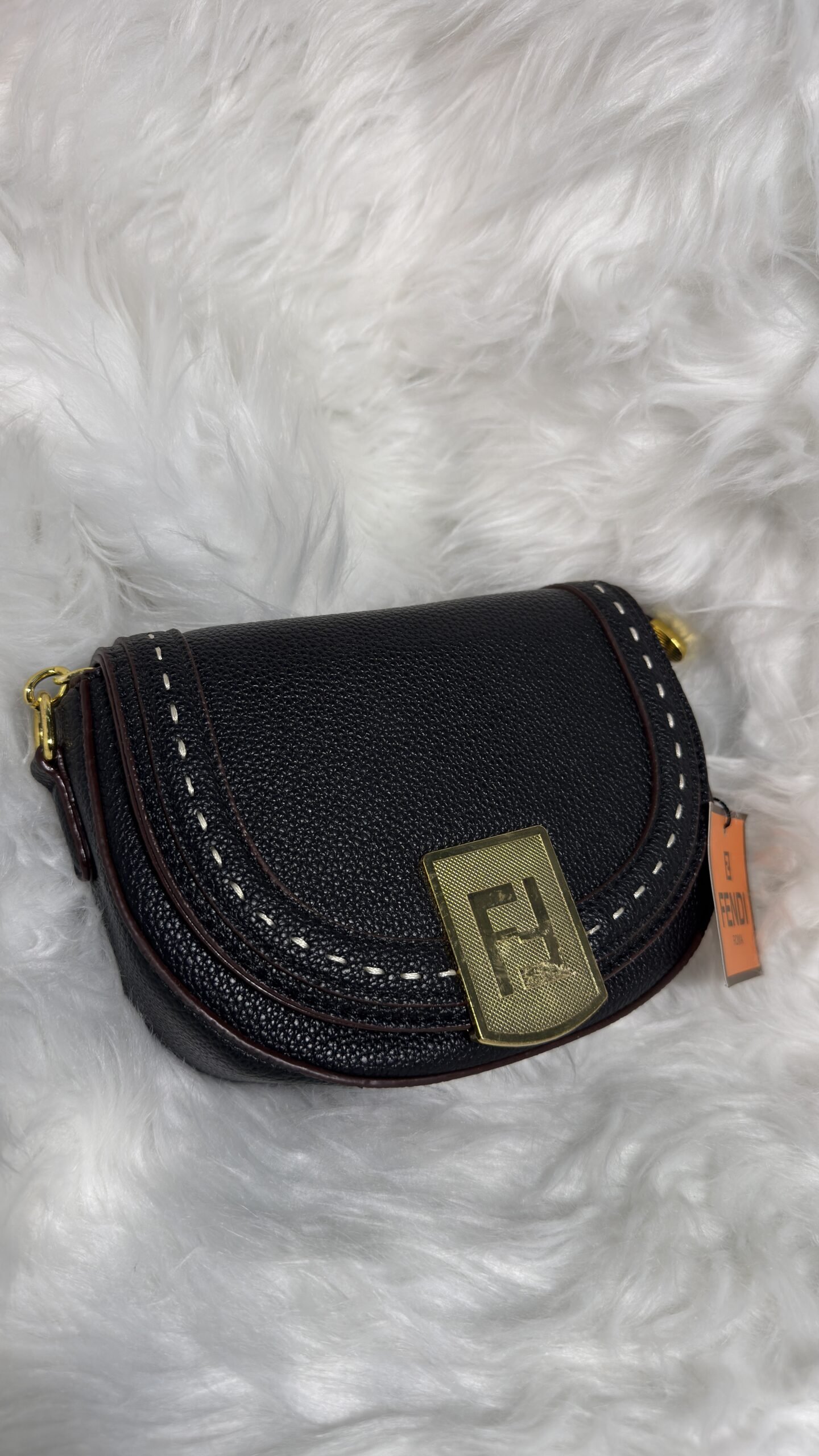 The Mini Fendi Roma Black Bag combines aesthetics with durability. Its expertly crafted black finish exudes opulence and pairs seamlessly with the gleaming bronze handle. Designed for versatility, it is compact yet spacious enough to hold your essentials, making it a reliable everyday companion. This bag embodies Fendi’s legacy of creating premium-quality accessories, promising long-lasting usability and unmatched style. The exquisite detailing reflects the brand’s craftsmanship, ensuring it stands out in your collection.