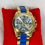 The Michael Kors wristwatch combines luxurious aesthetics with functional durability. The robust big chain strap, crafted in a unique blue and gold finish, provides both comfort and resilience, making it suitable for extended wear without compromising its stunning appearance. From casual outings to evening galas, this wristwatch is designed to withstand the rigors of everyday use while maintaining its impeccable shine and beauty. It’s more than a timepiece—it’s a statement of class.