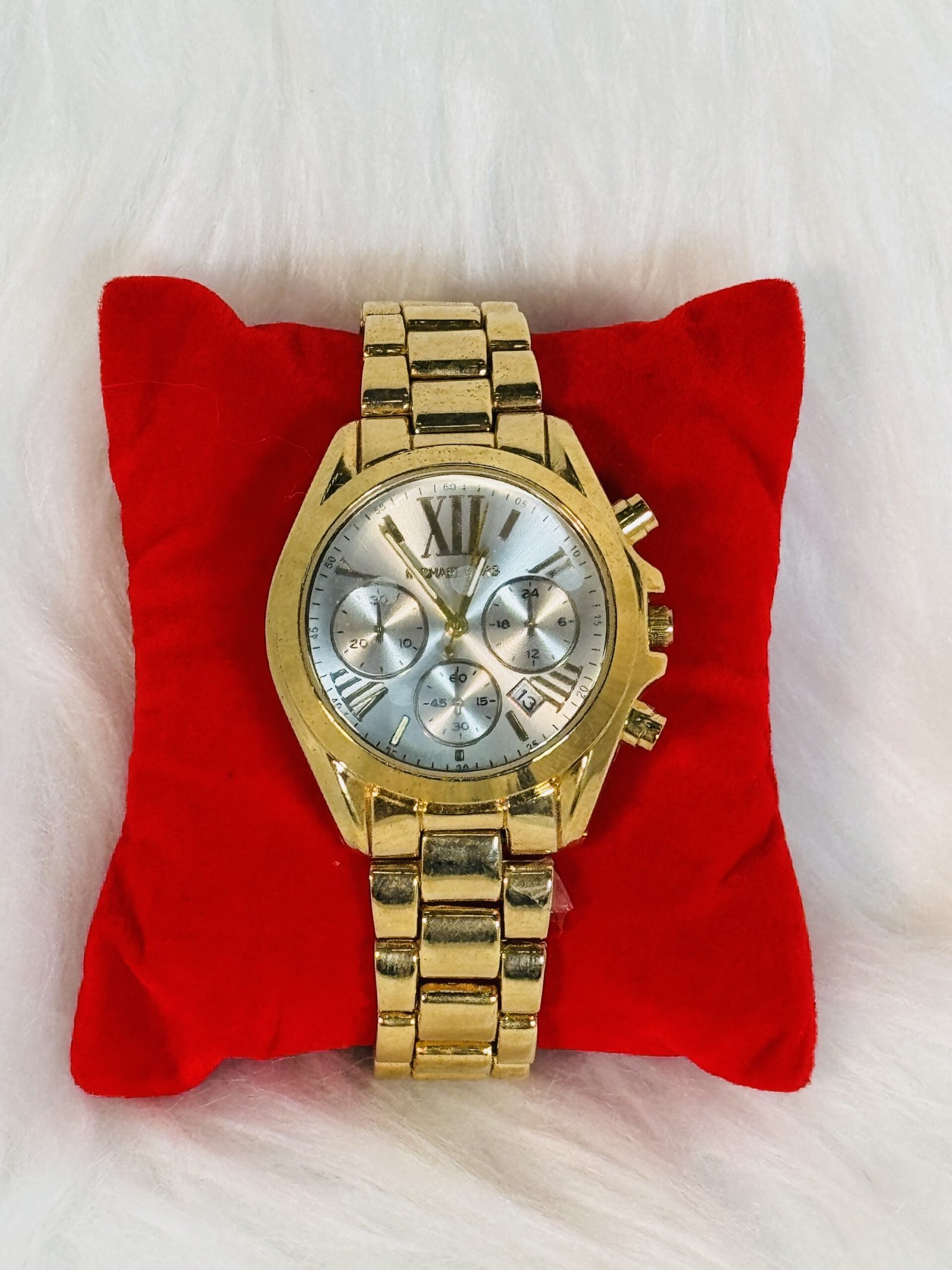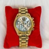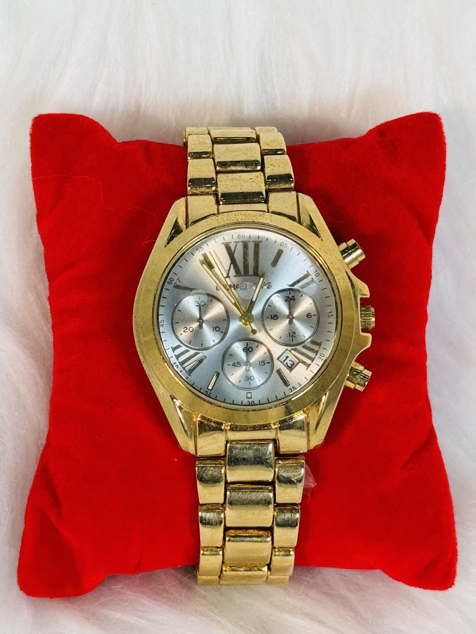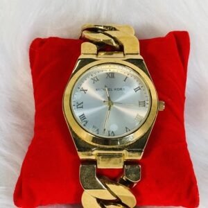 Crafted with precision and attention to detail, the Michael Kors wristwatch guarantees durability and reliability. Its sturdy golden chain strap ensures secure wear while maintaining comfort throughout the day. The engravings on the silver screen are crafted to withstand daily wear, keeping the watch’s charm intact over time. With its combination of practicality and exquisite design, this wristwatch stands as a testament to Michael Kors’ commitment to quality.