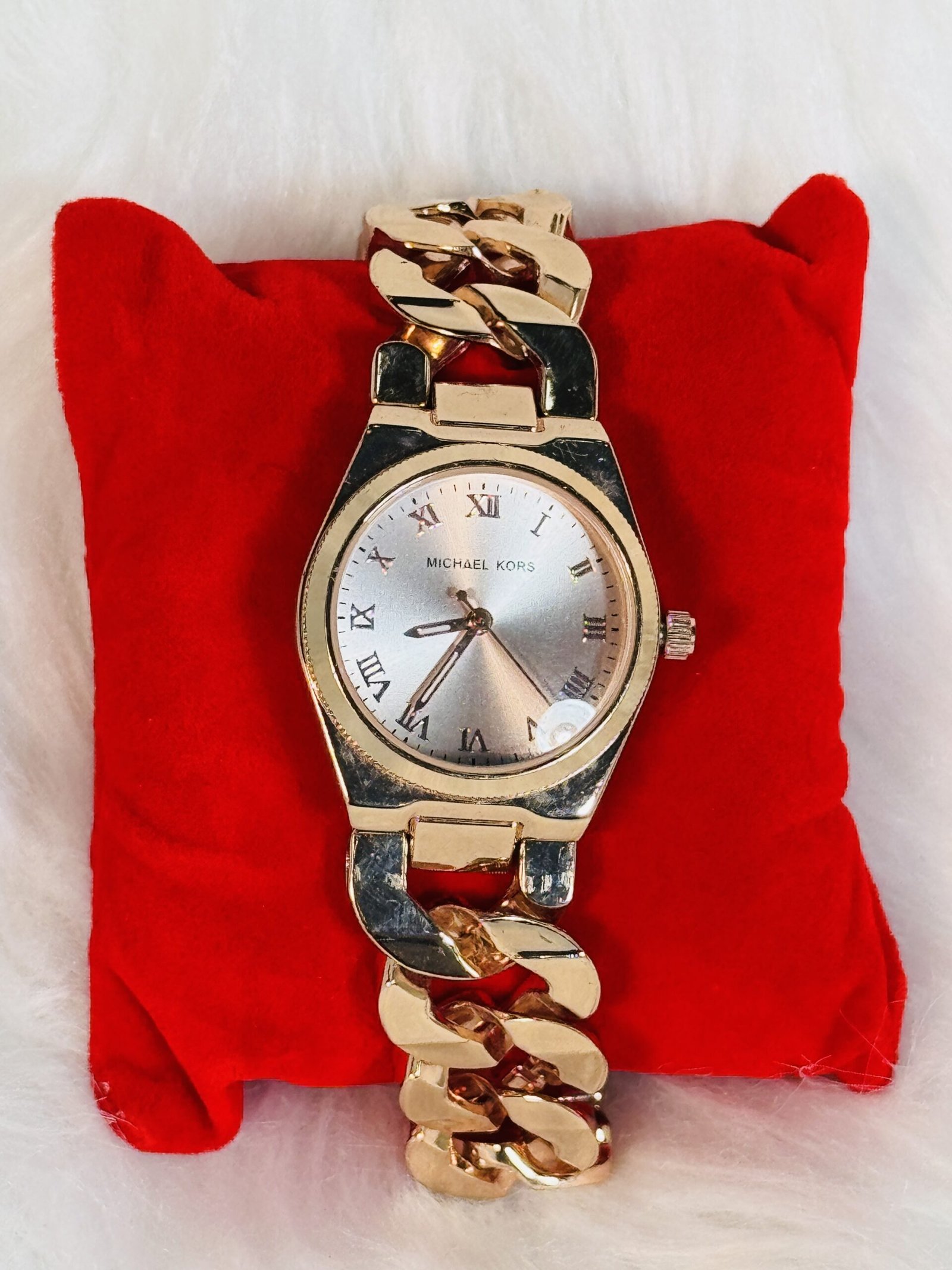 Step into sophistication with the Michael Kors wristwatch, an exquisite accessory that perfectly blends elegance and functionality. Crafted with a heavy rose-gold plain and chain strap, this wristwatch is designed to make a statement while complementing your personal style. Its small size adds a delicate touch, ideal for those who appreciate refined, understated luxury that doesn’t compromise on charm.