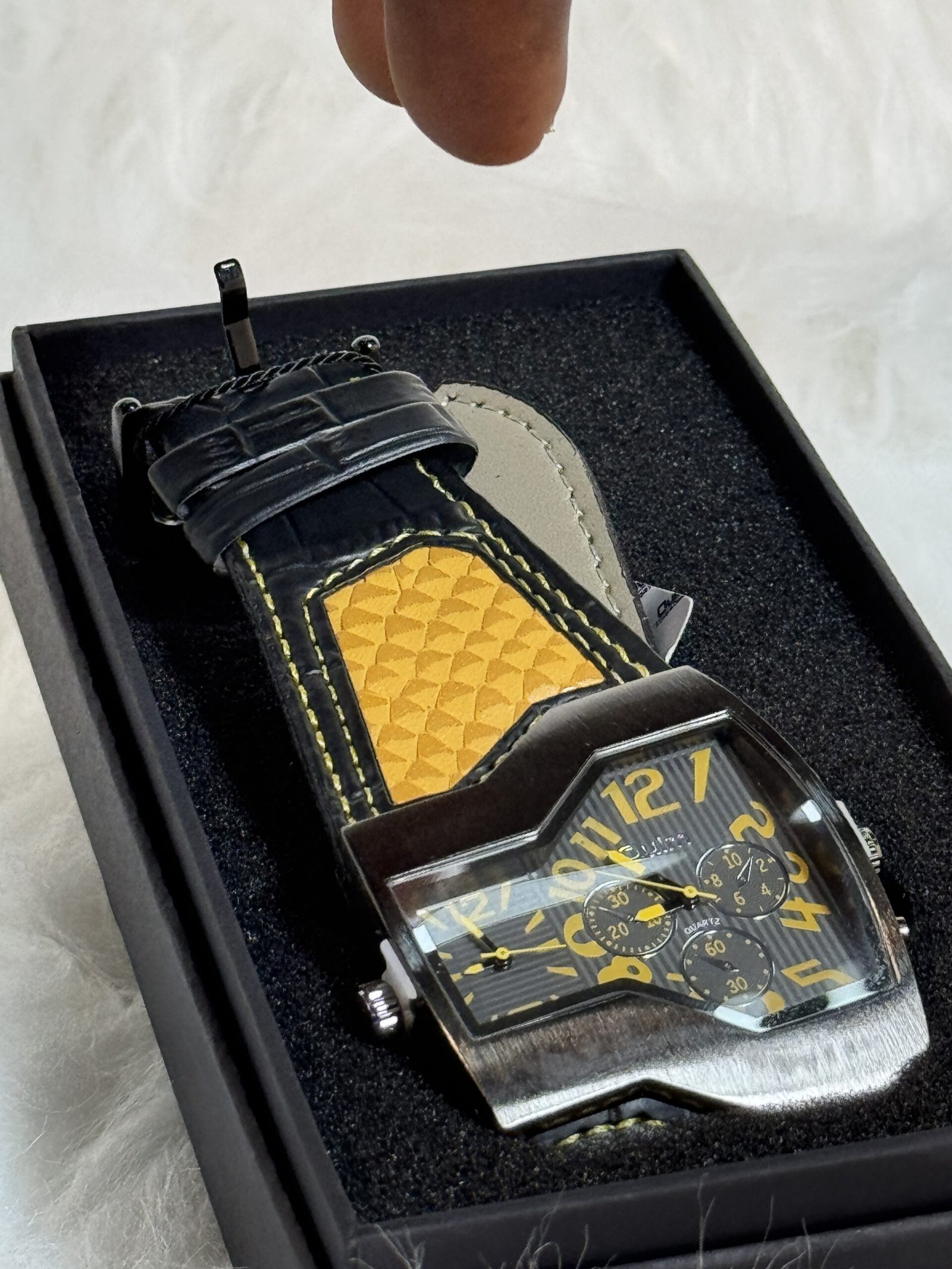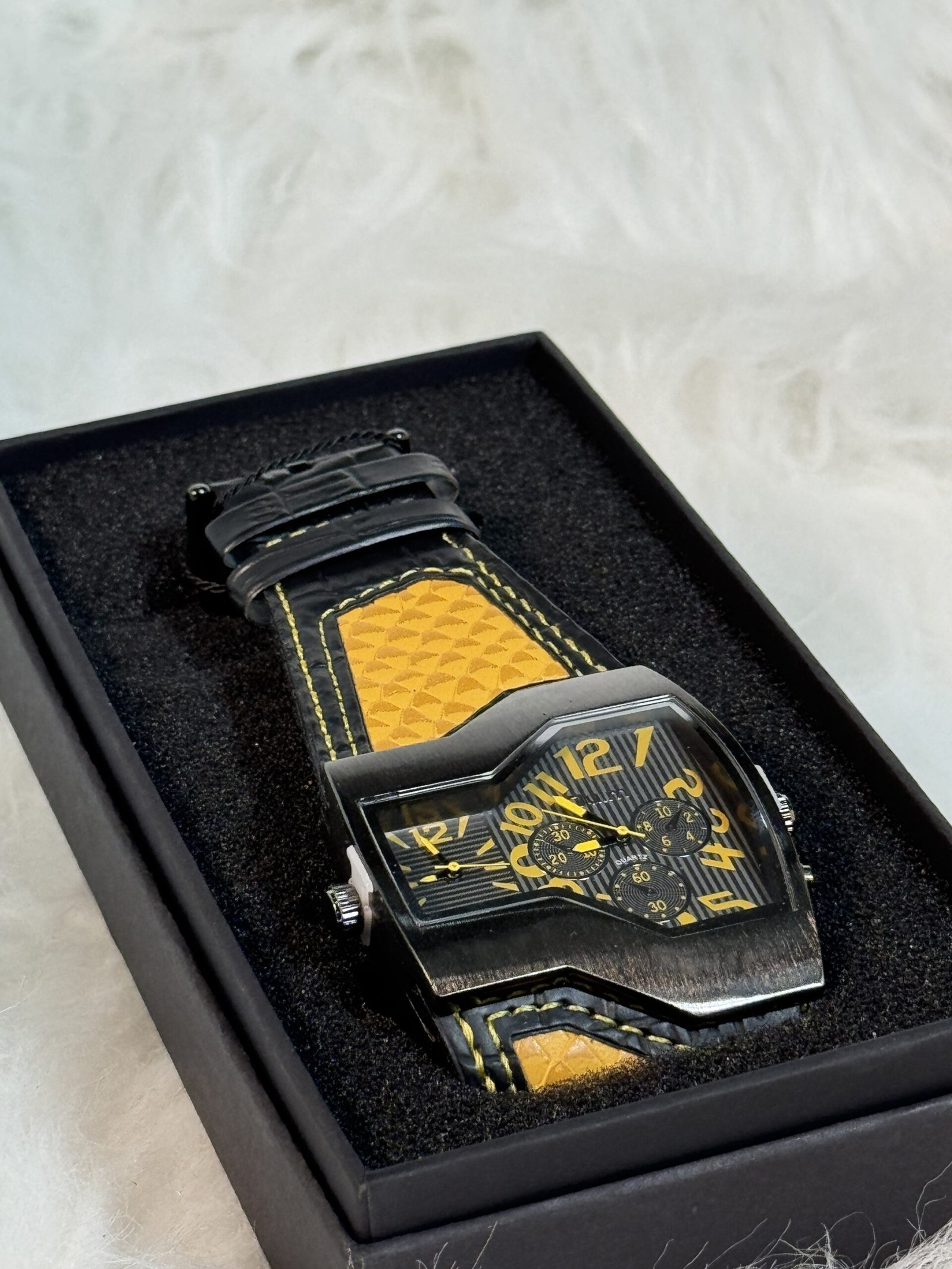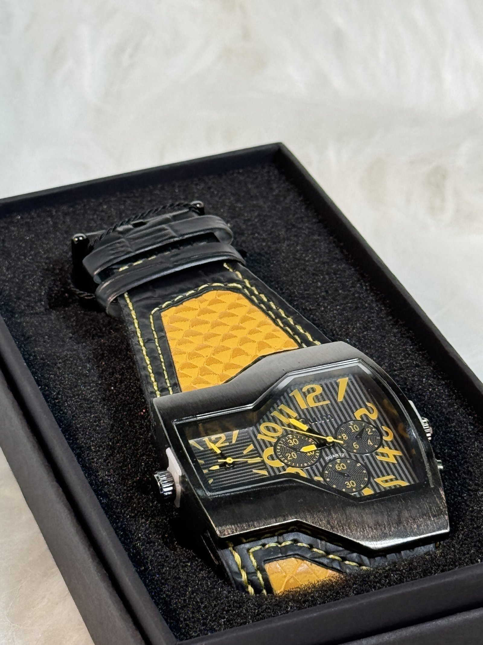 Introducing the Boxed Oulm wristwatch, a timeless accessory designed to elevate your look. With its golden and black leather strap finely engraved for a modern, stylish finish, this wristwatch isn’t just about telling time—it’s about making a statement.