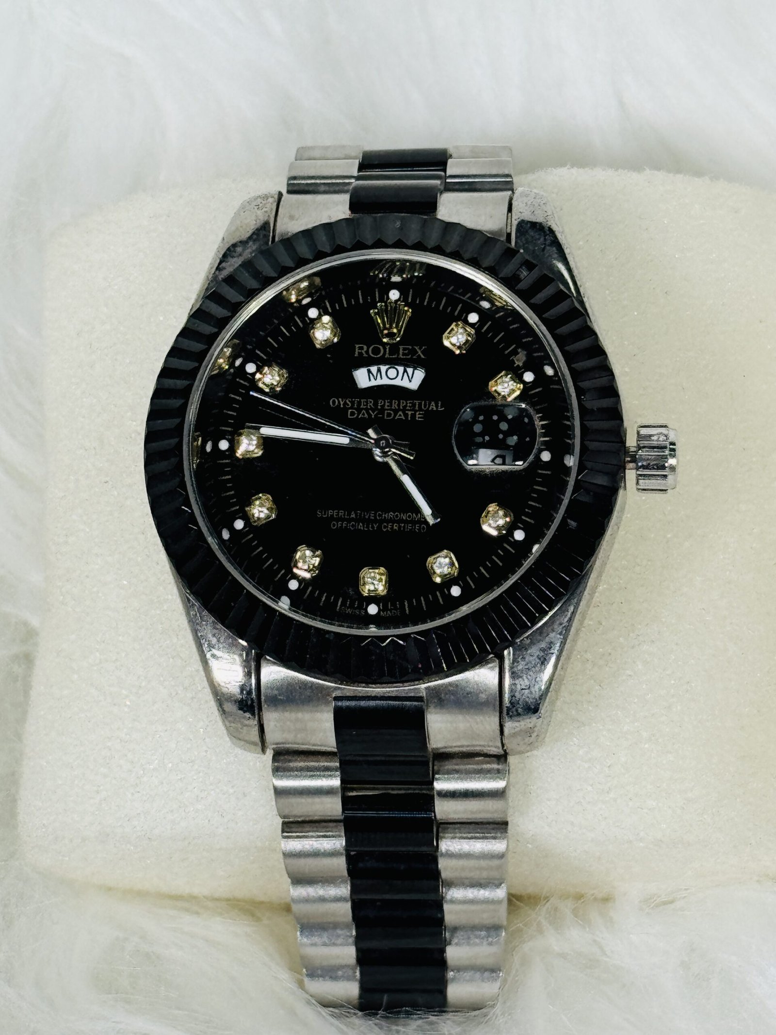 Crafted with a layered black and silver strap, the Rolex wristwatch radiates sophistication from every angle. The strap’s unique layering not only provides visual depth but also ensures a comfortable fit, making it ideal for long-lasting wear. The bold black screen is intricately embellished with golden stone accents, reflecting luxury and refined artistry. Adding to its charm are the white rotation hands, which glide smoothly across the dial, ensuring precise timekeeping and accentuating the watch’s aesthetic appeal.