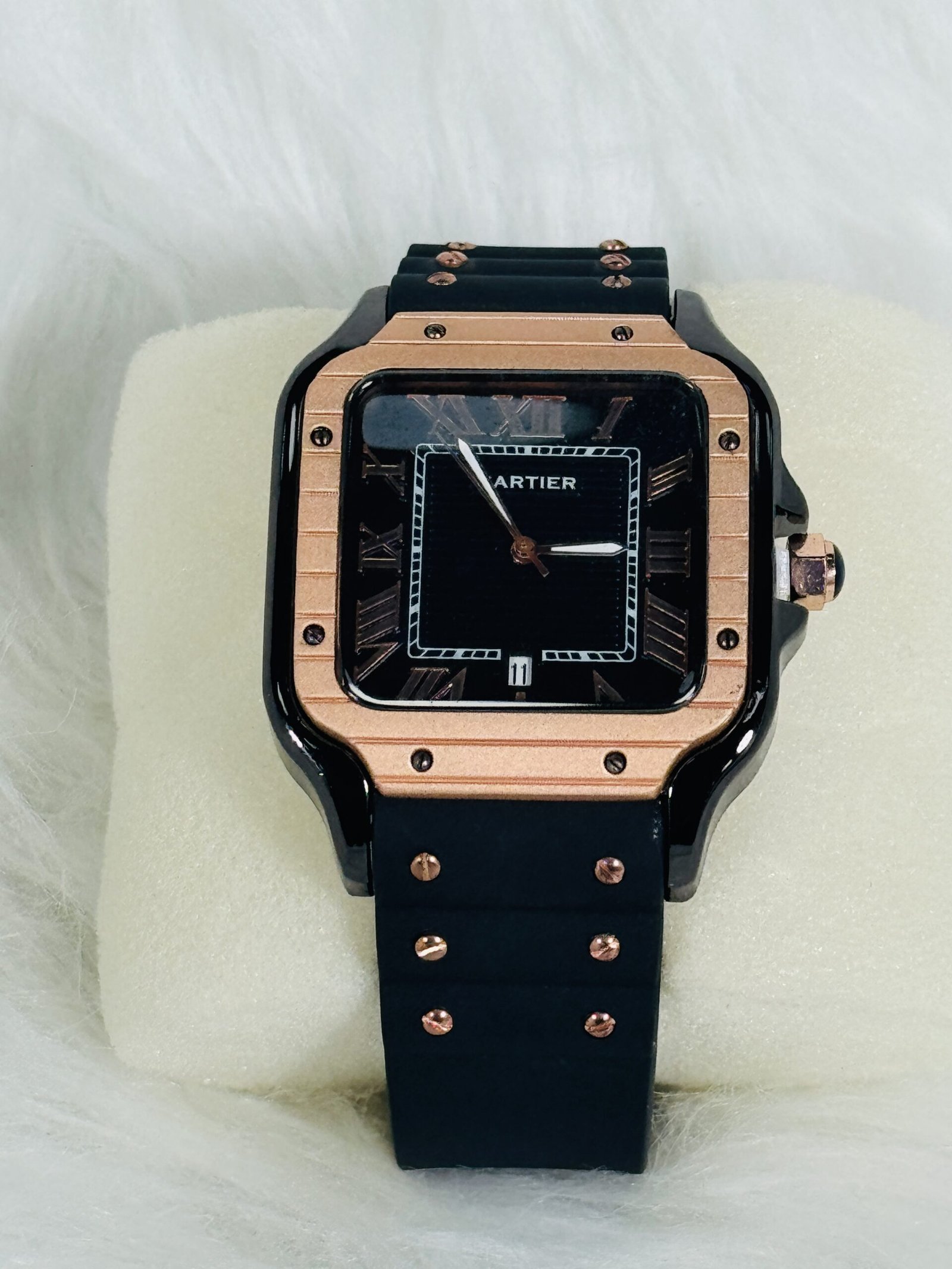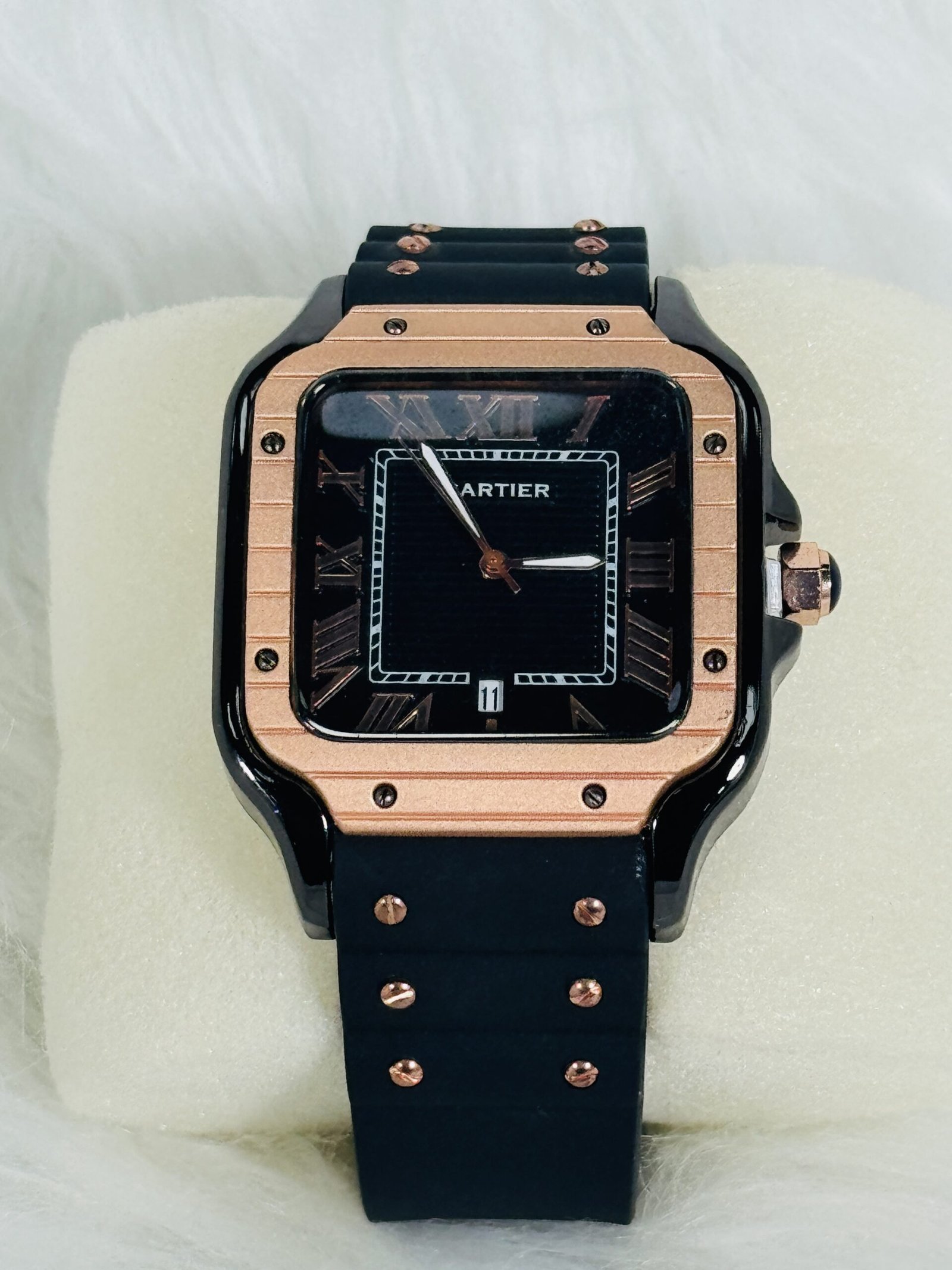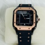 Introducing the black plastic Cartier watch, a masterpiece of modern luxury paired with stunning design elements. This watch embodies timeless excellence, seamlessly blending functionality with unmatched elegance. The rose-gold stones embellishing the sleek black plastic frame create a refined contrast, ensuring that this accessory stands out, no matter the occasion.