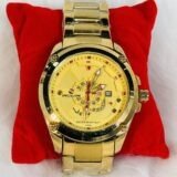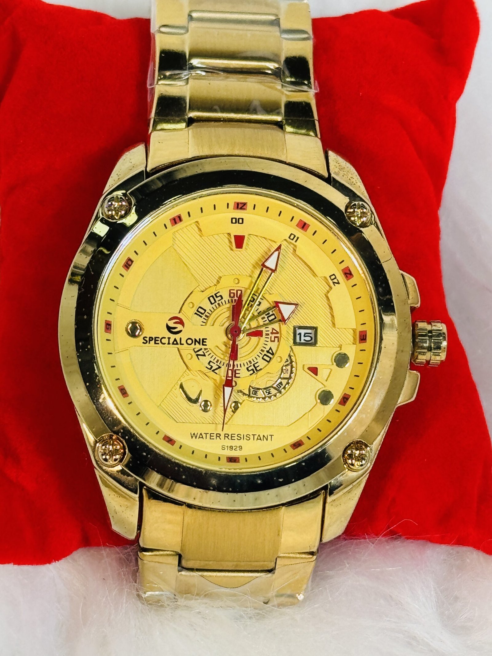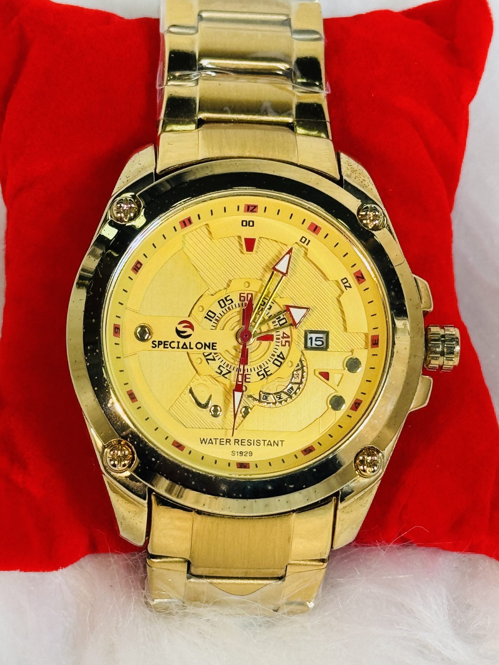 What sets the Special One Wristwatch apart is its finely detailed golden screen adorned with elegant red engravings. These intricate, subtle motifs add a touch of vibrancy, creating a captivating contrast against the gold backdrop. The rotating hands ensure precision and complement the watch’s polished golden sides for a cohesive, opulent design. It’s a true testament to artistry and meticulous attention to detail that transforms this wristwatch into both a timepiece and a fashion statement.