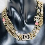 What sets this necklace apart is its exquisite detailing. Adorned with soft pink accents and lustrous pearl embellishments, the combination evokes a sense of grace and charm that complements the warm, golden tones of the chain. The pink detailing introduces a hint of playfulness, while the pearls radiate sophistication, making this versatile piece suitable for a variety of occasions.