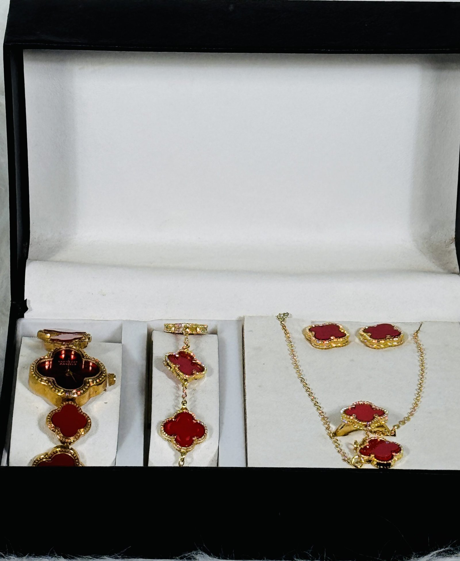 The Van Cleef red jewelry set includes a wristwatch, bracelet, necklace, fashion ring, and two matching earrings, each crafted to complement the other. The vibrant red tones are striking yet refined, making this set an ideal choice for both formal gatherings and casual outings. Each piece of this set has been carefully designed to celebrate individuality while maintaining a cohesive aesthetic. The bracelet and wristwatch are perfect for creating understated elegance, while the necklace, ring, and earrings add a dramatic flair to complete your look.