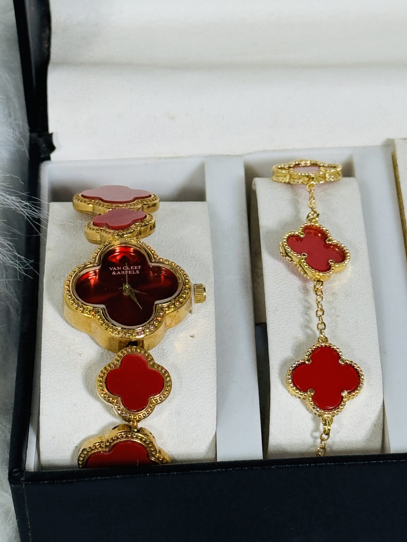 Crafted with meticulous attention to detail, the Van Cleef red jewelry set boasts superior craftsmanship that ensures durability and lasting shine. The timeless red hue paired with its chic design ensures versatility, allowing you to pair the jewelry pieces effortlessly with a variety of outfits. Whether you’re dressing up in evening wear or adding charm to your office attire, this set seamlessly adapts to your unique style. Additionally, the watch adds both functionality and sophistication, making it a practical yet stylish addition to your collection.