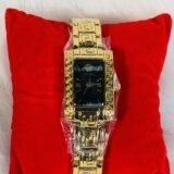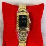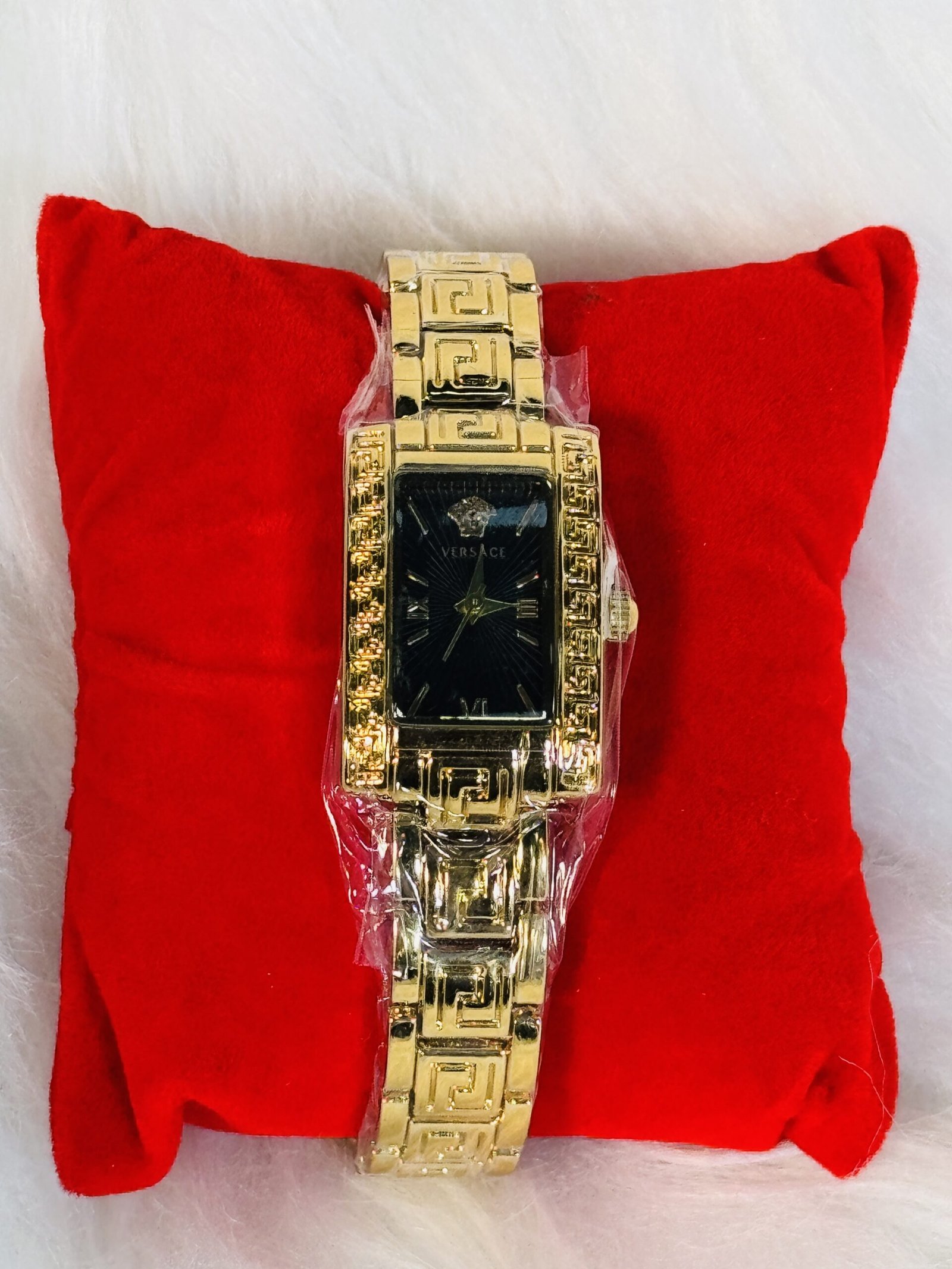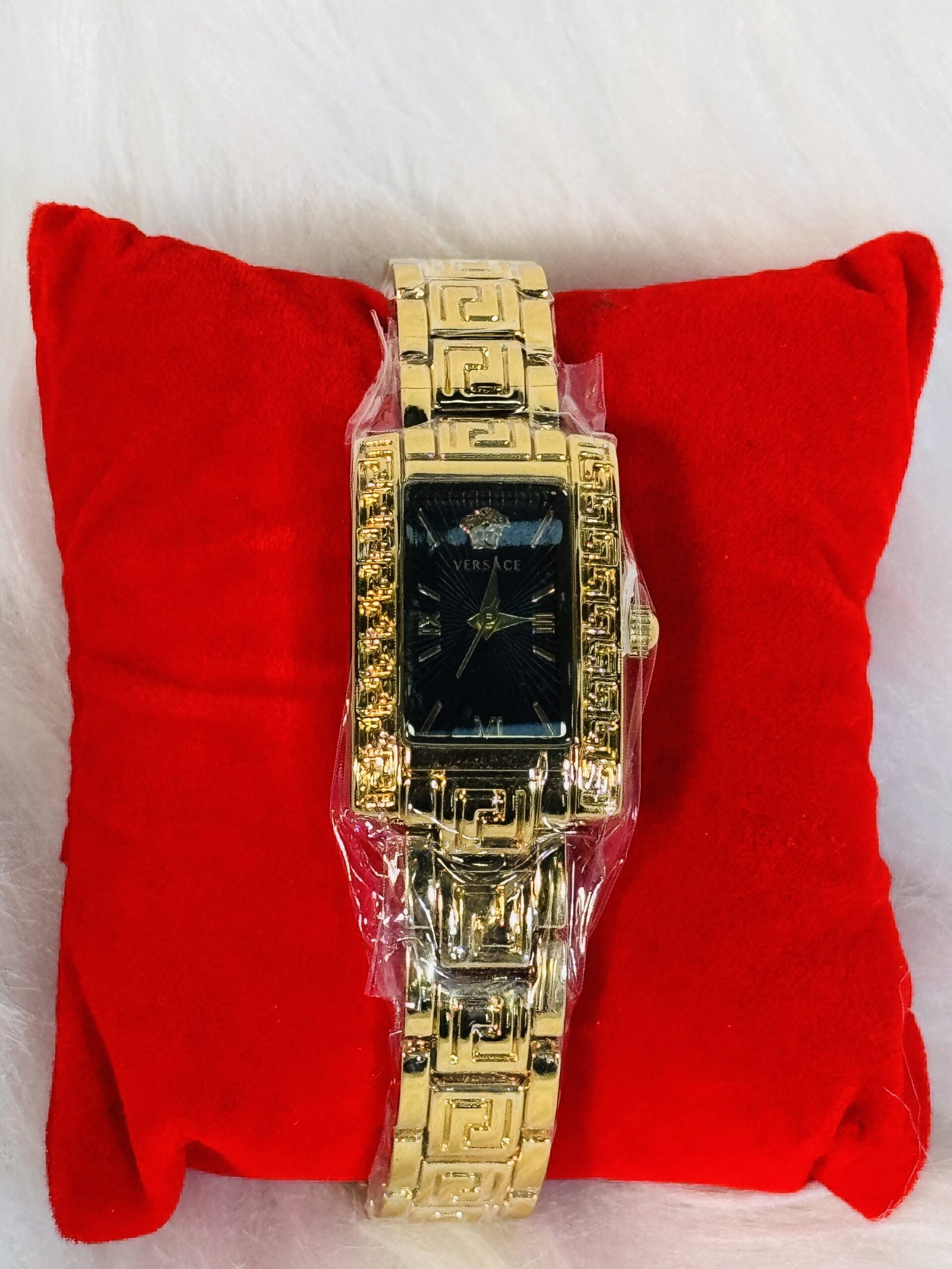 The Versace wristwatch is a masterpiece of design and craftsmanship. Its small golden chain strap is delicately designed to fit comfortably on your wrist, offering both durability and elegance. Meanwhile, the golden rotation hands glide seamlessly across the black screen, ensuring precision in timekeeping. The bold golden sides, complete with Versace’s signature aesthetic, elevate the watch’s overall look, making it the perfect choice for individuals who appreciate enhanced sophistication in their accessories.