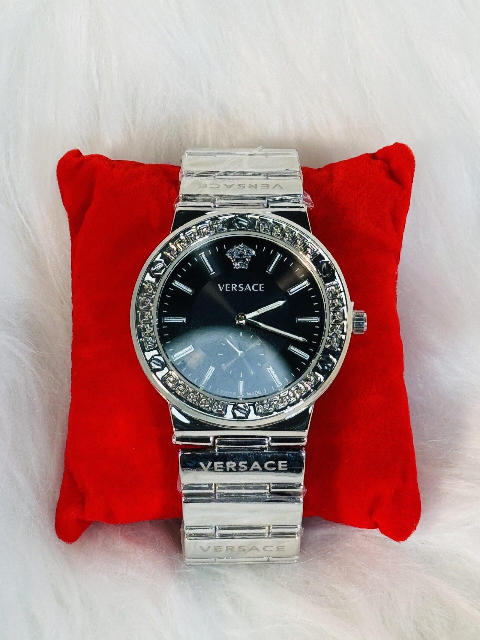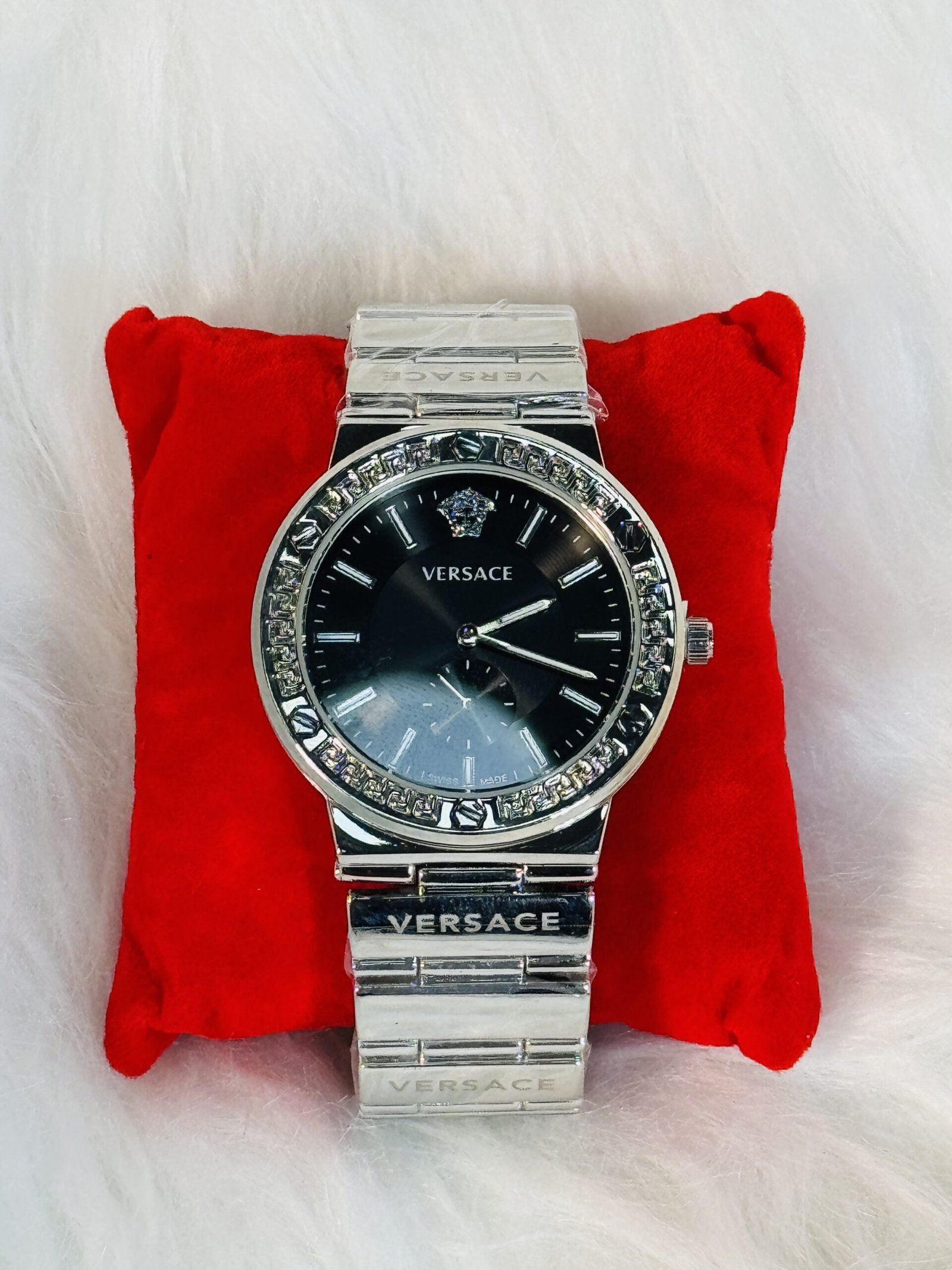 The silver rotation hands glide effortlessly across the engraved face, combining aesthetics with functionality. This ensures easy readability while echoing the brand’s commitment to precision and luxury. Whether you’re gifting it to someone special or treating yourself, this Versace wristwatch is an embodiment of timeless appeal and meticulous craftsmanship.